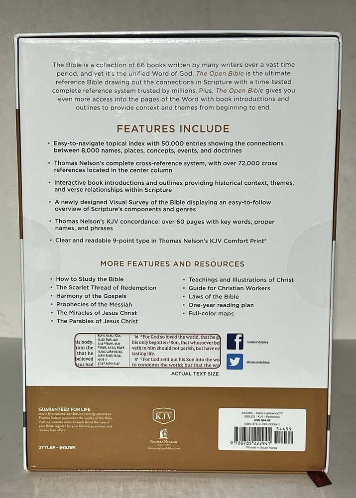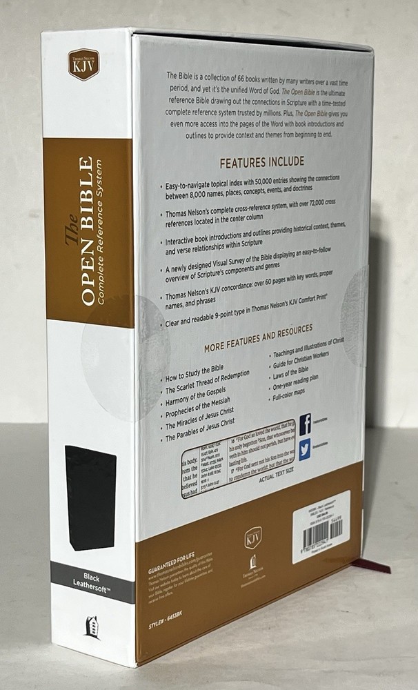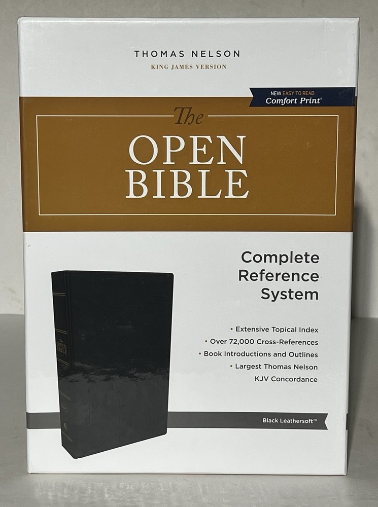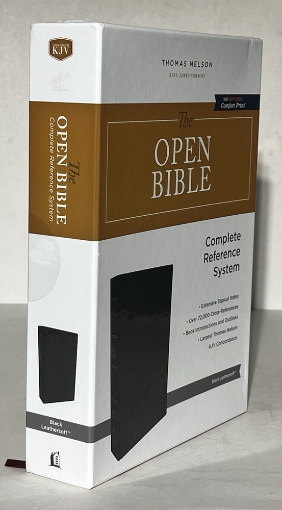 Thomas Nelson The KJV Open Bible: Complete Reference System, Black Leather Bound ***NEW SEALED*** ***ALL PURCHASES FROM THE UNITED STATES & CANADA INCLUDES FREE SHIPPING*** Dive into the timeless wisdom of the Thomas Nelson The KJV Open Bible: Complete Reference System, beautifully bound in black leathersoft. This Bible is an essential resource for both personal reflection and scholarly study, equipped with features that enhance your reading and reference experience. The classic leather binding exudes a sense of durability and elegance, making it a worthy companion for your daily journey through scripture. This edition, released in 2019, includes a variety of reference tools that make navigating the complexities of philosophy and spirituality easier. It's designed with a modern 257mm height and 181mm length, ensuring a comfortable hand-held reading experience. Whether for display or private reading, this Bible fits seamlessly into any space or bookshelf, awaiting your discovery of its wealth of knowledge.
