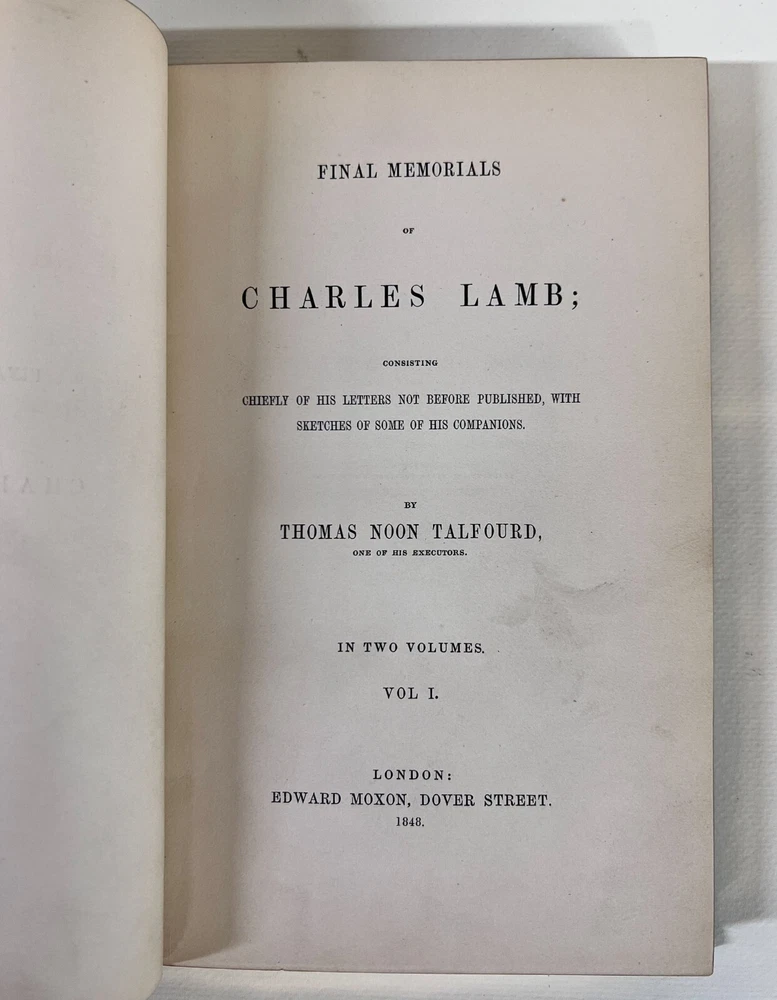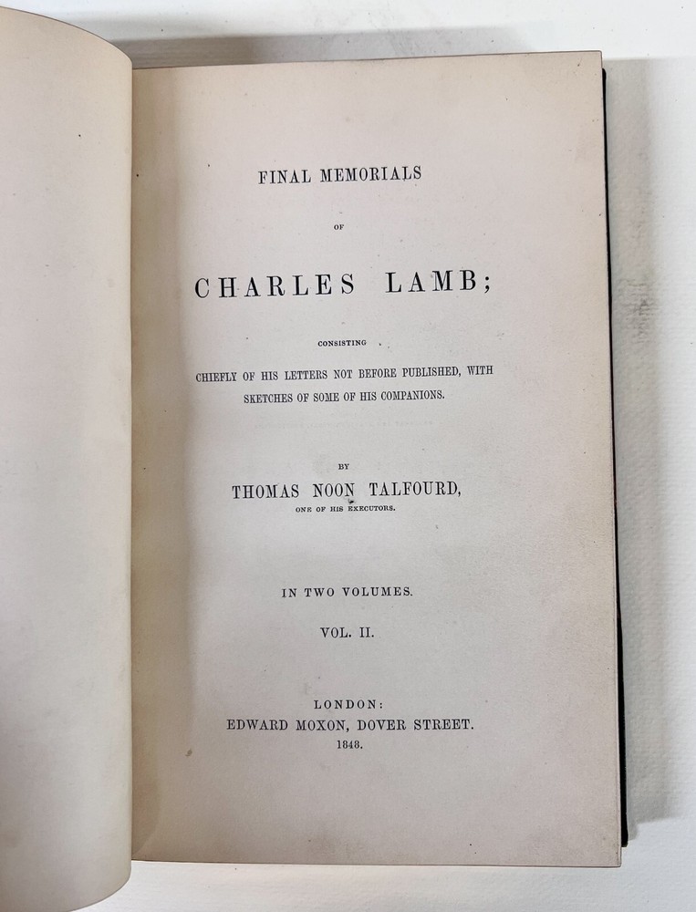 Description : Thomas Noon Talfourd, Final Memorials of Charles Lamb Consisting Chiefly of his letters not before published, with sketches of some of his companions. In two volumes. Half green morocco on marbled boards, gilt titles on spine, raised bands, marbled end papers, all gilt edges. Bound by L Broga. Published Edward Moxon London 1848. Approx. Measurements: 5.25 x 7.875 x 2 inches Condition: Very good condition, rubbed, bumped corners, edgewear. pencil notations. Scattered pen notations. PHB1707 sch We have a fine selection of quality items for sale at Amphora Art & Antiques. International as well as domestic customers are welcome - please contact us with questions regarding shipping or listings, and we will assist you quickly. All items can be inspected in-person or are available for pickup from our large Wilmington, CA warehouse with no additional fee or charge. The authenticity of all items listed are guaranteed to be as represented - all efforts are taken to ensure accurate and descriptive condition reports and photographs. We reserve the right to use another shipping carrier other than what is listed to ensure your purchase arrives safely. Fedex cannot ship to a P.O. Box. Please contact us before or upon purchase if you have a preferred shipping carrier.