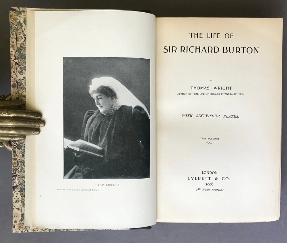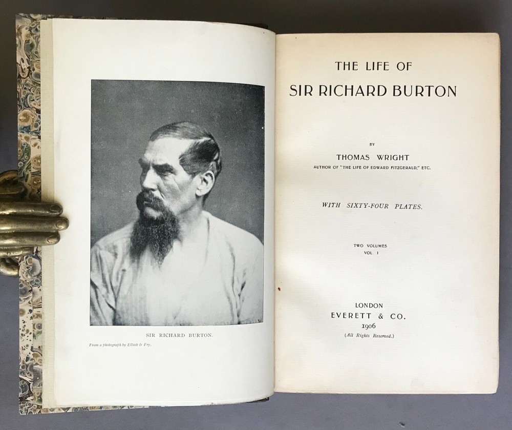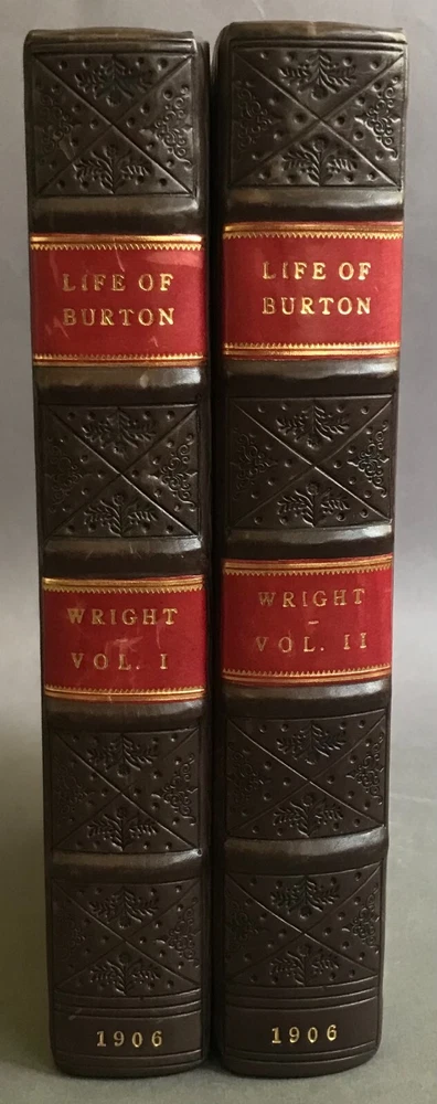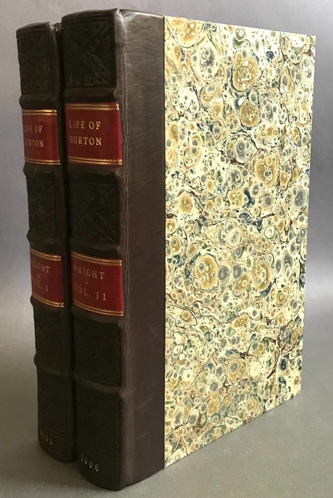 Thomas Wright The Life of Sir Richard Burton (2 Vols.) Everett & Co. 1906 Thomas Wright. The Life of Sir Richard Burton , Vols. I & II. London: Everett & Co., 1906. First edition. Two octavo volumes. 291; 291pp + xxv (appendix/index). Illustrated with b/w photos. Rebound in dark brown quarter polished calf over marbled paper boards, stamped in gilt to spines, five raised bands, top edges gilt, marbled endleaves. Minor shelfwear; light uniform toning, occasional small edge tears. Very good. CDK-00151A Please visit our eBay store for more great biographies and memoirs! https://www.ebay.com/str/inkqnabula/Biography-Memoir/_i.html?_storecat=30600674014