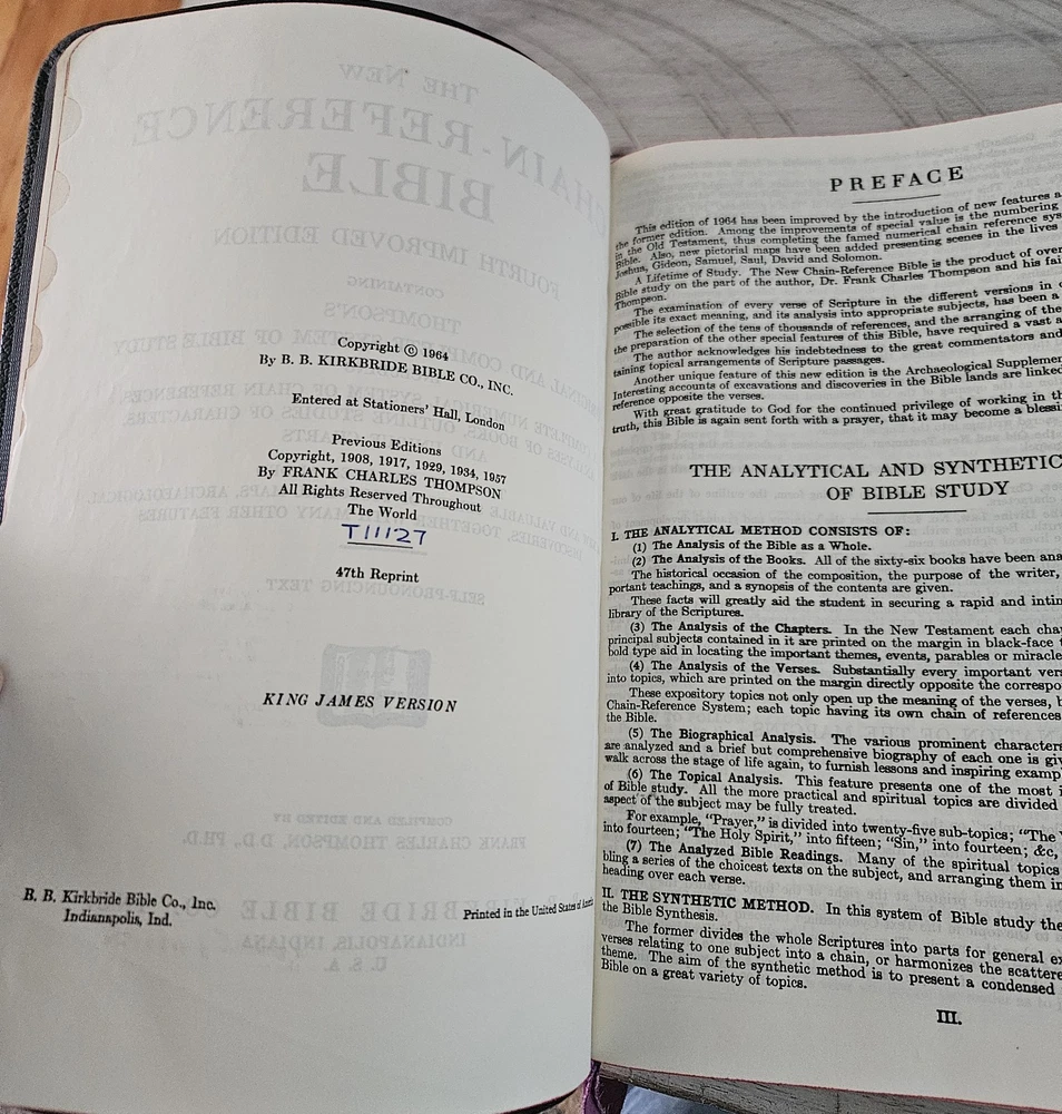 The New Thompson Chain Reference Bible. This edition was published in 1957 as the Fourth Improved Edition. This particular Thompson Bible was printed in 1964 and is extraordinarily preserved, listed as Like New but it may be better be described as excellent Vintage since it has a library card pasted on the inside of the back cover. This may also explain why it is in this great condition, being stored in a library for all these years. Some of the specifics of the Bible are: -Thompson Chain Reference System, One of the most beloved for nearly 125 years. Known also for the quality of their Bibles, especially when they were made by B.B. Kirkbride Bible Co. in Indianapolis, IN. -Size is approximately 10 inches long by 7.75 inches wide by 2 inches thick. -Black Leather, appears to be a quality genuine leather, though not indicated, flexible and supple, see pictures. -Gold gilded over red edging. Quality Bible Paper, Sewn binding. Purple ribbon marker. -Large print King James Version with very clear, dark print..., estimate of 10 to 11 font.., not Giant print. -Black Letter (Words of Christ Not in Red) -Thumb Index -Lies flatly on table nicely. This is a beautiful KJV Thompson Study Bible which has not been used much, if at all, since printed in 1964. Note the last picture compares the large print edition which is the one listed for purchase with a standard size edition..., for comparison only.