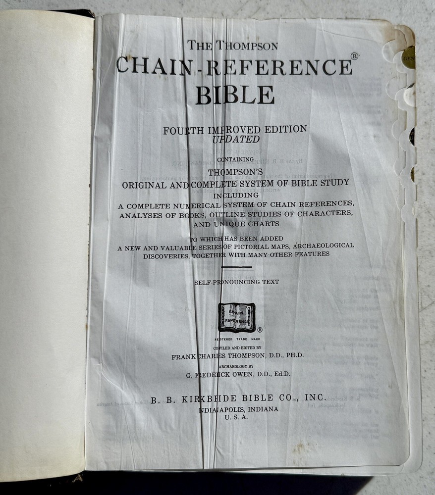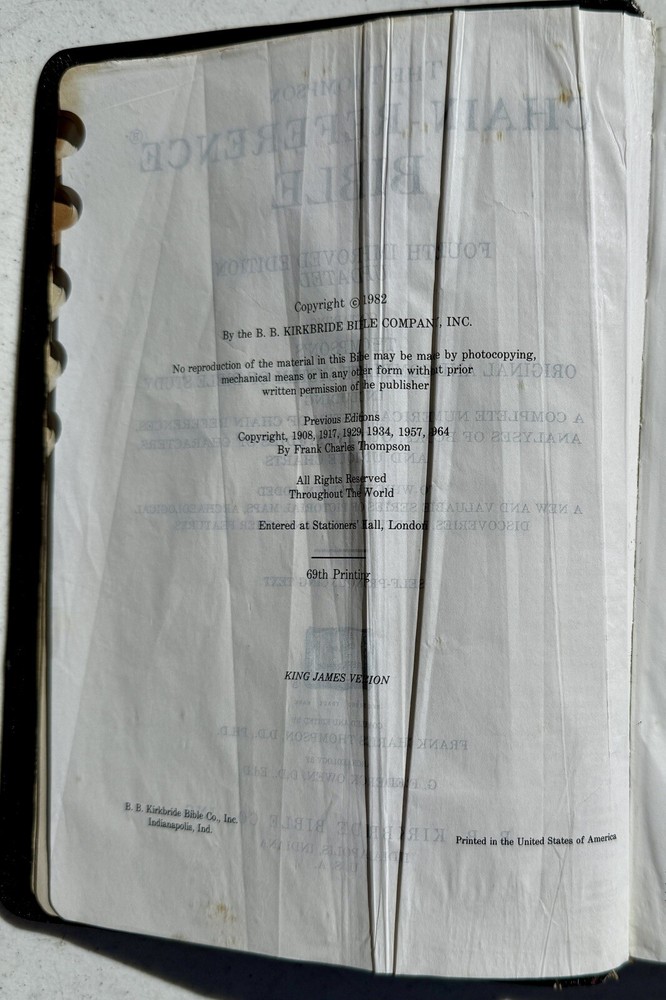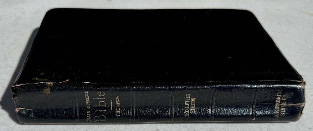 The Thompson Chain Reference Bible KJV 4th Improved Ed. Kirkbride Navy Leather 1982 is a leather bound Bible published by Kirkbride Bible Company, Incorporated, B. B. in the United States. It is in English and serves as a reference Bible on the topic of the Bible. It is the Fourth Improved Edition. See pictures. It is showing some signs of use. Thanks for looking!!