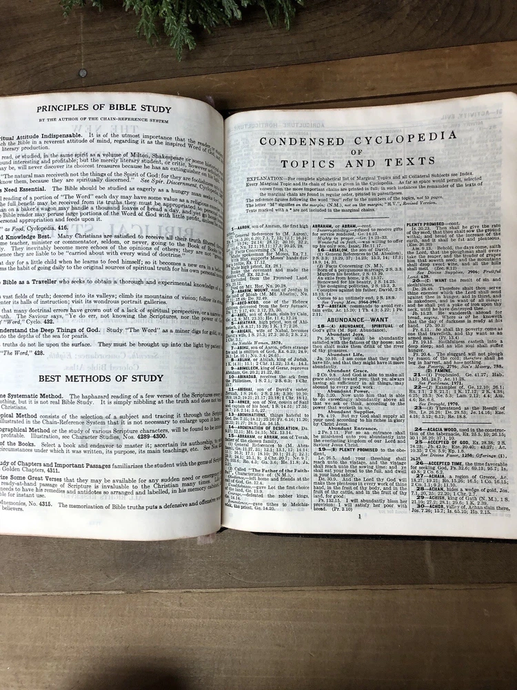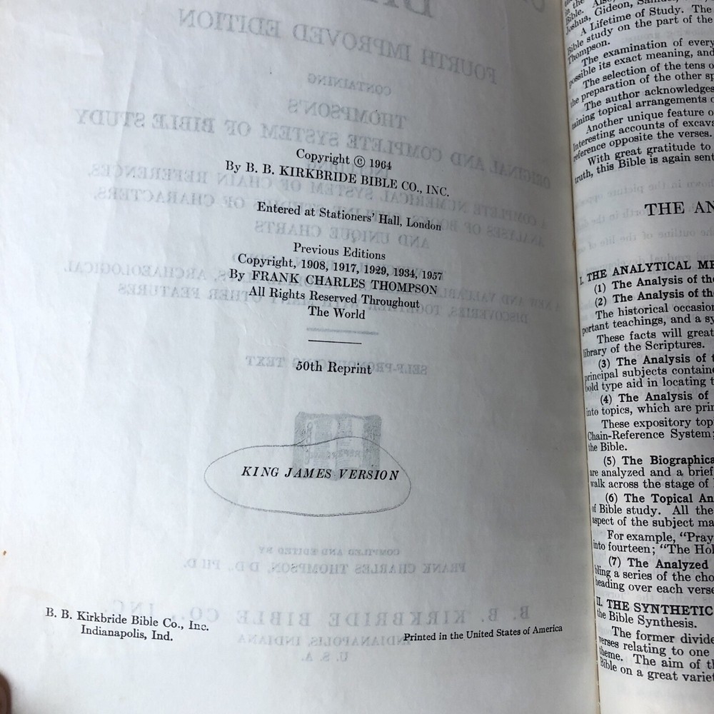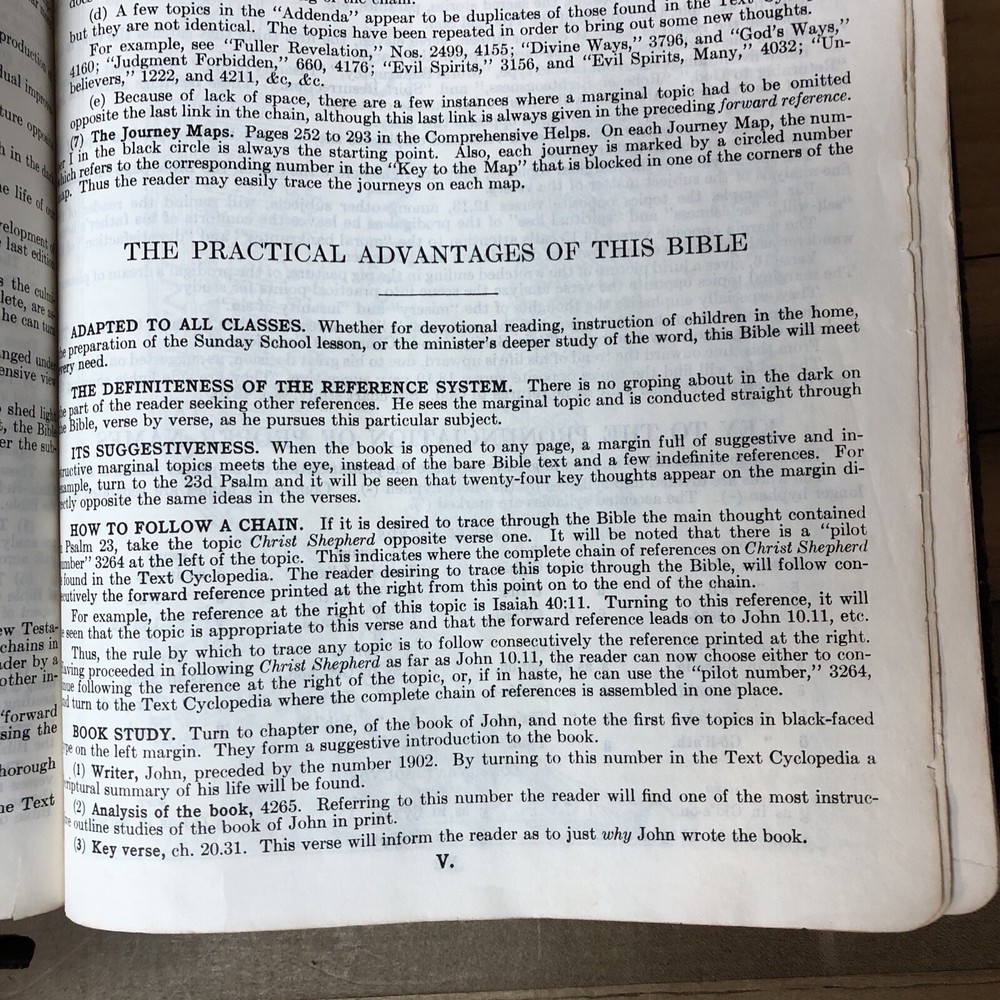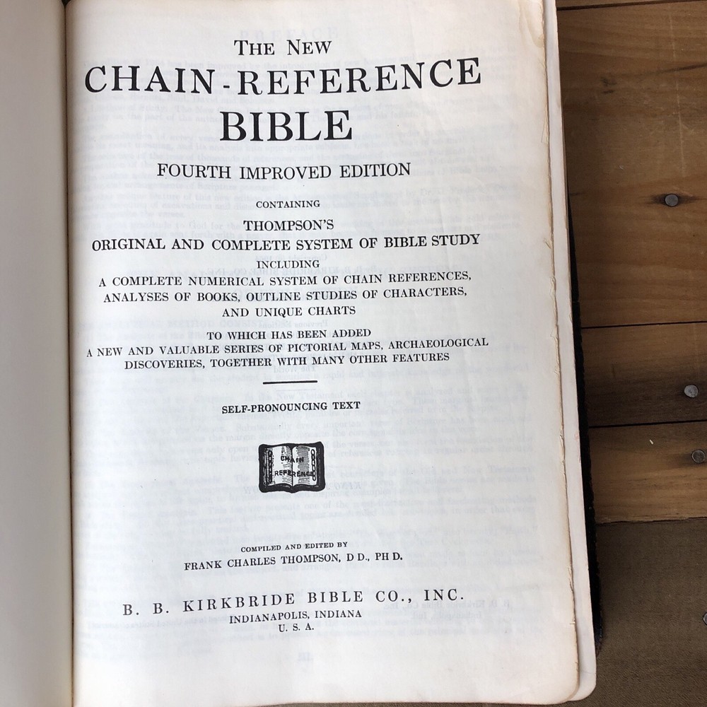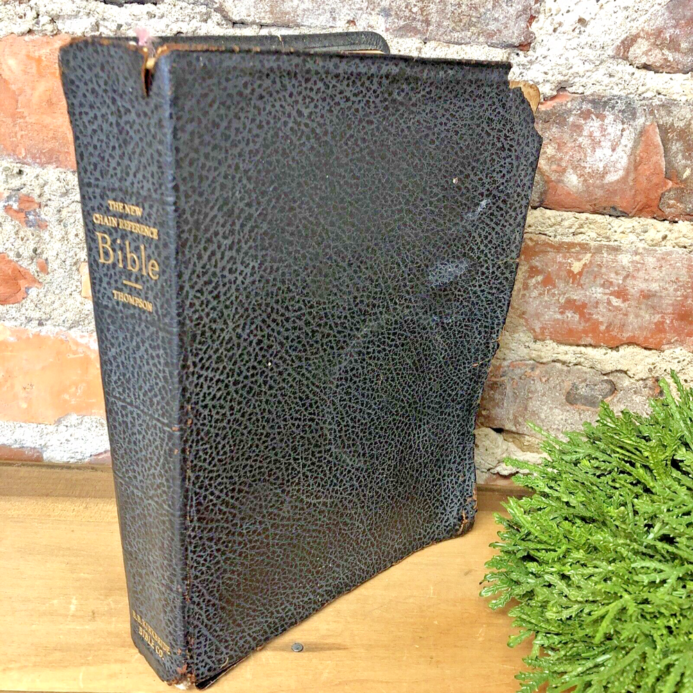 Thompson Chain Reference Bible KJV Maps Chart Studies Concordance Index AS IS Offering a vintage bible titled, "The New Chain-Reference Bible" as pictured. Condition notes listed below. Fourth Improved Edition copyright 1964 King James Version KJV includes maps, charts, character studies, concordance, cyclopedia, index and many more features weighs about 2# 10 oz without packing materials well used and worn copy leather binding is very worn, especially around edges writing and underlining throughout expect stains buying as is, as pictured, issues noted