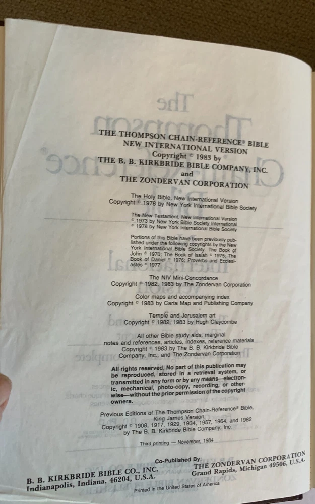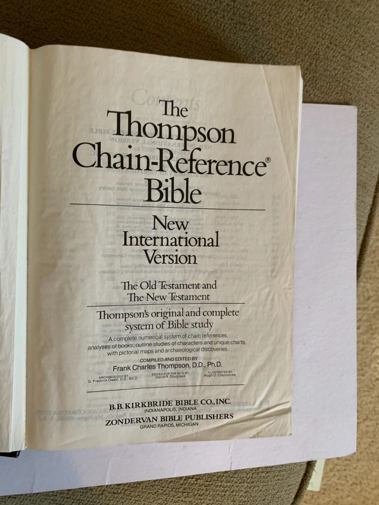 The Thompson Chain Reference Bible Leather 1983 NIV Red Letter Kirkbride Zondervan is a hardcover English Bible published by Zondervan in 1983. It features a collection of writings from various authors, focusing on religious and spiritual topics. This Bible is designed to provide readers with references and insights to deepen their understanding of the Bible, making it a valuable resource for those seeking to study and learn from the scriptures. Thompson Chain Reference Bible New International Version Zondervan/BB Kirkbride 1983 USA Printing Measures approximately 9.5" x 6" Pre-owned condition with light shelf/use wear. I No other writing/underlining/markings in the book Please see pictures for details and feel free to ask any questions. Shop with confidence. See my Feedback I offer local pickup to buyers in my area Your item or items will be thoughtfully and carefully wrapped and packaged for safe delivery to your home. All items other than first class will be insured . Buyer pays insurance for any item over 100.00. Pay for ground postage and get free upgrade to Priority with tracking for items over 1 pound any easels or props used for photographs are not included in the sale or auction ebay Purchase Conditions When buying an item on eBay Services, you agree to the Rules and policies for buyers and that: You are responsible for reading the full item listing before making a bid or commitment to buy, You enter into a legally binding contract to purchase an item when you commit to buy an item, your offer for an item is accepted, or if you have the winning bid (or your bid is otherwise accepted), In the event you have received a damaged item or you feel there was a mistake in thee listing , please contact me via ebay messages for faster results in resolving This item itself comes exactly as pictured; nothing more, nothing less. I try very hard to totally inspect each item carefully and write descriptions accordingly and I take great care to fully photograph the entire item in its exact condition. No stock photos are used. the item or items as described will ship exactly as it is presented. Buyer should fully review the photos and description attached to this listing prior to bid or purchase to ensure that Buyer expectations concerning the listed item are met. If the item is used, it will often show signs of use, general wear and tear, small dents or scratches,dust etc I attempt to describe every item to the very best of my ability If a potential buyer feels that my description contains errors please contact me prior to bidding or buying . I never intentionally describe anything as anything other than what I believe it is postage is based on your location and weight of packaged items . I do not inflate the shipping weight Insurance for Items over $100.00 will be the responsibility of the buyer and will be added to the shipping cost WHITE SPOTS OR STREAKS ARE REFLECTIONS AND GLARE FROM THE LIGHTING. any damages I see will be described to the best of my ability please read description, view pictures , ask questions prior to bid or purchase as sales are final , no returns, no refunds Used: An item that has been used previously. The item may have some signs of cosmetic wear, but is fully operational and functions as intended unless described differently in the description . See listing for full details and description of any noted imperfections. If you received something damaged, please hang onto the original packaging and the damaged item until your claim is settled. You may be asked to take them to your local Post Office™ for inspection later. Please do not reship the package. If a claim is filed because some or all of the contents are missing or damaged, the addressee must retain the mailing container, including any damaged articles, all packaging, shipping label, and any contents received. Upon written request by the USPS®, the addressee must make this proof available to the local Post Office® for inspection, retention, and disposition in accordance with the claims decision. Failure to do so will result in denial of the claim.