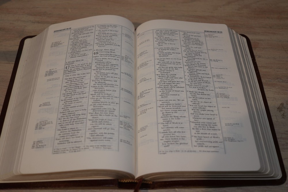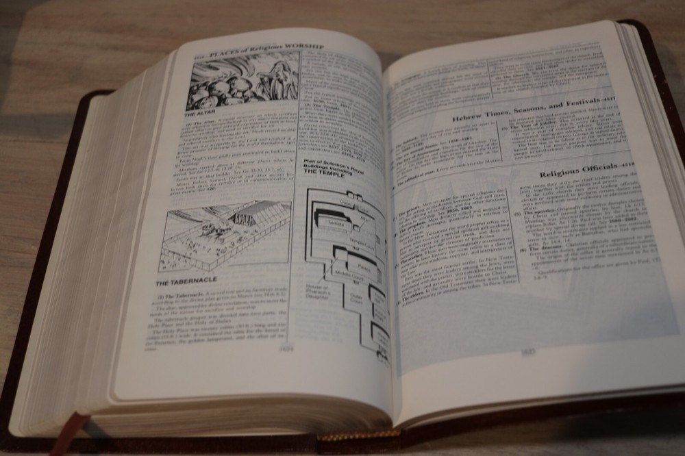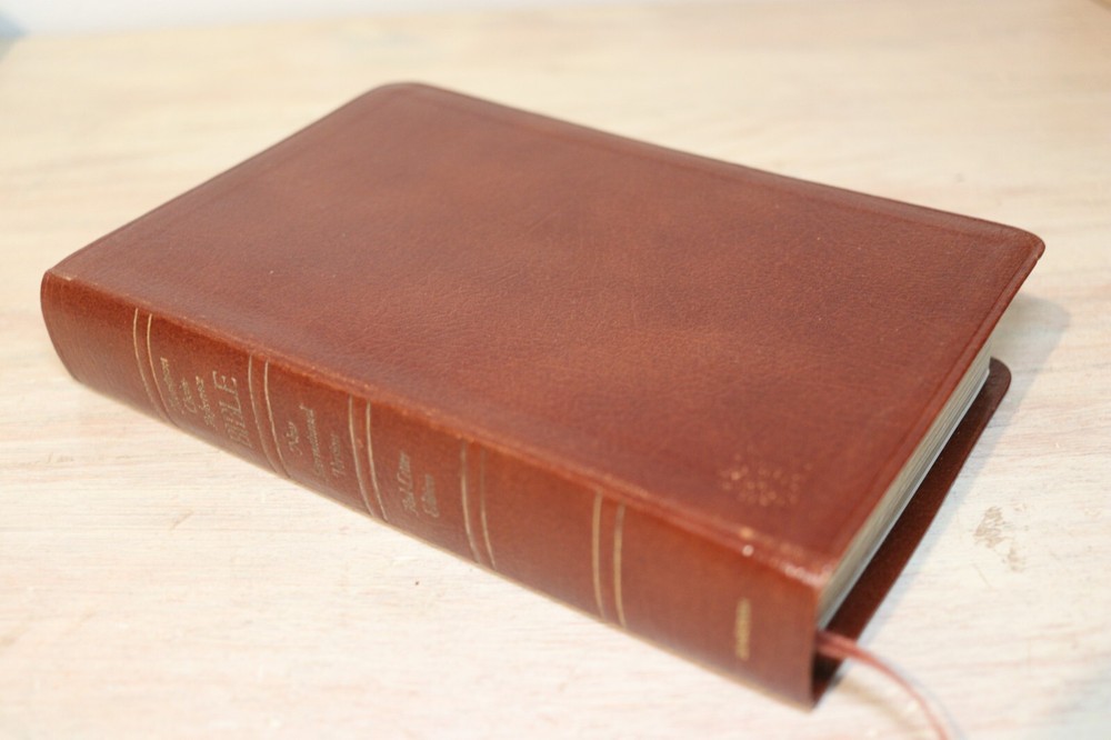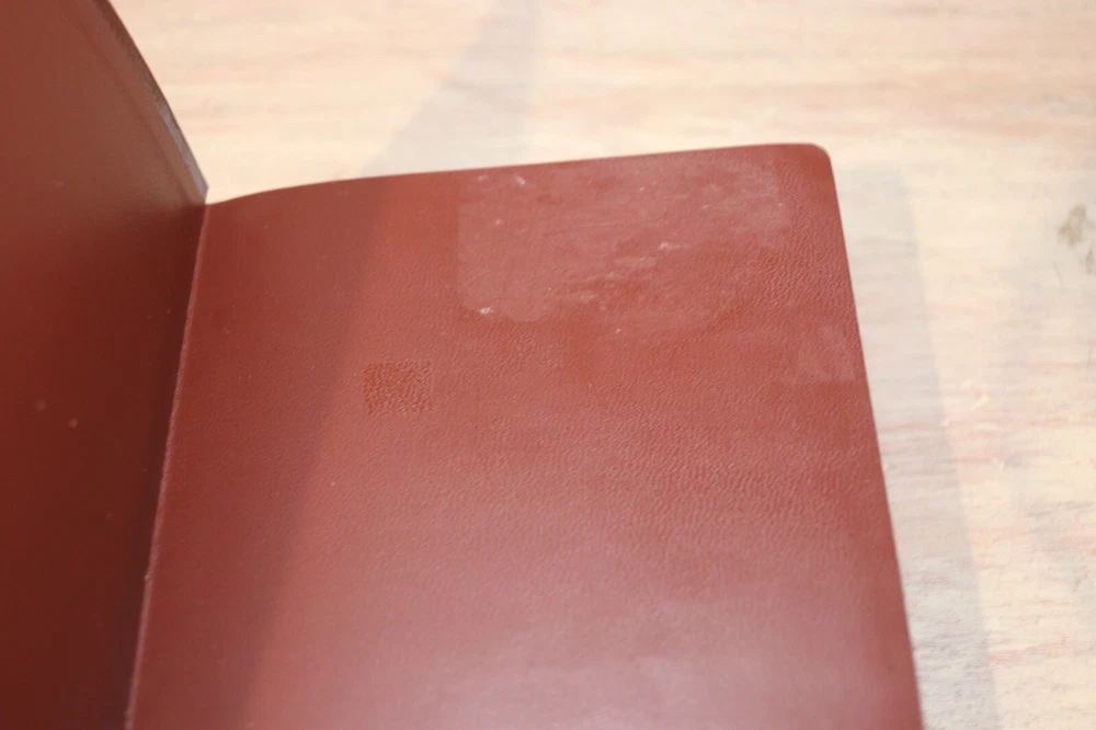 Shows very minor wear and handling. No signs of abuse or neglect. Does have some light sticker residue as shown on inside front cover page. Am seeing no other issues or writing. Comes from smoke free home. Bible shown is actual one you will receive. Measures about 8-3/4" x 5-3/4" Stock #9282