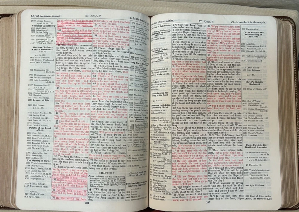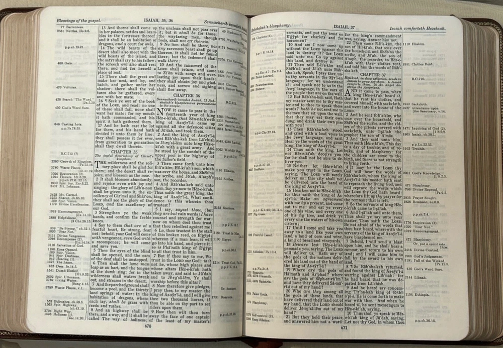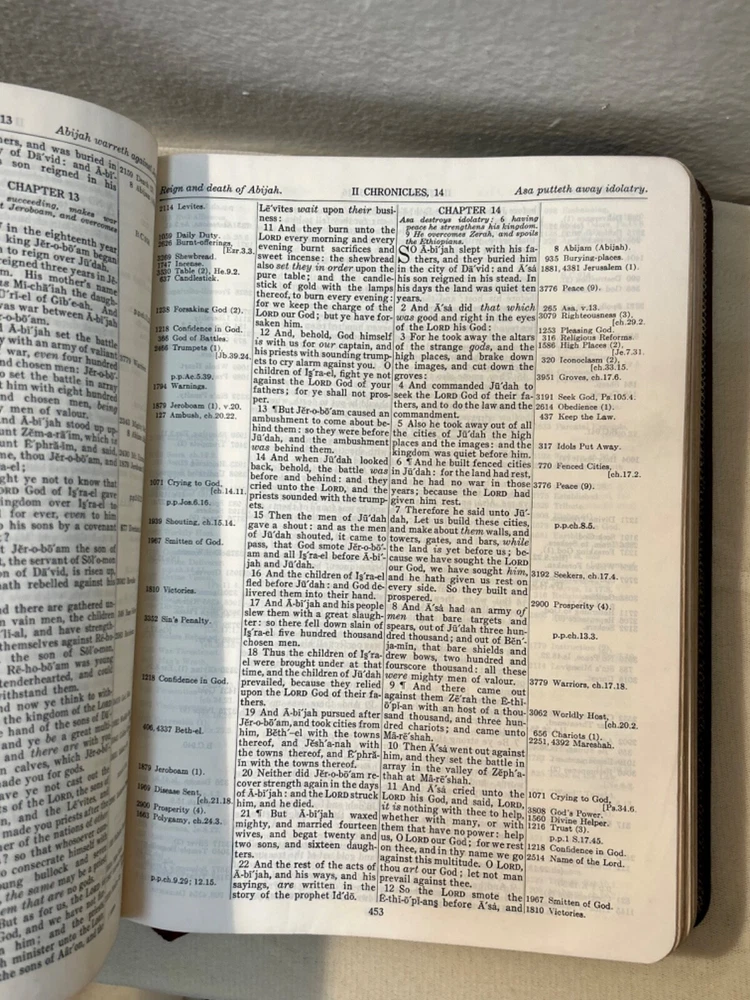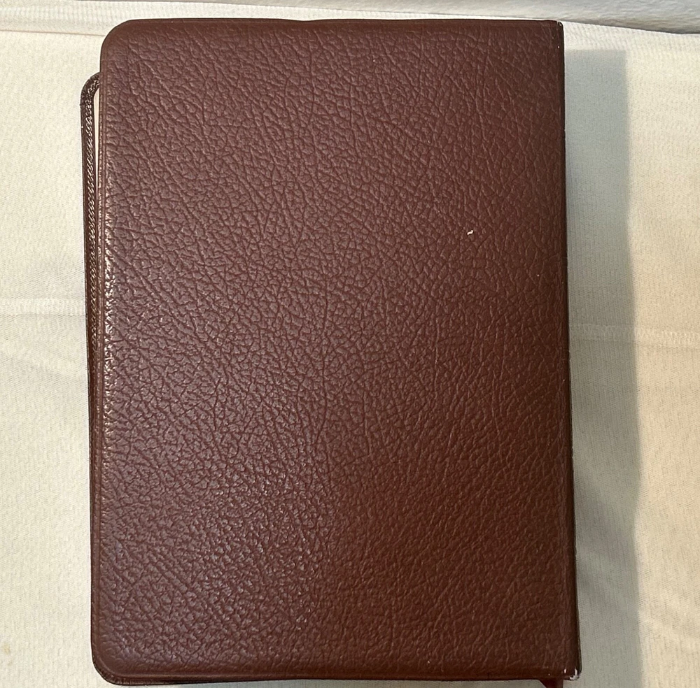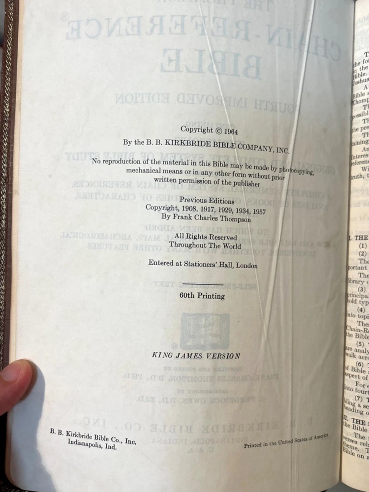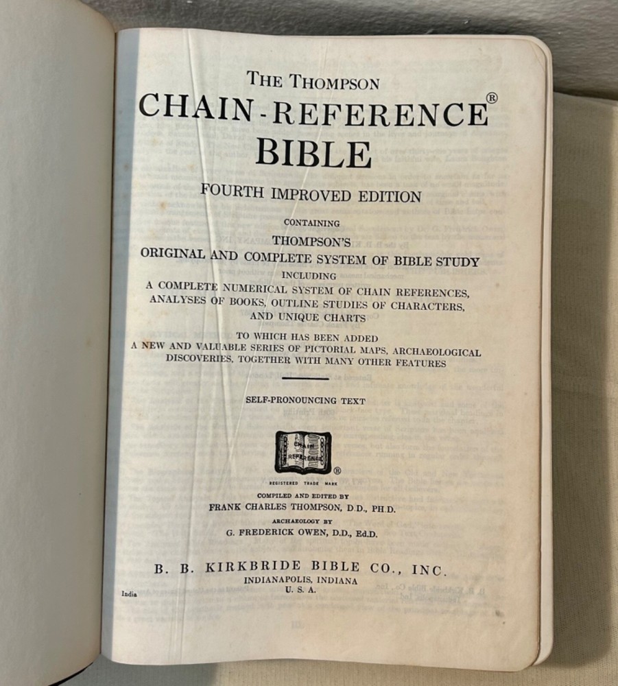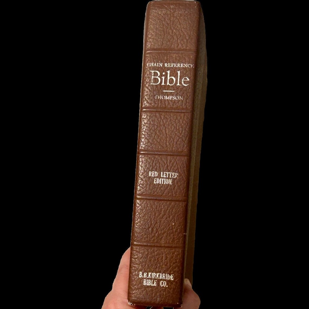 This rare 1964 Thompson Chain Reference Bible is a treasure for any collector or person interested in Christianity and spirituality. The brown leather binding adds to its elegance, while the red letter edition highlights the words of Jesus Christ. The Kirkbride KJV edition is a testament to the timeless nature of the Bible and its teachings. With its numerous topics and subjects related to religion and spirituality, this antique book is a valuable addition to any collection. The leather binding ensures its durability, while the intricate details of the design make it a beautiful piece to display. Own a piece of history with this rare Thompson Chain Reference Bible. READ …. There are very few pages with pen markings. Please look closely at all pics. They show the exact condition of the bible. Thanks