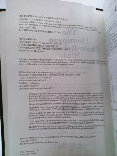 Thompson Chain Reference Bible-NASB by Kirkbride Bible Cover and binding are worn but intact. A reading copy in fair condition. Covers betray fading and nicks and other signs of wear and imperfection commensurate with age. Binding is tight and structurally sound. Notations throughout the text. Sealed in plastic for shipping. Secure packaging for safe delivery.