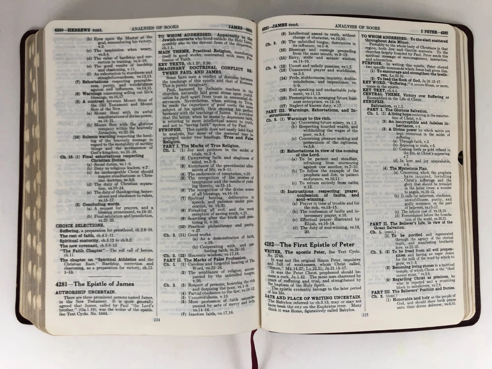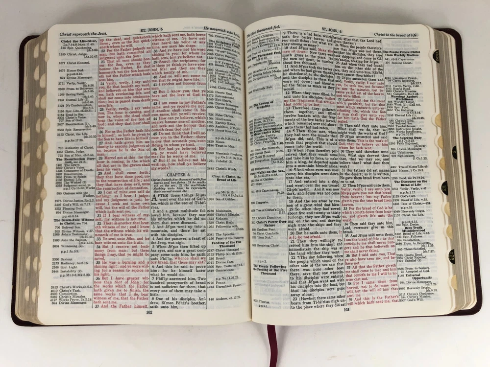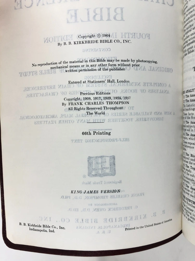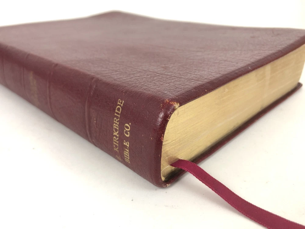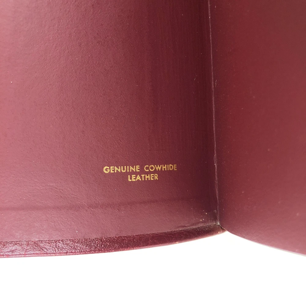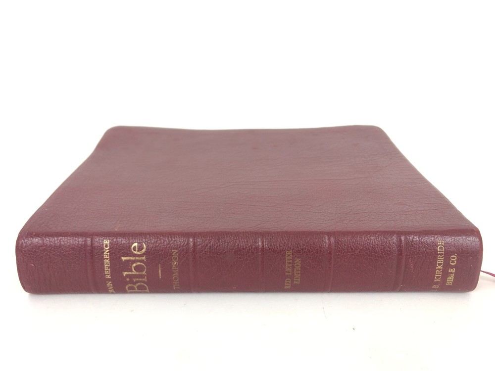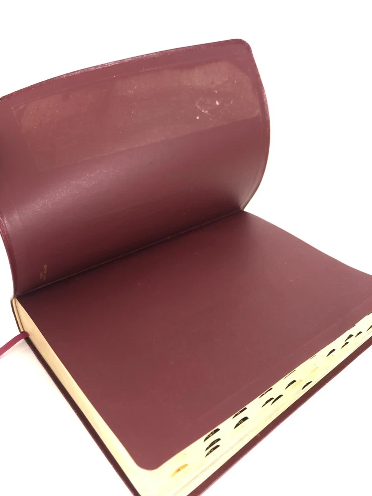 Vintage cowhide leather Bible in very good used condition. No markings observed inside and the binding is secure. The page edges are cut for thumb references, but some of the reference tabs are missing. Light physical wear to exterior. Please inspect all photos. Measures approx. 10.3 x 7.6 x 1.7 inches.