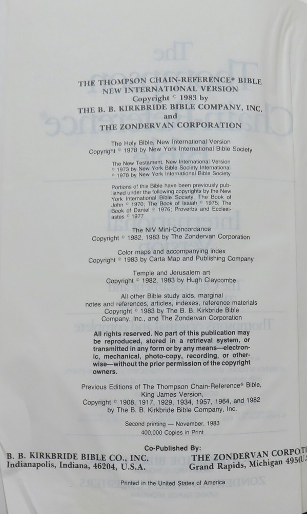 This is a really nice stated second printing of the 1983 B. B. Kirkbride Bible Co., Inc. / Zondervan publication. Boards, binding and text are in VG+ condition showing just very light wear (cover shows a tiny bit of wear along the top edge, the first few pages have corner creases) and no marks whatsoever. Combined shipping at actual cost to seller for all items in a single shipment. Volume discount on records and books: 5% off on each item for 2 items. 10% off on each item for 3 or more items. Combined shipping and volume discounts should show up at checkout. If they don't, go ahead and place the order and a partial refund will be issued to reflect the appropriate discount.