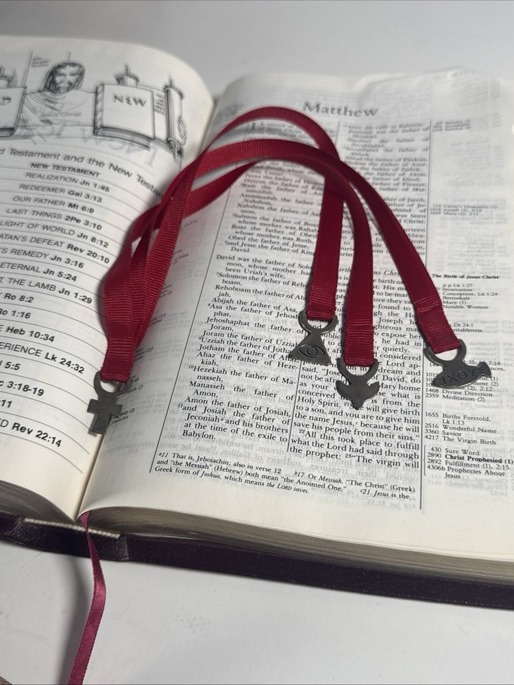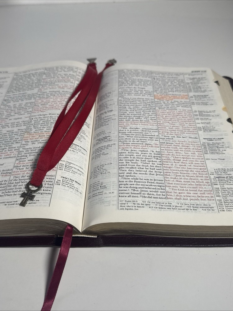 Absolutely love this Bible! The thoughtful notes from the previous owner add such a personal touch, and the leather binding with gold trim is beautiful. It feels like I'm continuing someone's spiritual journey. The chain-reference system is incredibly helpful for study, and having three ribbon bookmarks is perfect for keeping my place. This is truly a treasure!