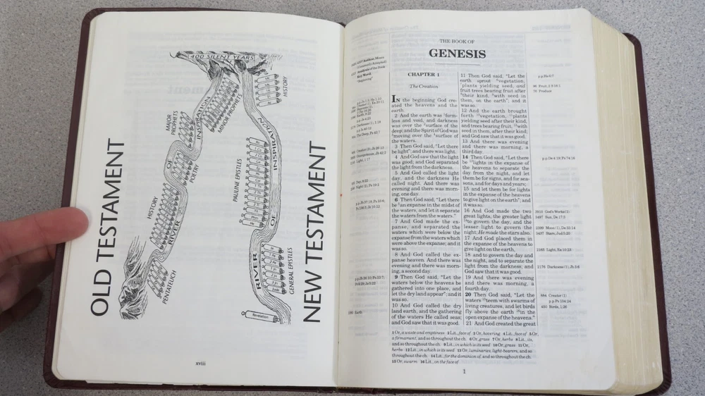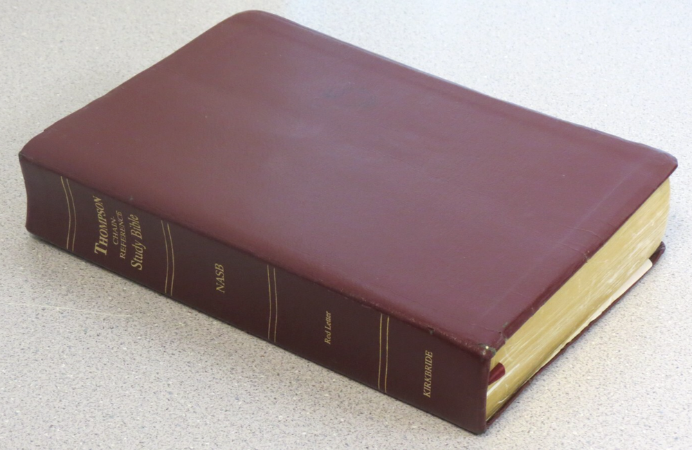 Thompson Chain-Reference Bible - New American Standard Kirkbride 1993 burgundy bonded leather approx size: 6.5 x 9.25" Cover shows some wear to edges, title page and blank page in back are both wrinkled - see pics.