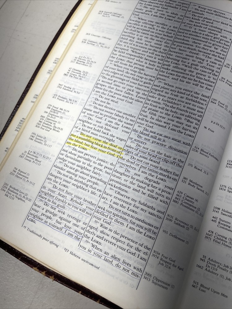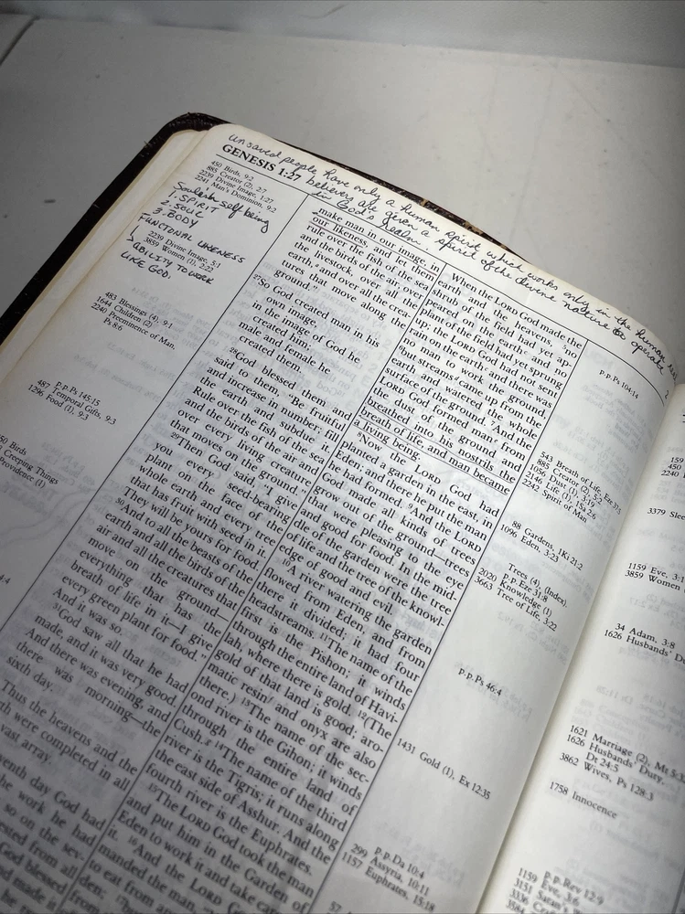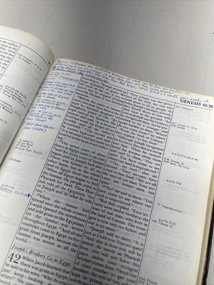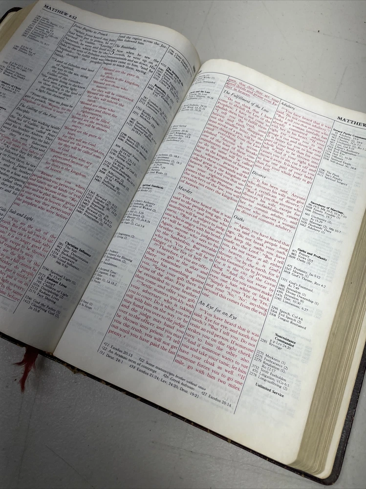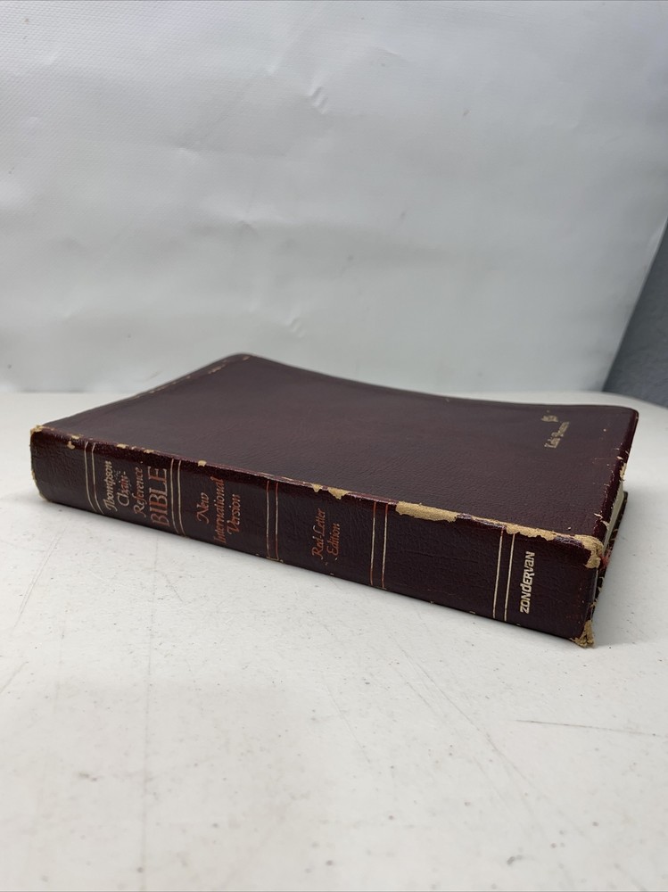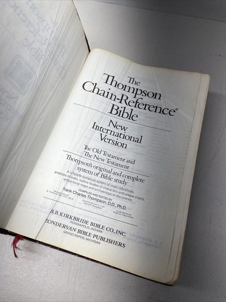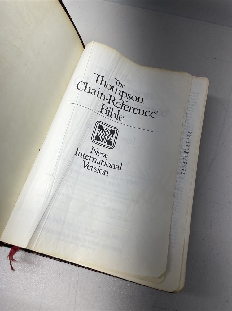 Thompson Chain-Reference Bible New International Version Leather Cover 1983. Please keep in mind that this product is in exact condition as it is shown in pictures. There is writing within some pages, highlighted sentences, and folded pages at the bottoms. All examples shown in pictures for reference.