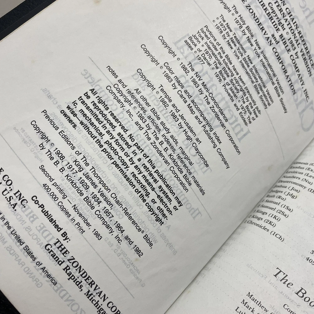 Thompson Chain-Reference Study Bible NIV 1983 Pub. Kirkbridge/Zondervan. Please see pictures regarding the condition. The book(s) is(are) old and fragile, so please do consider that regarding the condition . I flipped through the pages multiple times and no writings were found.