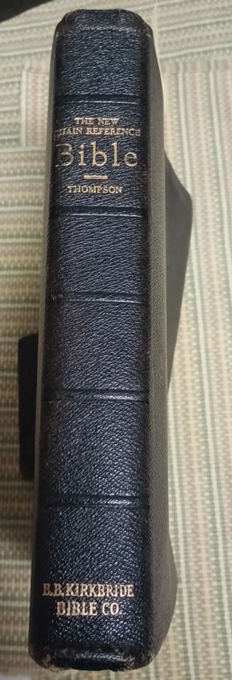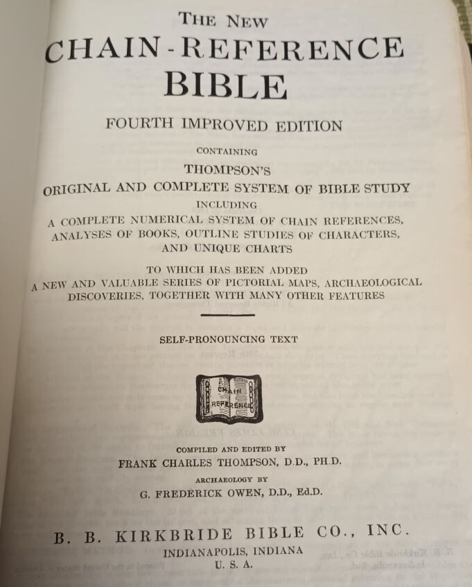 Thompson's Chain Reference Fourth Improved Ed. 1964 KJV Black Leather King James Bible Leather, 1964 Very Good condition; (a small amount of underlining in pencil, one page has a two inch taped tear) No loose, or missing pages, bindings firm and tight. No water damage, mustiness, or odors. No highlighting, or notes. e-803-chain-reference