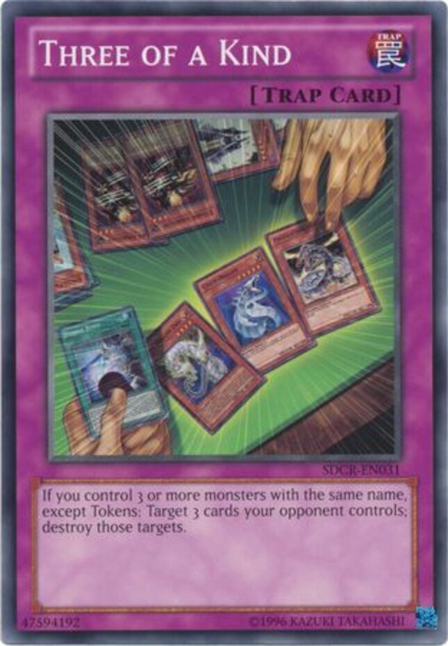 Please, carefully read the following: Image shown is a stock photo and does not reflect the actual card you will be receiving. Please refer to the condition guide below, the title and item description for what you will be receiving. Please also be aware that due to plastic shortages, orders may not always come in a plastic toploader but will always be protected as much as possible to prevent damage. You will receive 1x Three of a Kind - SDCR-EN031 - Common - Unlimited Edition - Condition: Near Mint Please refer to the Title and Item Description above for the item being purchased. Delivery delays: Deliveries may not always fall within the estimated delivery dates when shipping outside of Canada and USA. Many factors may contribute to delays in delivering the package such as weather and customs. Please note that delivery to international locations may take up to 8 weeks to arrive . We always ship out orders within 1 business day and after dropping off with the post office, delivery times are out of our control. Feedback: We will always leave positive feedback for you and we ask if you can do the same for us. If there is any reason why the transaction was not up to your expectations, please message us before leaving feedback so we can address the issue. Combined shipping: To receive a combined shipping quote, please make sure that you commit to purchasing on ebay.ca . This allows us to send you a combined shipping invoice before payment. Shipping within the USA (6-10 Business days): FREE! Shipping within Canada (3-8 Business days): FREE! Shipping and handling delay: We aim to ship all orders within 1 business day. We do not ship on weekends and holidays. Condition Guide: We do not sell any cards that are in MINT condition, the best condition that we offer is near mint. Near Mint (NM) - Cards in Near Mint condition show minimal to no wear from shuffling, play or handling and can have a nearly unmarked surface, crisp corners and unblemished edges outside of a few minimal flaws. A Near Mint card may have a tiny edge nick or a tiny scratch or two, but overall look nearly unplayed with no major defects or flaws. Lightly Played (LP) - Cards in Lightly Played condition may have minor border or corner wear or even just slight scuffs or scratches. There are no major defects such as water damage, bends or issues with the structural integrity of the card. Noticeable imperfections are okay, but none should be too severe or at too high a volume. Moderately Played (MP) - Cards in Moderately Played condition exhibit condition issues visible at a casual glance. Cards in Moderately Played condition can have border wear, corner wear, scratching or scuffing, creases or whitening, minor dirt buildup or any combination of mild examples of these marks. A Moderately Played card may have some form of a more major marking, such as spot water damage or creasing that doesnʼt affect card integrity, but not in combination with other issues such as scratches, scuffs or border/edge wear and not impacting a large area of the card. Heavily Played (HP) - Cards in Heavily Played condition show a severe amount of wear. Heavily Played condition can include cards that have major creasing, major whitening, major border wear or any combination of those flaws. (These flaws cannot prevent the card from being tournament playable when sleeved.) Damaged - Cards in Damaged condition can exhibit a tear, bend or crease that may make the card illegal for tournament play, even in a sleeve. Cards in Damaged condition may have extreme border wear, extreme corner wear, heavy scratching or scuffing, folds, creases or tears or other damages that impacts the structural integrity of the card.