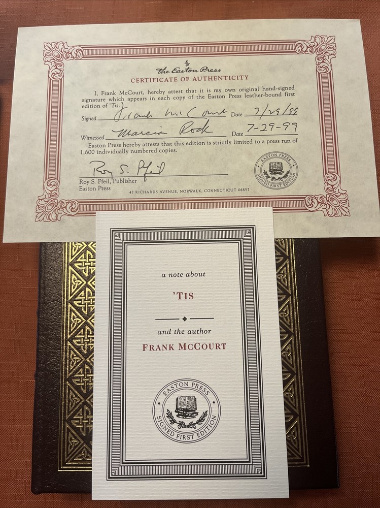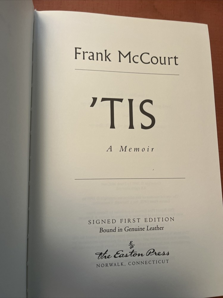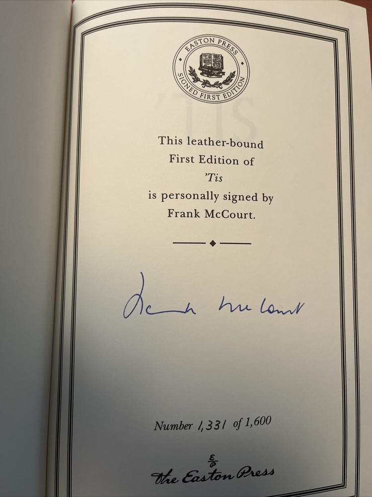 'Tis A Memoir, Frank McCourt, Easton Press, Signed First Edition, Bound in Genuine Leather, Number 1,331 of 1,600, Like New.