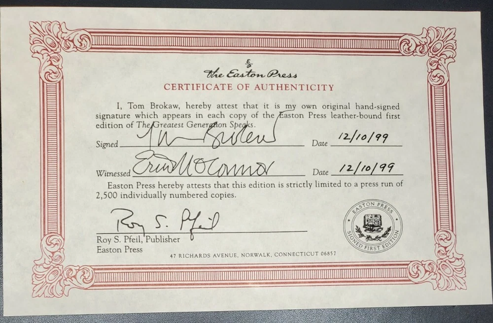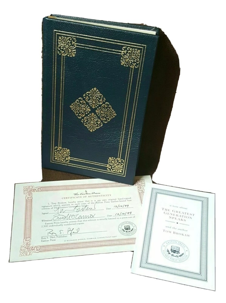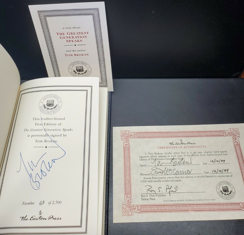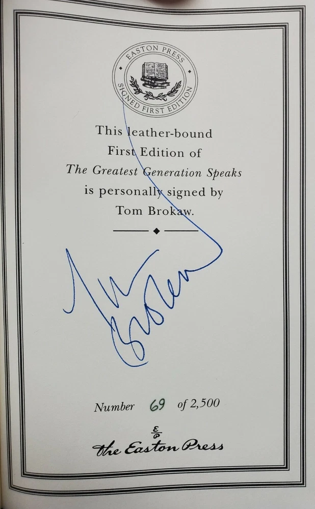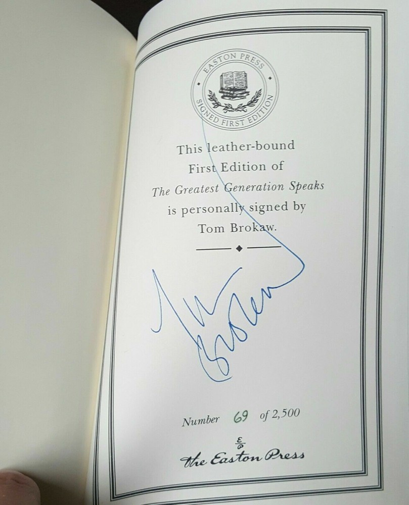 Tom Brokaw SIGNED Book The Greatest Generation Speaks Easton Press Autographed First Edition Easton Press Certificate Of Authenticity (COA) Book is in excellent condition. Signed by author. #'d 69 / 2,500 Copies