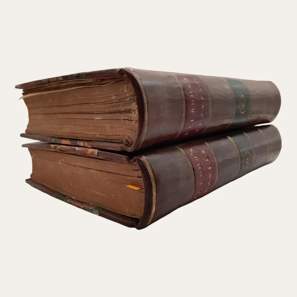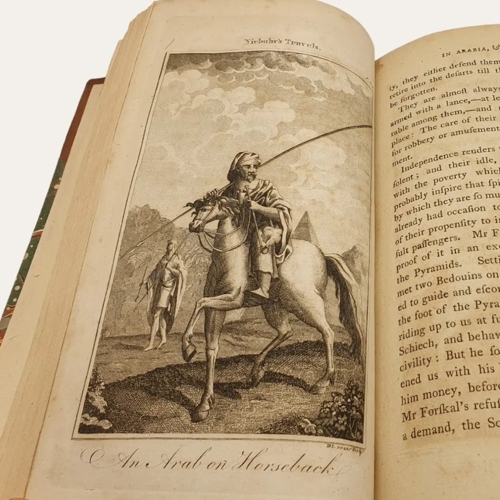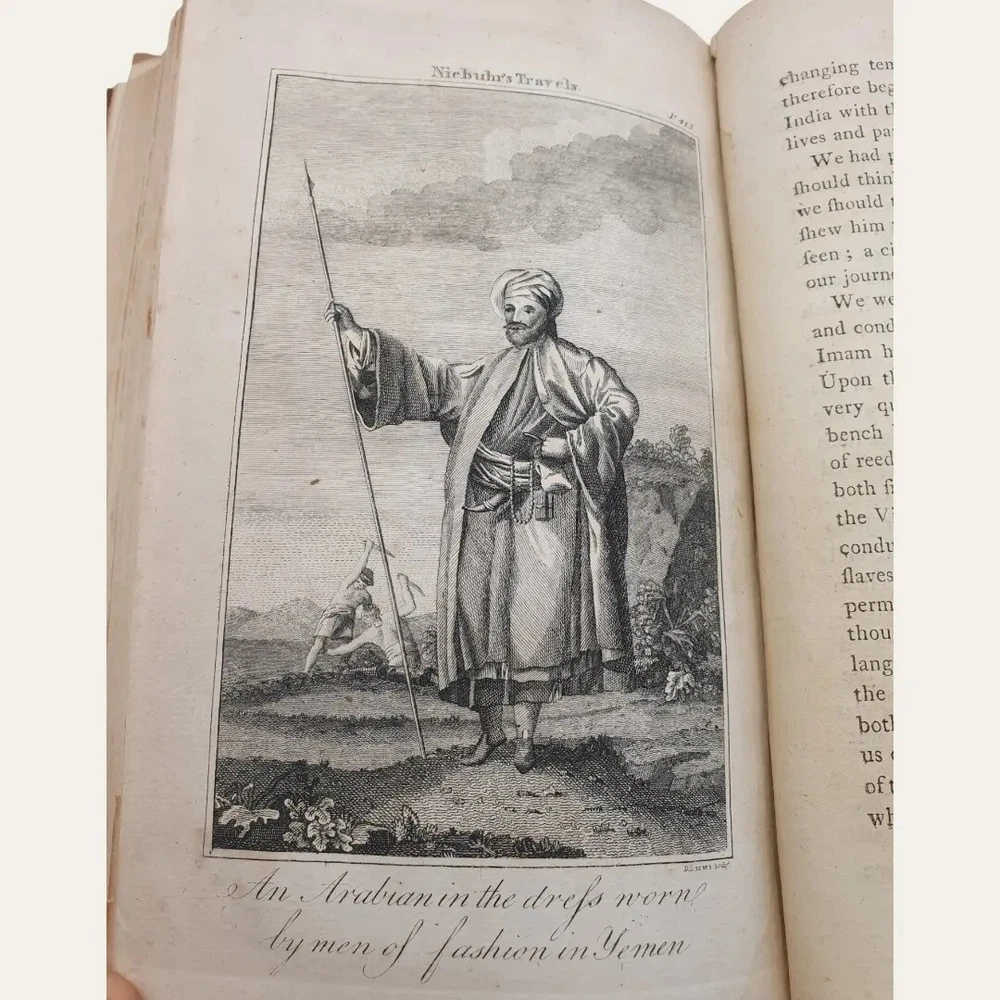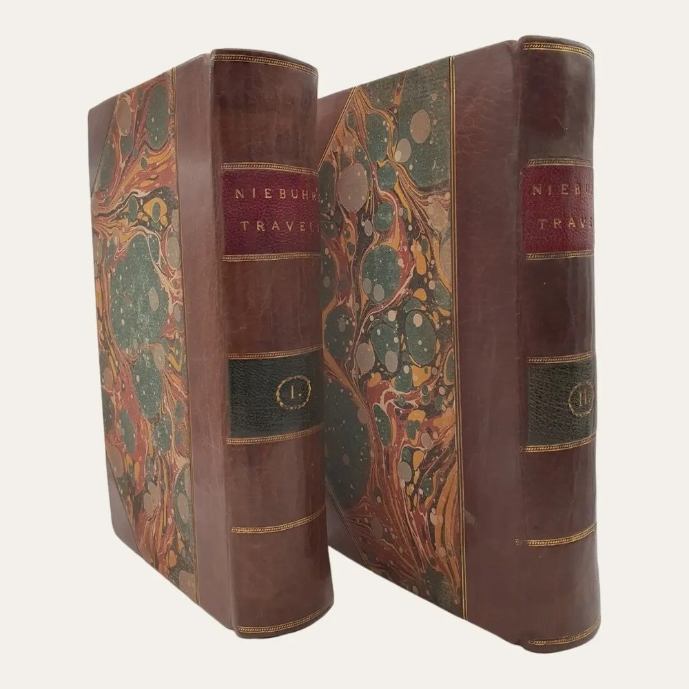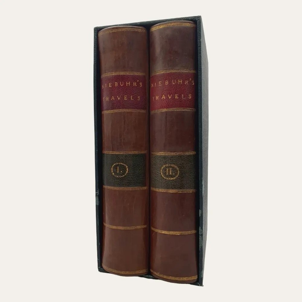 (The first book to mention Kuwait in English) Translated into English by Robert Heron. With notes by the translator; and illustrated with engravings and maps. Carsten Niebuhr was a member of King Frederick V of Denmark’s scientific exploration of Egypt, Arabia and Syria in 1761. Niebuhr was the most junior member of the expedition, but an eager student, and he acquired skill in surveying, geography, mathematics and Arabic in preparation for the journey. In the first two years of the expedition, the group traveled to Alexandria, up the Nile, Suez, Mount Sinai, Jeddah, Mocha, Yemen, and Bombay. By that point, all of the members of the expedition save Niebuhr—who had adopted native dress and eating habits—perished of disease. He then continued the expedition alone for several years, expanding his trip to encompass Bombay, Muscat, Bushire, Shiraz, Persepolis, Babylon, Baghdad, Mosul, Aleppo, Cyprus, Palestine, and Constantinople, finally concluding his trip in Copenhagen in 1767. Famous for his map of the Yemen which Niebuhr calculated by traversing the country and measuring the distances mile by mile. For the next century it served further European explorers of Arabia. Niebuhr’s map of the Arab Gulf is the earliest map to mention Kuwait, and he is also one of the first to call the country “Yemen” instead of “Arabia Felix.” First published in German in 1772 as Beschreibung von Arabien, it was then published in Copenhagen in French in 1773. First edition in English of Niebur’s journeys through the Middle East and beyond, with three large folding maps depicting the greater part of the province of Yemen, the Red Sea, and the Persian gulf, as well as ten engraved plates showing Niebuhr on his travels, various scenes of life in Arabia, and landscape views. Rebound in half calf over marbled boards, raised bands; maps repaired. Light tear on the crease of the map of A small nick to the top end of the marbled board cover (only surface damage). Half Leather | Very Good First Edition - II Volumes | Pages 455 & 439