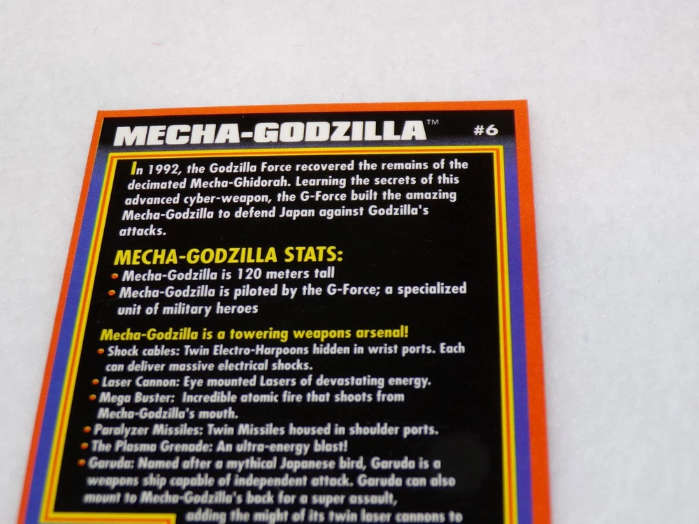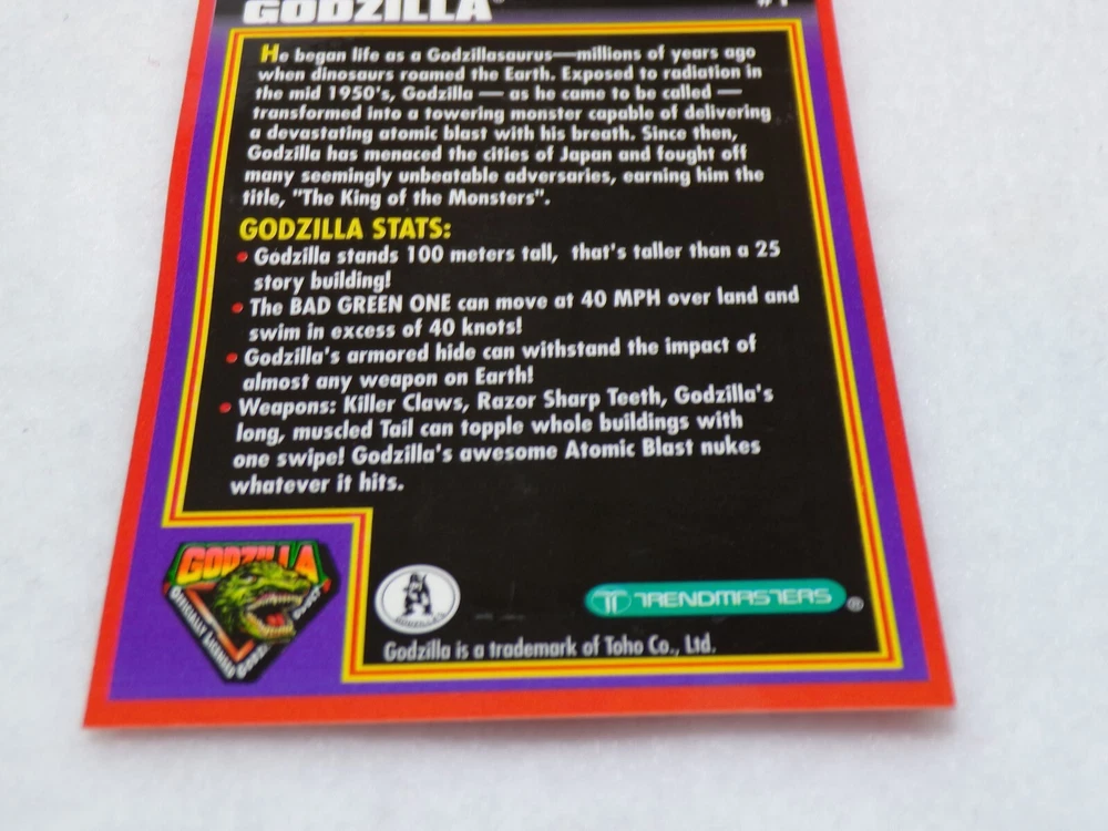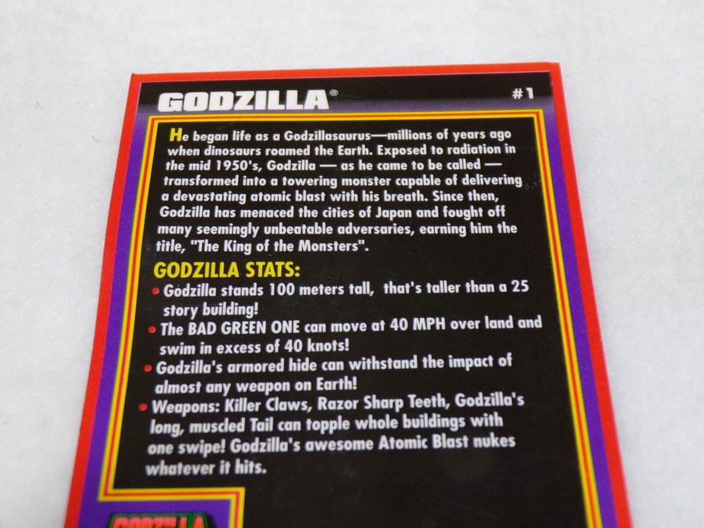 Auction Find Trendmasters 1994 Godzilla King of the Monsters trading cards 1 and 6 Light wear and card # 1 has a slight bend (see photos please) The majority of what we sell are items that were bought at various estate auctions. Therefore unless otherwise noted in the description, if the item is listed as an auction find it is being offered in “as is” condition. Due to USPS price increases we reserve the right, especially with large or heavy items, to switch shipping carriers to UPS or Fed Ex, as needed. No International Shipping COMBINED SHIPPING ACCEPTED, in most cases it will be the actual cost subtracted from the total shipping charges. WE USE EBAY'S AUTOMATED UNPAID ITEM ASSISTANT. RETURNS Please contact us if there are any problems with your transaction before leaving negative feedback. We do our very best to take good pictures so you know exactly what you are getting. Your satisfaction is important to us. Thank you for looking, please check out our other listings for even more great deals. New items are added every week!