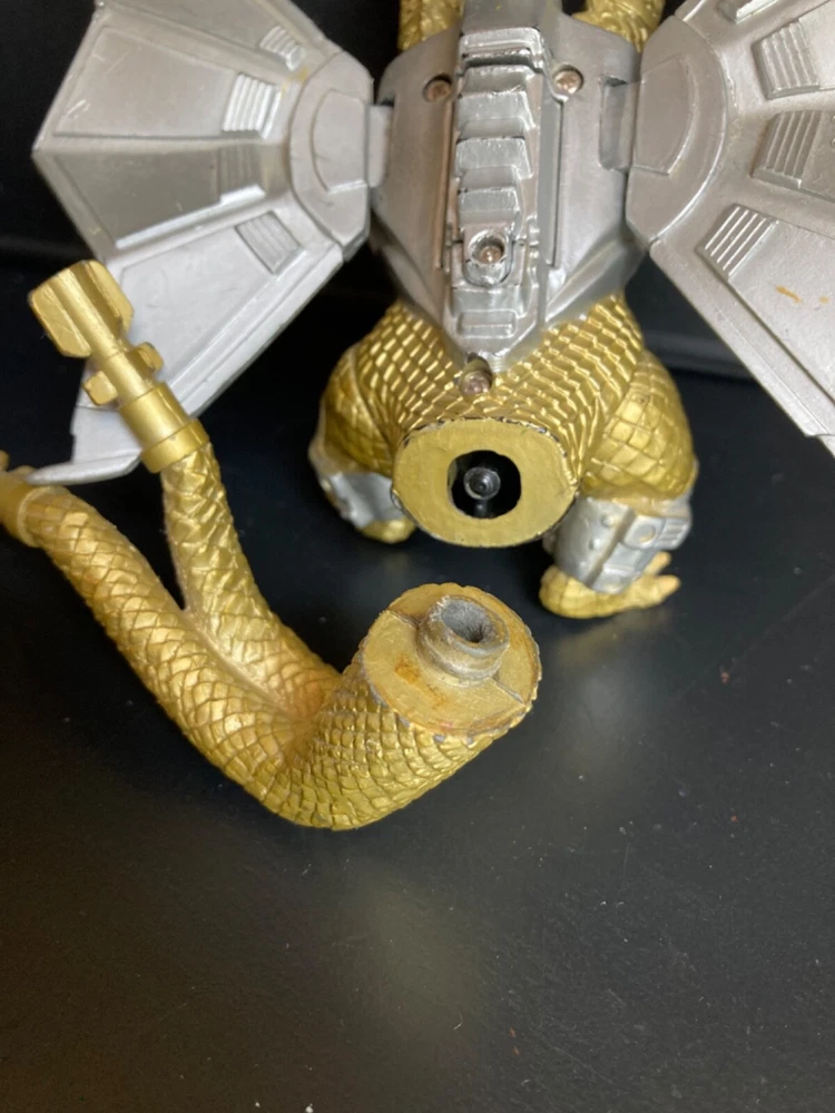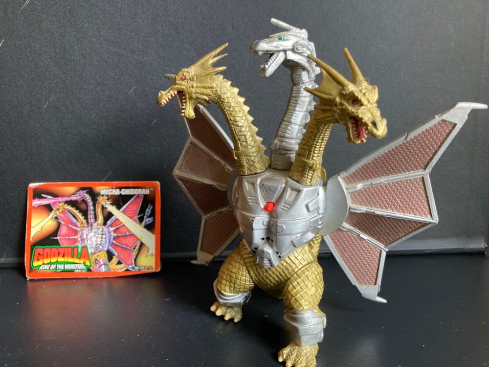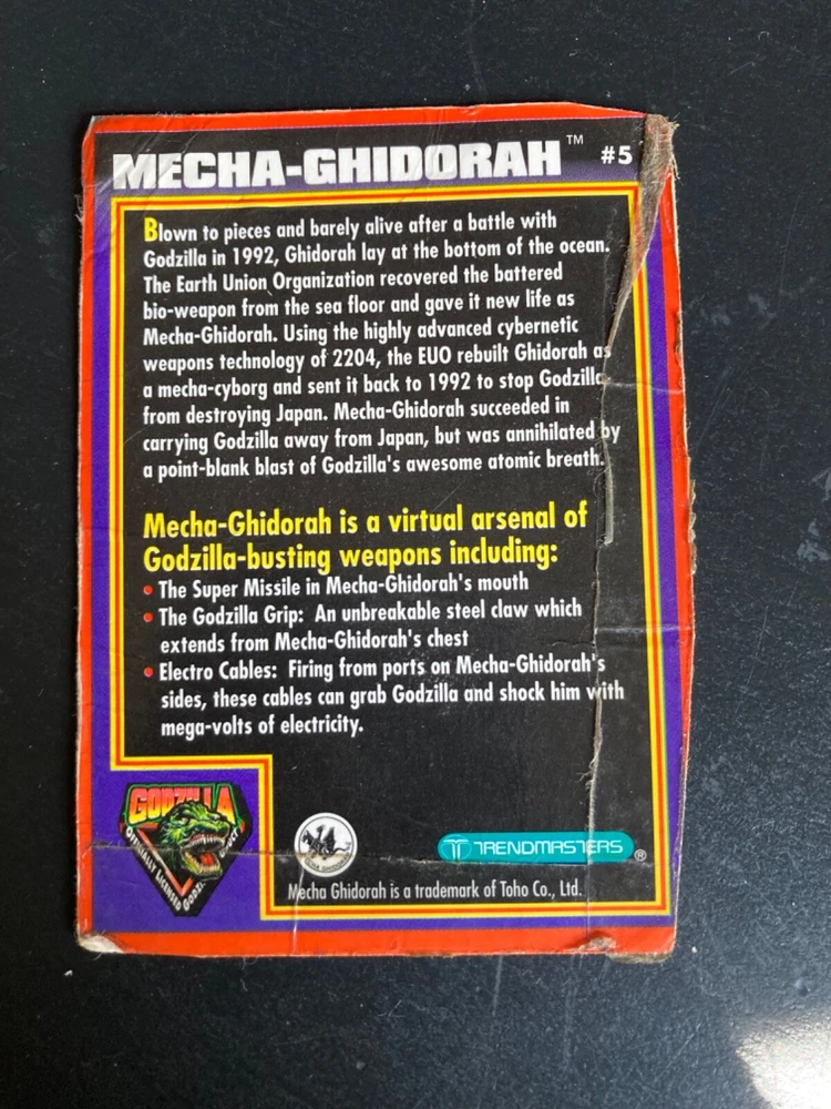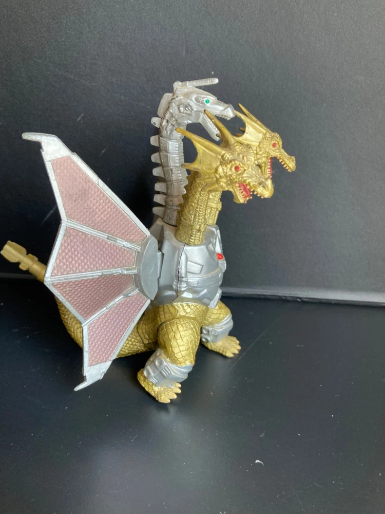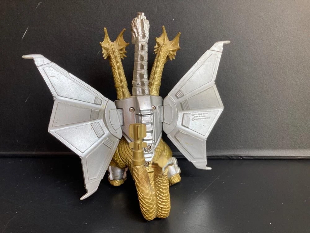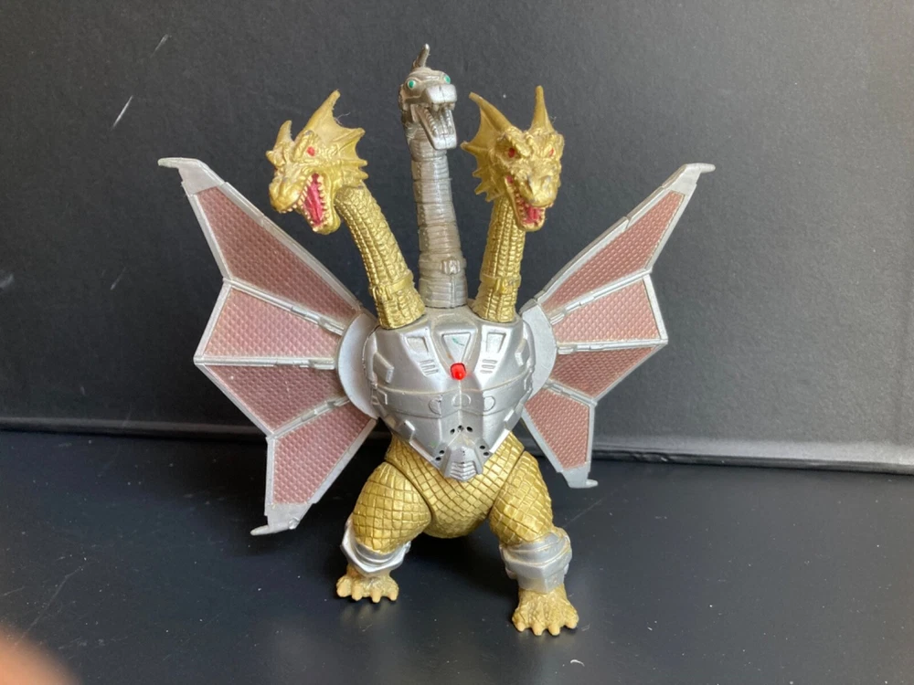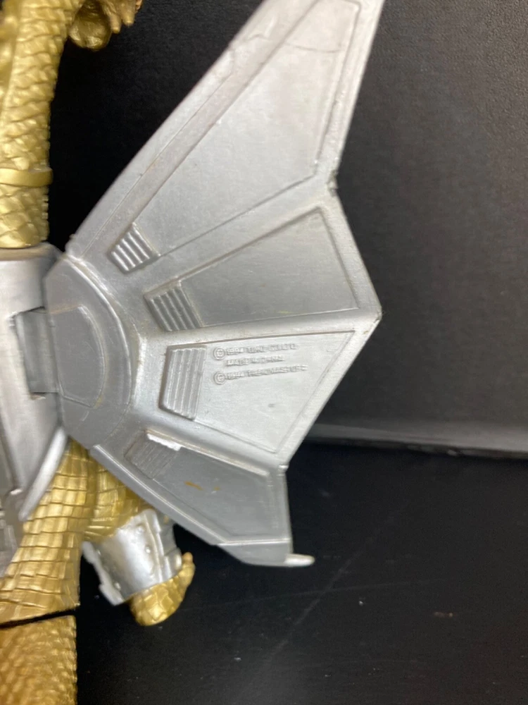 Original owner, purchased brand new in the 1990s. There is some paint loss on silver pieces and some scuffing from play and storage with other toys. Mecha-King Ghidorah stands about 6” tall, 6” long, and about 6” wide. It has a commanding presence on a shelf with other Trendmasters toys! The peg that holds the separate tail piece in place wobbles a bit but both pieces fit together well and as intended by the manufacturer. We can’t get the figure to roar and haven’t replaced the dead specialty batteries that are currently in the figure. Therefore we can’t verify that the electronic functions will still work with new batteries. Trading card has been in a binder for at least 25 years: typical corner wear and creasing with minimal damage to the surface film material on back. Please see our other listings for more vintage Godzilla and sci-fi toys and collectibles. Carefully packaged and shipped next day for a safe, quick arrival.