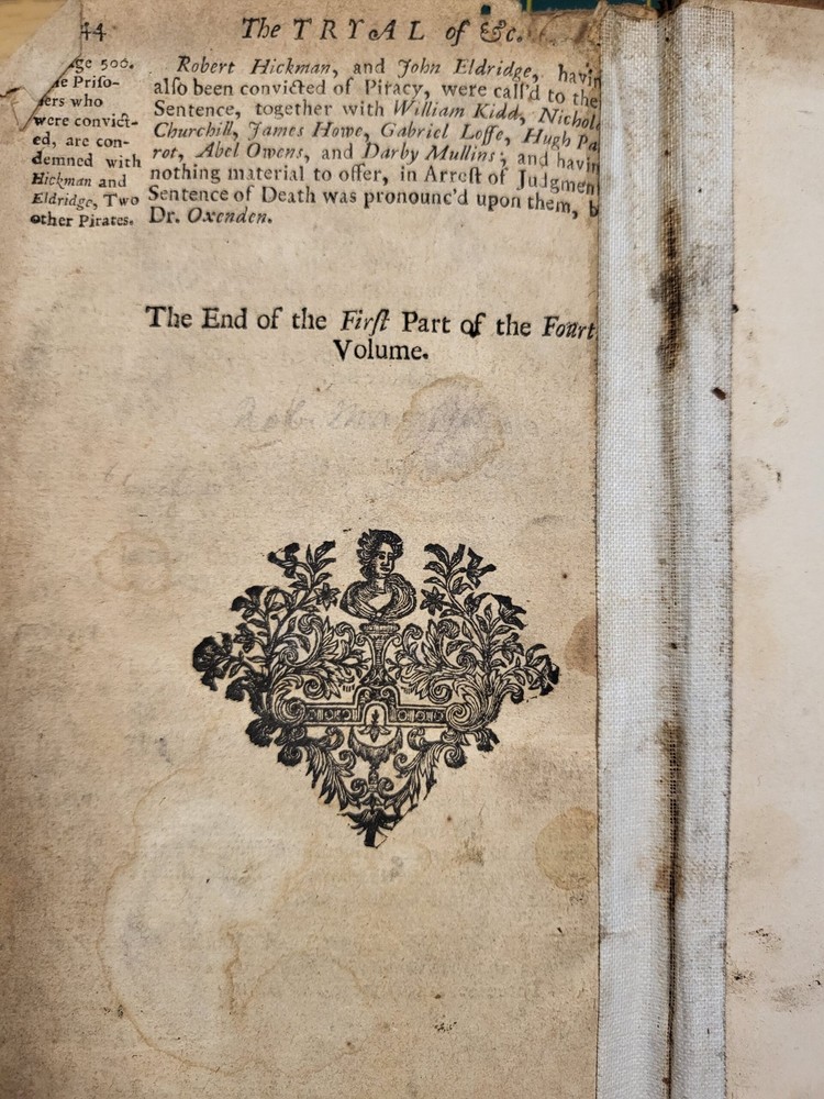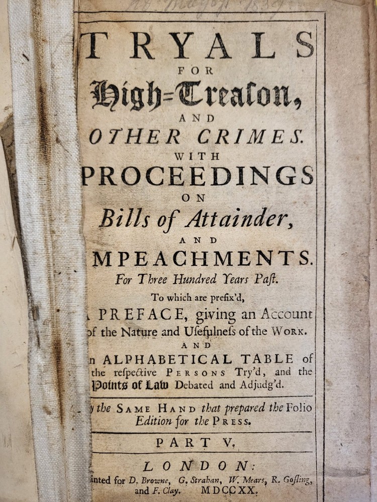 HGG Books presents ... Tryals for High Treason and Other Crimes with Proceedings on Bills of Attainder and Impeachments Part V Author: Hamilton, James Publisher: D Browne, G Strahan, W Mears, R Gosling, and F Clay Release Date: 1720 Seller Category: Legal Qty Available: 1 Condition: Collectible: Acceptable Sku: tryalstreason Notes: Tryals for high treason and other crimes. Part V : with proceedings on bills of attainder and impeachments, for three hundred years past : to which are prefix'd, a preface giving an account of the nature and usefulness of the work and an alphabetical table of the respective persons try'd and the points of law debated and adjudg'd / by the same hand that prepared the folio edition for the press. Published in London 1720.Pages clean with toning towards edge, missing blank front space page, hinges reattached with interior binding tape, and library tape strips to exterior, text block solidly bound, leather boards heavily rubbed with bumping, spine leather cracked Don't forget to check out other great deals in our eBay Store!!