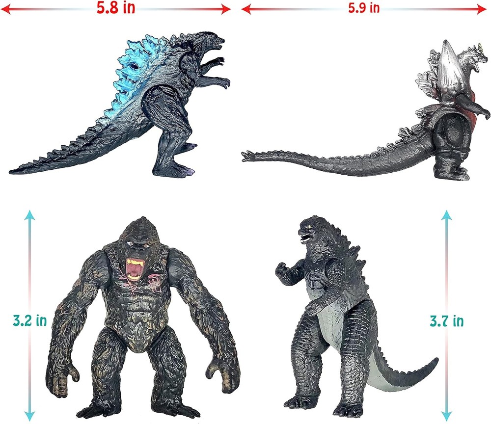 TwCare Set of 8 King Kong vs Godzilla Toys Movable Joint Action 8 Product Details Product Dimensions: 6 x 3 x 3.8 inches Item Weight: 1.21 pounds Country of Origin: China Manufacturer recommended age: 3 years and up Manufacturer: TwCare Occasion: Birthday Brand: TwCare Product Dimensions: 3"W x 3.8"H Unit Count: 8 Count The great Godzilla set for Godzilla fan: Godzilla Earth, King Kong, Godzilla Heisei, Godzilla: King of the Monsters, Godzilla Space, Godzilla Shin,... High Quality and Details 【Height & Length】Up to 3.8 inches in height, up to 6 inches in length 【Superior Quality】Passed CPC Children Safety Certificate, ASTM F963-16/17 and CPSIA standards. Environmental friendly, nontoxic, non-radioactive and waterproof. 【Worry-free shopping】We offer the Professional Customer Support: reply to your inquiry within 12-24 hours, send replacements within next 12-24 business hours. If you have any issues about your purchase, please give us a chance to make things right. We will be more than happy to assist you.