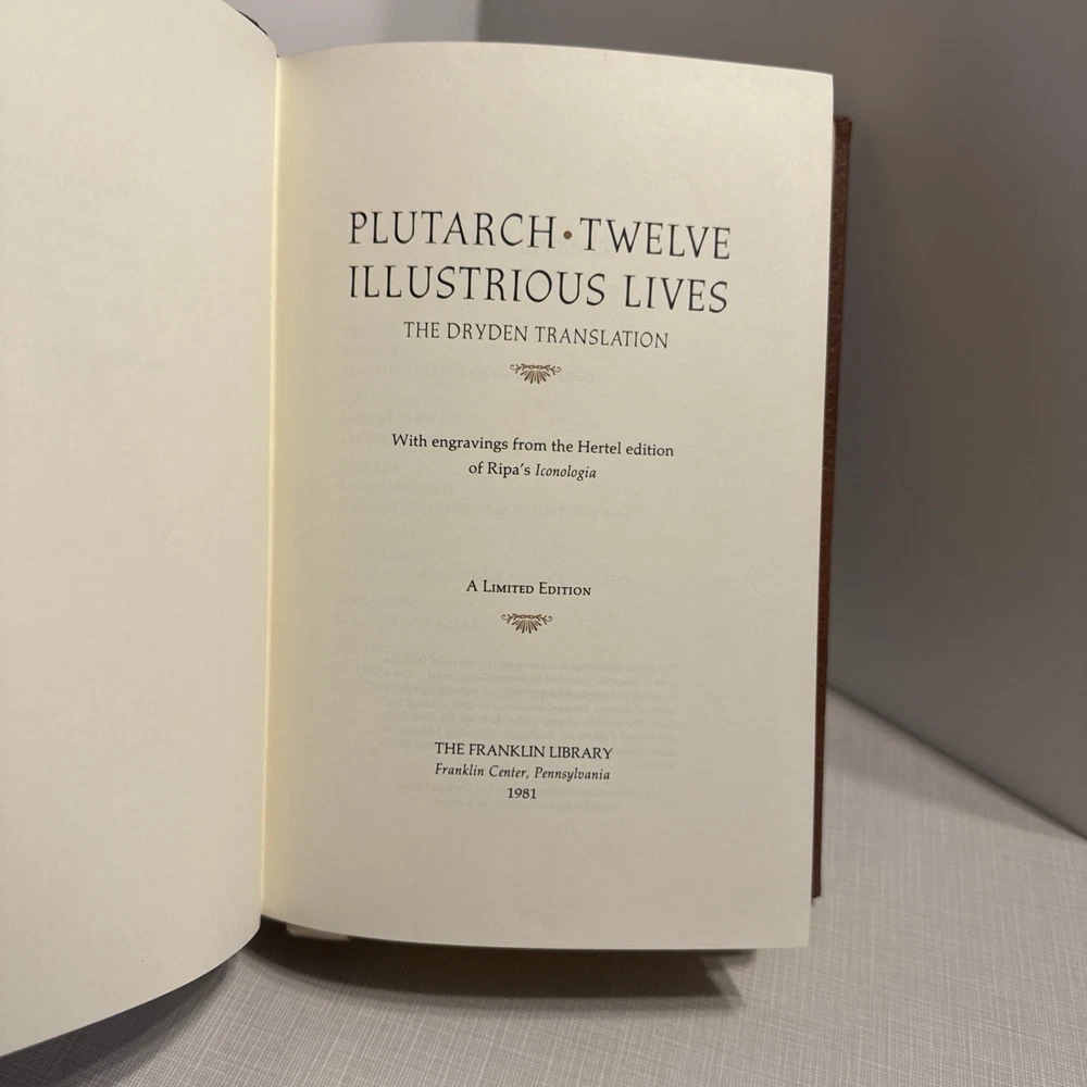 Delve into the world of classical biography with Plutarch's "Twelve Illustrious Lives," a compelling collection that brings to life the virtues and vices of renowned figures from ancient times. This edition, published by Franklin Library as part of the prestigious 100 Greatest Books series, boasts a luxurious leather binding that exudes elegance and durability. The book is a treasure for both bibliophiles and history enthusiasts, offering a window into the past with its insightful explorations of biography and autobiography. Its pages are filled with the English translation of Plutarch's original Greek text, ensuring a seamless and engaging reading experience. This collector's edition, with its limited print run, is a distinguished addition to any library.