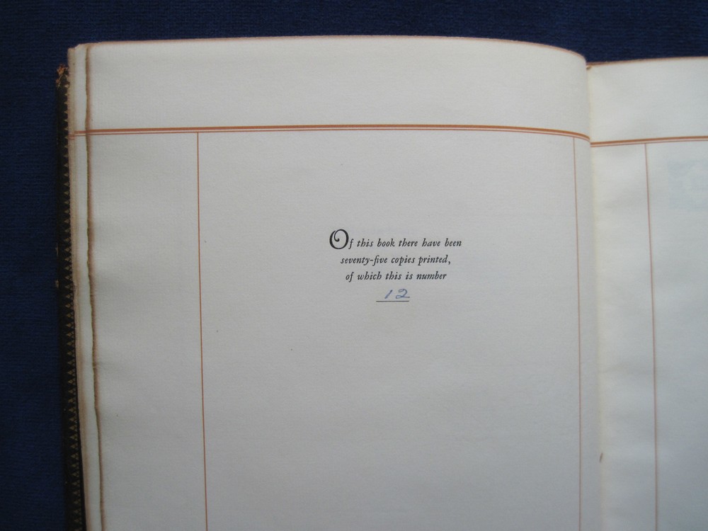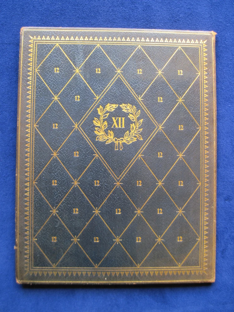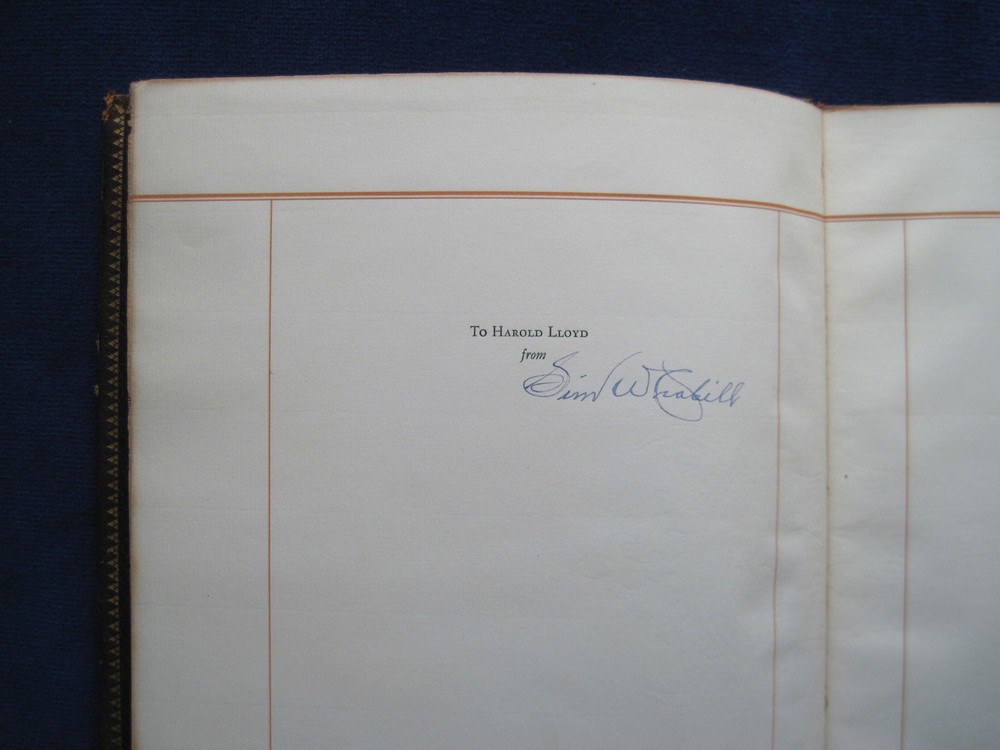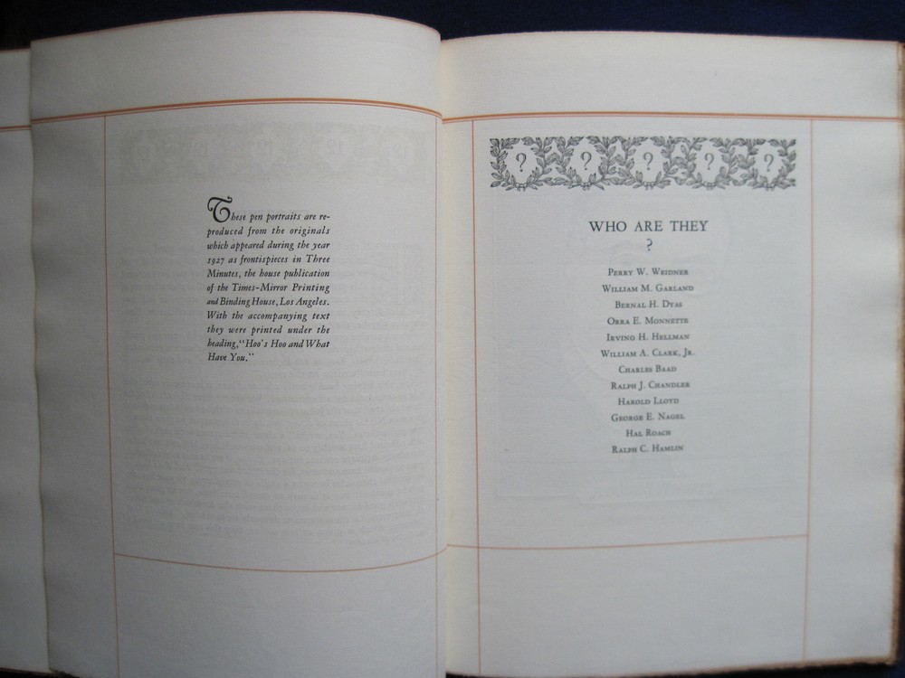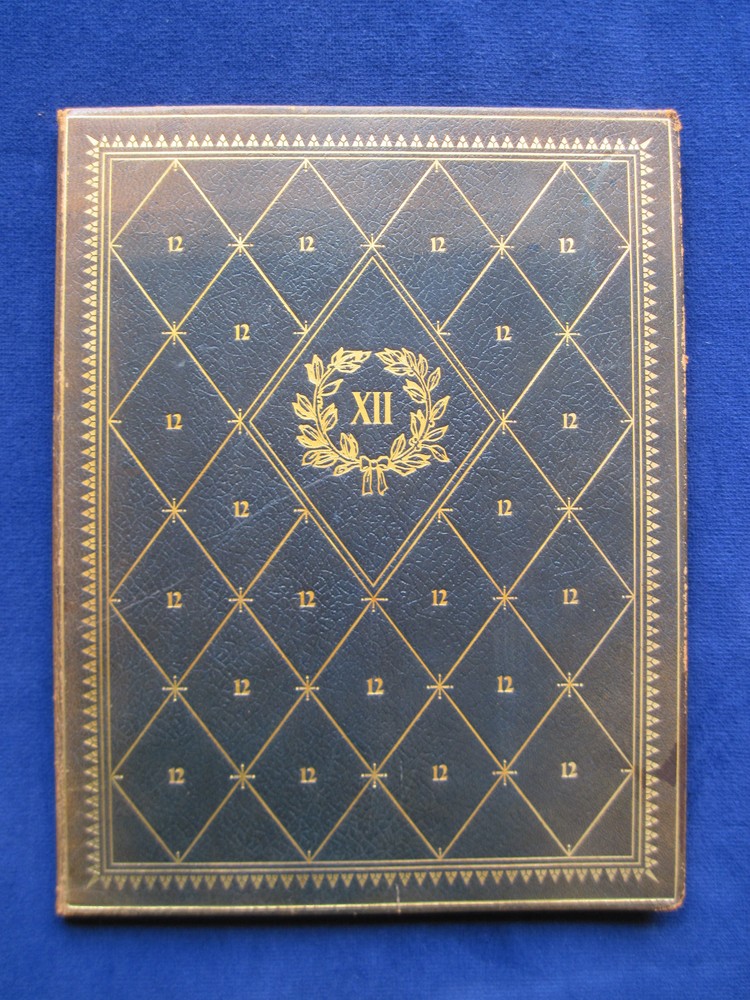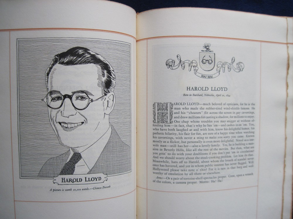 [LLOYD, HAROLD]. Twelve Good Men and True . Los Angeles: Times-Mirror, 1927. First Edition. One of a limited edition of 75 numbered copies. Presentation copy signed by the printer and publisher: “Sim W. Crabill,” to silent film actor Harold Lloyd who is one of the men honored in the text. Beautifully printed on heavy fine watermarked paper, intended for private distribution. With moire covered interior and full brown morocco and gilt stamped binding. Near fine with a touch of sunning to the spine and upper edge of the front cover and with a bit of edge wear. A collection of twelve pen portraits with text which first appeared in 1927 as frontispieces under the heading “Hoo’s Hoo and What Have You” in Three Minutes, the house publication of the Times-Mirror Printing and binding house in Los Angeles. In addition to Harold Lloyd, the group of distinguished men includes film director Hal Roach, Perry W. Weidner, president of the United States National Bank, William May Garland, president of thee Los Angeles Athletic Club, Ralph J. Chandler, of the Los Angeles Steamship Company, William Andrews Clark, Jr., etc.