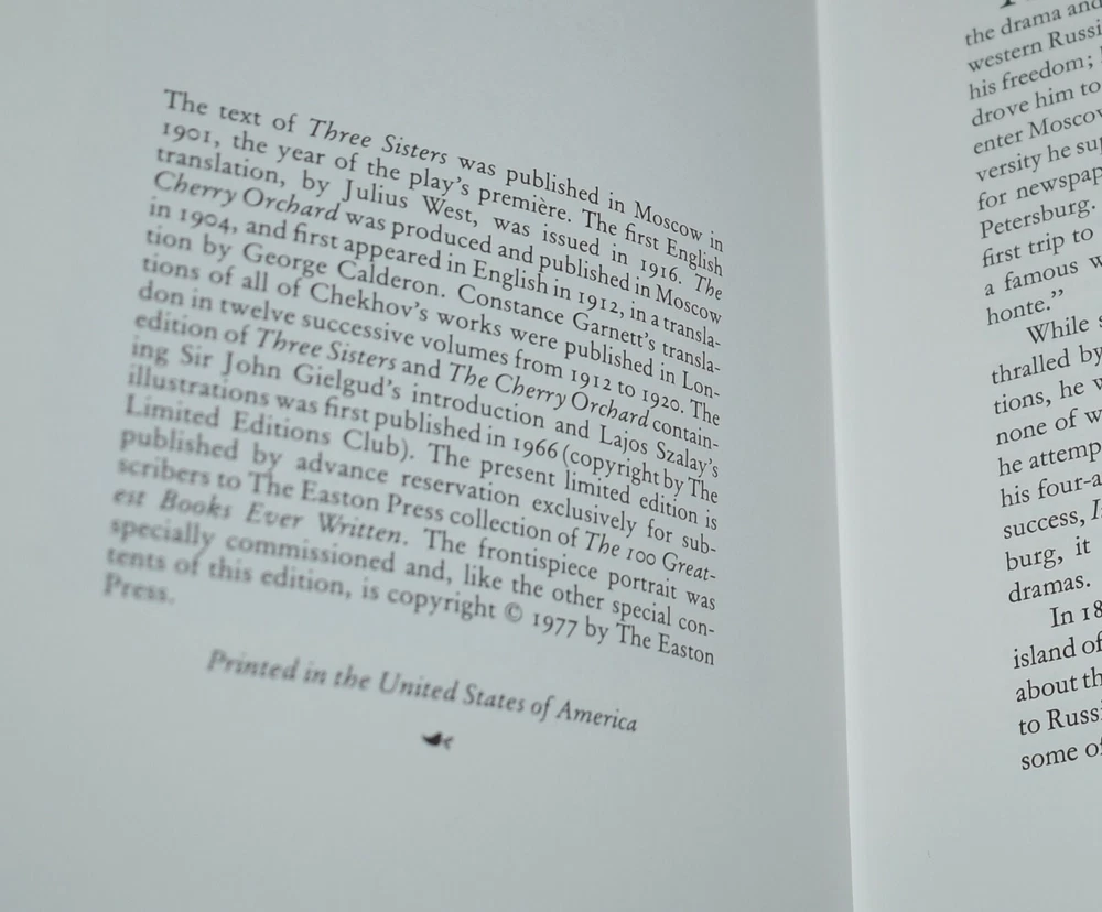 Two Plays Of Anton Chekhov Cherry Orchard & Three Sisters Easton Press In great condition, bought then placed on my bookshelf for decades. Please see my many photos. Check out my many other listings, ...