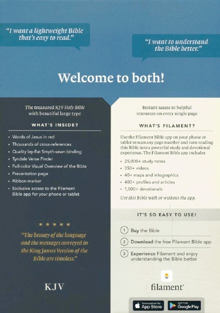 The Bible Reading Experience: Reimagined The new Tyndale classic KJV Large Print Thinline Reference Bible, Filament-Enabled Edition has readable text, an attractive layout, and cross-references in a thin, easy-to-carry size. And while it has the same low price as basic text-only Bibles, the KJV Large Print Thinline Reference offers much more. It not only features a bold new design and the revered King James Version (KJV) but also includes the groundbreaking Filament Bible app. This app enables you to use your mobile phone or tablet to connect every page to a vast array of related content, including study notes, devotionals, interactive maps, informative videos, and worship music.The Filament Bible app turns this Bible into a powerful study and devotional experience, offering more to expand your mind and touch your heart than you can possibly hold in your hand. And there is no additional cost for the Filament Bible app. No additional purchase. No additional size or weight. Of course, you can use this Bible without the app, but when you want to dig deeper, grab your phone or tablet and open the Filament Bible app. It's so easy to use. Features: New designs and Filament content for each page Readable large print Handy thin size Words of Jesus in red Thousands of cross-references Quality lay-flat Smyth-sewn binding Tyndale Verse Finder Presentation page Ribbon marker Gilded page edges Filament Bible app with free access to: 25,000 study notes 350+ videos 40+ maps and infographics 400+ profiles and articles 1,500+ devotionals Library of worship music, The Bible Reading Experience: Reimagined The new Tyndale classic KJV Large Print Thinline Reference Bible, Filament-Enabled Edition has readable text, an attractive layout, and cross-references in a thin, easy-to-carry size. And while it has the same low price as basic text-only Bibles, the KJV Large Print Thinline Reference offers much more. It not only features a bold new design and the revered King James Version (KJV) but also includes the groundbreaking Filament Bible app. This app enables you to use your mobile phone or tablet to connect every page to a vast array of related content, including study notes, devotionals, interactive maps, informative videos, and worship music.The Filament Bible app turns this Bible into a powerful study and devotional experience, offering more to expand your mind and touch your heart than you can possibly hold in your hand. And there is no additional cost for the Filament Bible app. No additional purchase. No additional size or weight. Of course, you can use this Bible without the app, but when you want to dig deeper, grab your phone or tablet and open the Filament Bible app. It's so easy to use. Features: New designs and Filament content for each page! Readable large print Handy thin size Words of Jesus in red Thousands of cross-references Quality lay-flat Smyth-sewn binding Tyndale Verse Finder Presentation page Ribbon marker Gilded page edges Filament Bible app with free access to: 25,000 study notes 350+ videos 40+ maps and infographics 400+ profiles and articles 1,500+ devotionals Library of worship music |