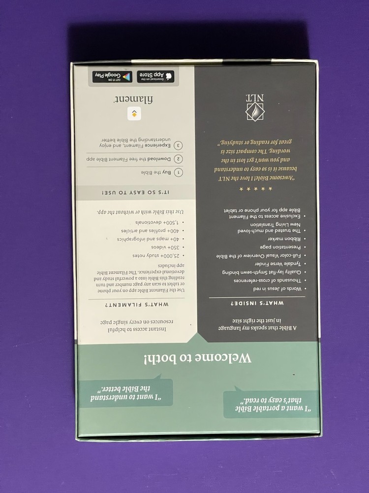 Your Bible Reading Experience: Reimagined The Tyndale NLT Thinline Reference Bible, Filament-Enabled Edition has readable text, an attractive layout, and cross-references in a thin, easy-to-carry size. And while it has the same low price as basic text-only Bibles, the NLT Thinline Reference offers much more. It not only features a bold new design and the clear and accurate New Living Translation (NLT) but also includes the groundbreaking Filament Bible app. This app enables you to use your smartphone or tablet to connect every page to a vast array of related content, including study notes, audio Bibles, devotionals, interactive maps, informative videos, and worship music.The NLT Thinline Reference Bible, Filament-Enabled Edition is perfect for those looking for a portable Bible with access to a wealth of resources at your fingertips.Special Features of this NLT Bible include: Filament content for each page! Handy thin size Words of Jesus in red Thousands of cross-references Quality lay-flat Smyth-sewn binding Tyndale Verse Finder Presentation page Ribbon marker Gilded page edges Elevate Your Bible Study with the Filament App--Absolutely Free! Unlock a world of knowledge and inspiration right at your fingertips! The Filament Bible app is your gateway to a deeper, more enriching Bible-study experience. Seamlessly connect every page of your Bible to a treasure trove of resources, including: 25,000+ study notes by more than 40 scholars offering a deeper understanding of what you're reading audio Bibles to immerse you in God's Word anytime and anywhere 350+ videos to captivate you as you unpack key information about the background and meaning of the Bible 40+ maps and infographics explaining the geography and cultural background of the Bible 400+ profiles and articles revealing the people and stories behind the Scripture verses, enriching your connection with the text 1,500+ devotions providing daily inspiration and numerous opportunities for reflection a library of worship music offering the perfect soundtrack for personal study and worship Ready to dive deeper? Just grab your smartphone or tablet, open Filament, and let the learning begin. It's simple, convenient, and extremely enriching. Start your enhanced Bible journey today!The New Living Translation is a clear and accurate English translation of the Bible. It's easy to understand, and it conveys the precise meaning of the original languages in a flowing, effortless writing style that promotes comfortable and meaningful reading. |