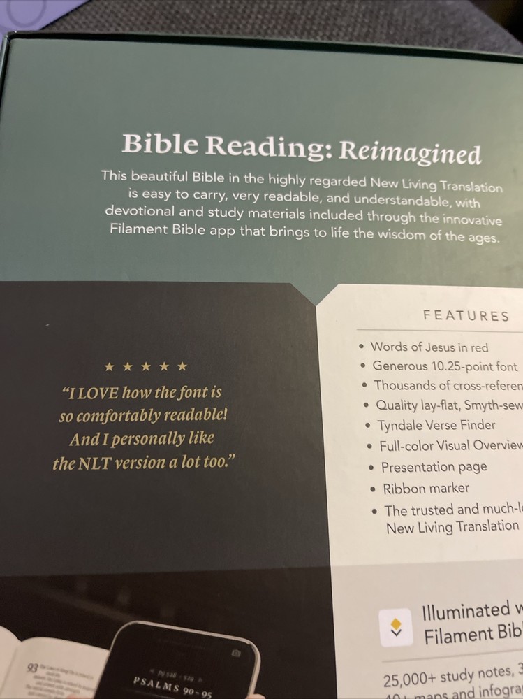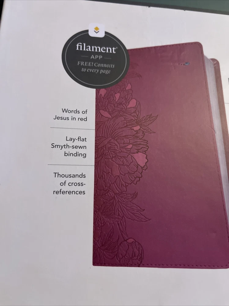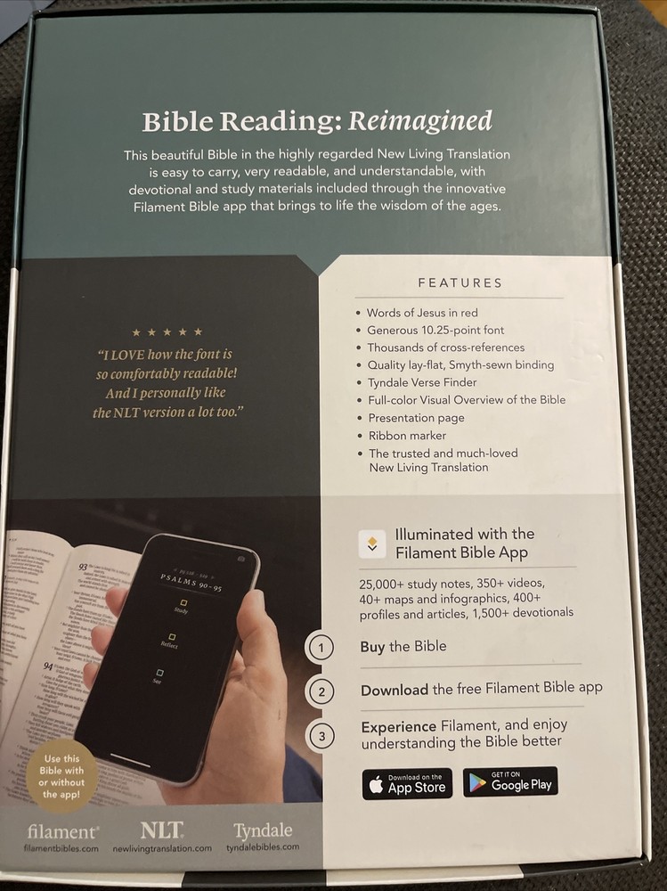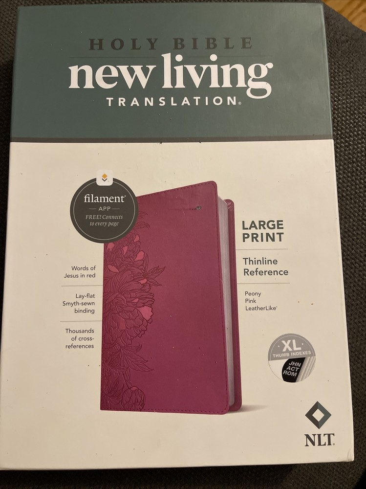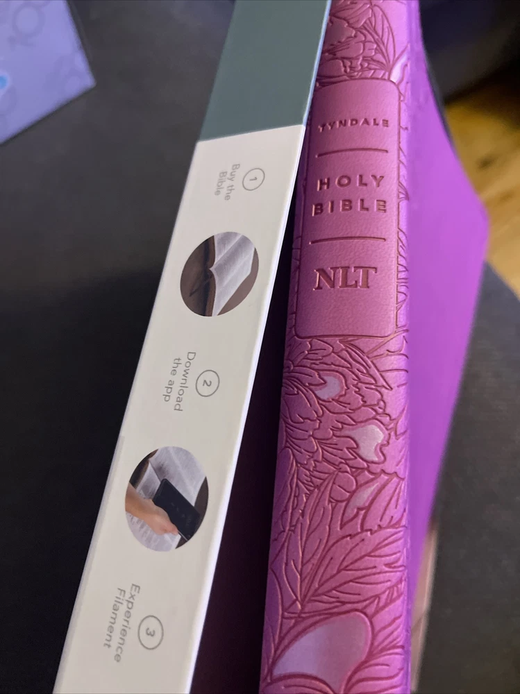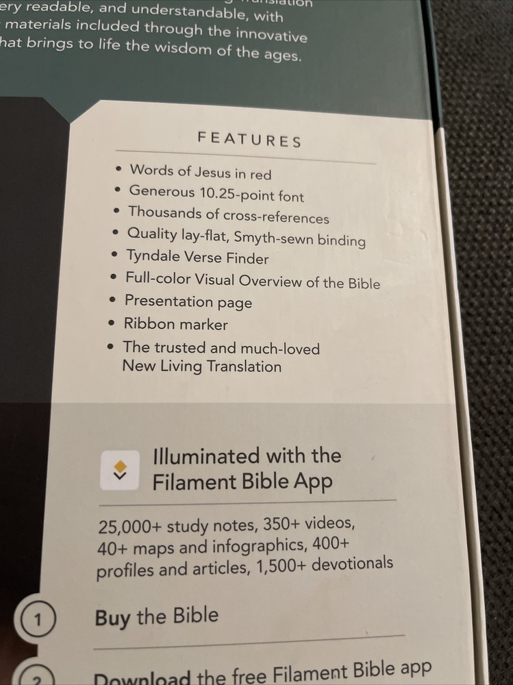 The Bible Reading Experience: Reimagined The new Tyndale classic NLT Large Print Thinline Reference Bible, Filament-Enabled Edition has readable text, an attractive layout, and cross-references in a thin, easy-to-carry size. And while it has the same low price as basic text-only Bibles, the NLT Large Print Thinline Reference offers much more. It not only features a bold new design and the trusted and much-loved New Living Translation (NLT) but also includes the groundbreaking Filament Bible app. This app enables you to use your mobile phone or tablet to connect every page to a vast array of related content, including study notes, devotionals, interactive maps, informative videos, and worship music.The Filament Bible app turns this Bible into a powerful study and devotional experience, offering more to expand your mind and touch your heart than you can possibly hold in your hand. And there is no additional cost for the Filament Bible app. No additional purchase. No additional size or weight. Of course, you can use this Bible without the app, but when you want to dig deeper, grab your phone or tablet and open the Filament Bible app. It's so easy to use. Features: New designs and Filament content for each page! Readable large print Handy thin size Words of Jesus in red Thousands of cross-references Quality lay-flat Smyth-sewn binding Tyndale Verse Finder Presentation page Ribbon marker Gilded page edges Filament Bible app with free access to: 25,000 study notes 350+ videos 40+ maps and infographics 400+ profiles and articles 1,500+ devotionals Library of worship music, Your Bible Reading Experience: Reimagined The Tyndale NLT Large Print Thinline Reference Bible, Filament-Enabled Edition has readable text, an attractive layout, and cross-references in a thin, easy-to-carry size. And while it has the same low price as basic text-only Bibles, the NLT Large Print Thinline Reference offers much more. It not only features a bold new design and the clear and accurate New Living Translation (NLT) but also includes the groundbreaking Filament Bible app. This app enables you to use your smartphone or tablet to connect every page to a vast array of related content, including study notes, audio Bibles, devotionals, interactive maps, informative videos, and worship music.The Filament Bible app turns this Bible into a powerful study and devotional experience, offering more to expand your mind and touch your heart than you can possibly hold in your hand.Special Features of this NLT Bible include: Filament content for each page! Readable large print Handy thin size Words of Jesus in red Thousands of cross-references Quality lay-flat Smyth-sewn binding Tyndale Verse Finder Presentation page Ribbon marker Gilded page edges Elevate Your Bible Study with the Filament App--Absolutely Free! Unlock a world of knowledge and inspiration right at your fingertips! The Filament Bible app is your gateway to a deeper, more enriching Bible-study experience. Seamlessly connect every page of your Bible to a treasure trove of resources, including: 25,000+ study notes by more than 40 scholars offering a deeper understanding of what you're reading audio Bibles to immerse you in God's Word anytime and anywhere 350+ videos to captivate you as you unpack key information about the background and meaning of the Bible 40+ maps and infographics explaining the geography and cultural background of the Bible 400+ profiles and articles revealing the people and stories behind the Scripture verses, enriching your connection with the text 1,500+ devotions providing daily inspiration and numerous opportunities for reflection a library of worship music offering the perfect soundtrack for personal study and worship Ready to dive deeper? Just grab your smartphone or tablet, open Filament, and let the learning begin. It's simple, convenient, and extremely enriching. Start your enhanced Bible journey today!The New Living Translation is a clear and accurate English translation of the Bible. It's easy to understand, and it conveys the precise meaning of the original languages in a flowing, effortless writing style that promotes comfortable and meaningful reading. |