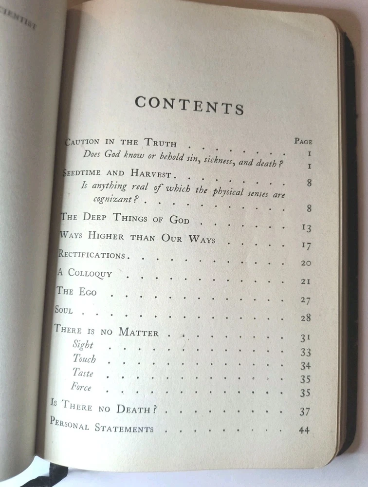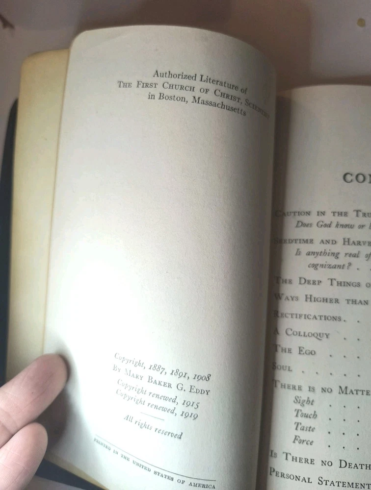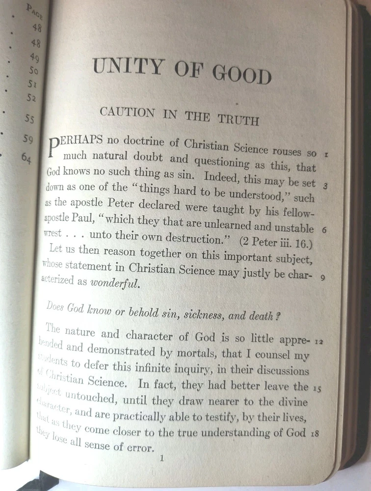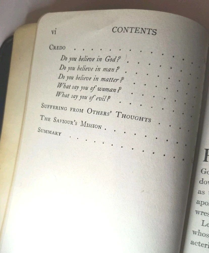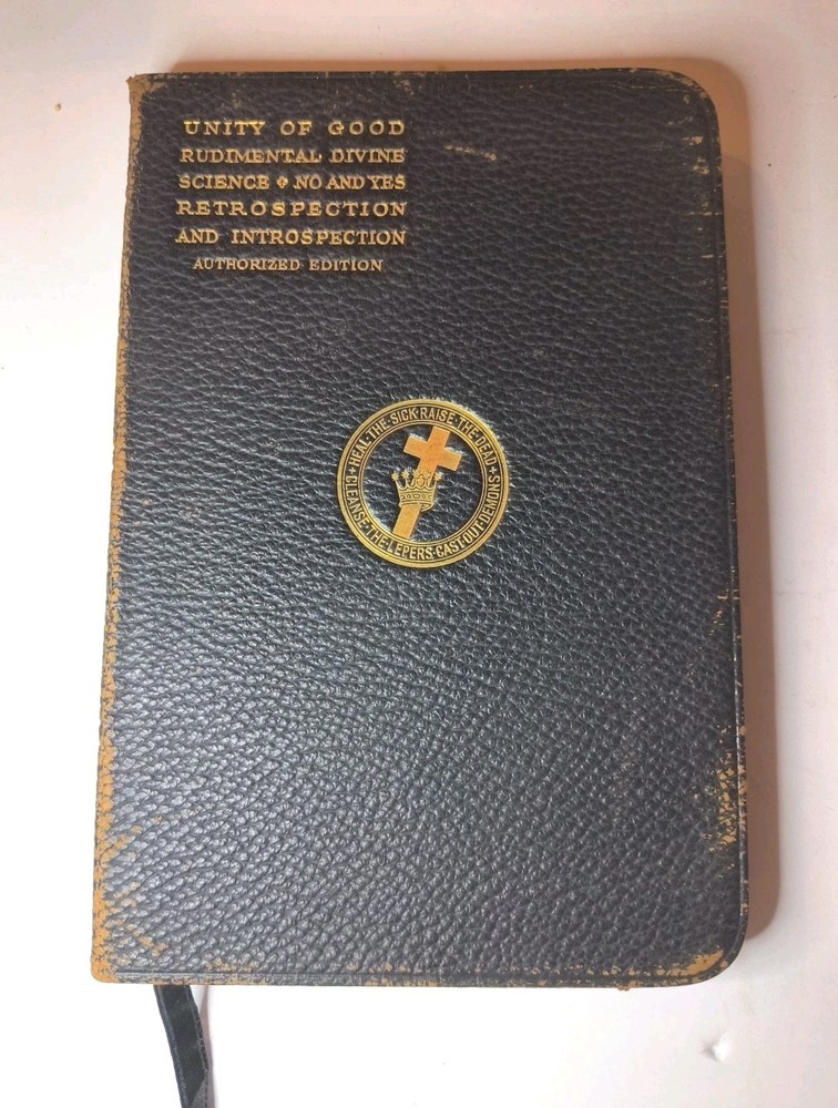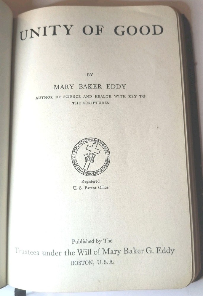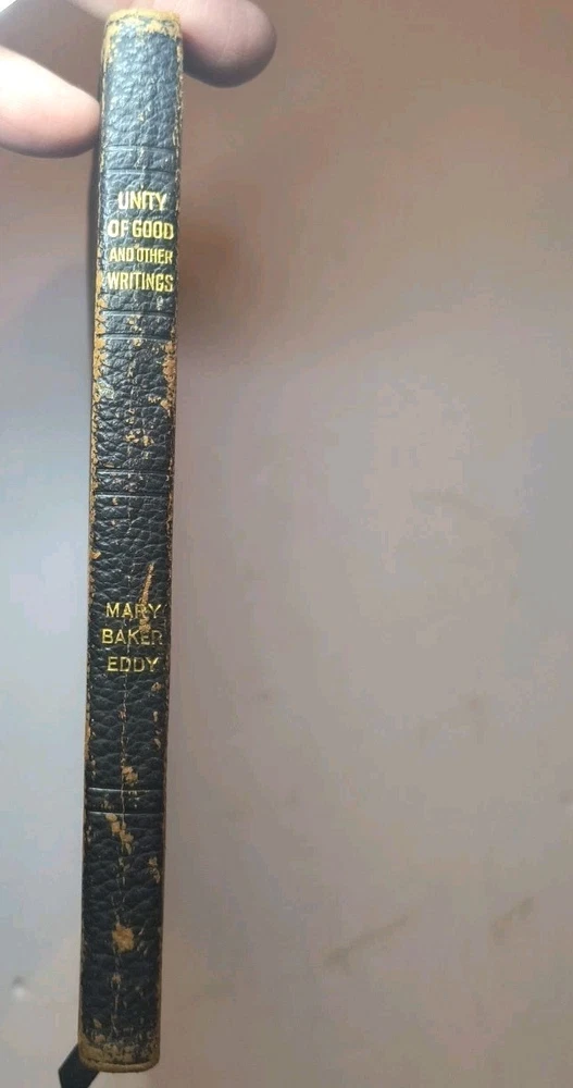 "UNITY OF GOOD" by Mary Baker Eddy is a vintage book published by the author herself in Boston. This leather-bound book falls under the religion topic and contains poems written by the author in English. The book is a collectible item from North America, with a special attribute of being an original vintage paperback. It is a valuable piece for those interested in Mary Baker Eddy's work and religious texts. Clean and unmarked text and end papers Worn cover