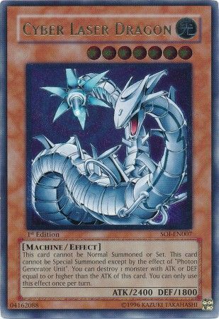 Home Products About Add Us Feedback Contact Us Ultimate Rare - Cyber Laser Dragon - SOI-EN007 1st Edition Product Description Ultimate Rare - Cyber Laser Dragon - SOI-EN007 1st Edition Shadow of Infinity was the 18th expansion of the Yugioh TCG. It was released in February of 2006 and consisted of 85 cards total. Noteworthy cards from Shadow of Infinity include Cyber Laser Dragon, Demise, King of Armageddon & Treeborn Frog. The 3 “Sacred Beasts” from the Yu-Gi-Oh GX anime were released in this set. Also included are: many Insect-Type monsters, new Ritual Monsters, and support for “Cyber Dragon” and “Ancient Gear” archetypes. Released along with this set was the Shadow of Infinity: Special Edition set. Shadow of Infinity consists of the following rarity breakdown: 35 Commons 14 Rares 7 Super Rares 4 Ultra Rares 25 Ultimate Rares Condition: Lightly played (Excellent) Additional Information When Shipments Are Made Shipments are made within the 2-3 business days of payment being received. Payments Payments must be received within 3 days of purchasing this item. Our Hours We are open from Monday to Friday 9 a.m. to 5 p.m. EST. If you have questions, please send us an eBay message. Our customer service representatives make every effort to answer your emails within 24 hours of being received. Our offices are closed on public holidays. International Buyers - Please Note: Import duties, taxes, and charges are not included in the item price or shipping cost. These charges are the buyer's responsibility. Please check with your country's customs office to determine what these additional costs will be prior to bidding or buying. Auction format and description, in-house images and in-house photos © 2025 and ™ Troll and Toad Enterprises All rights reserved.