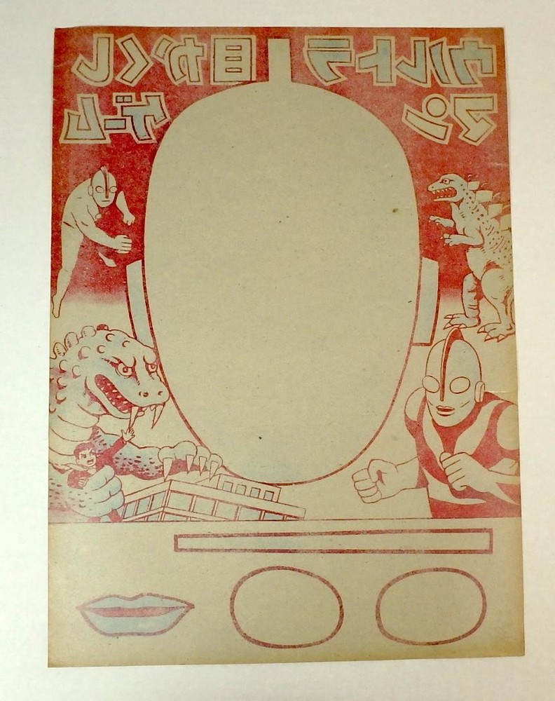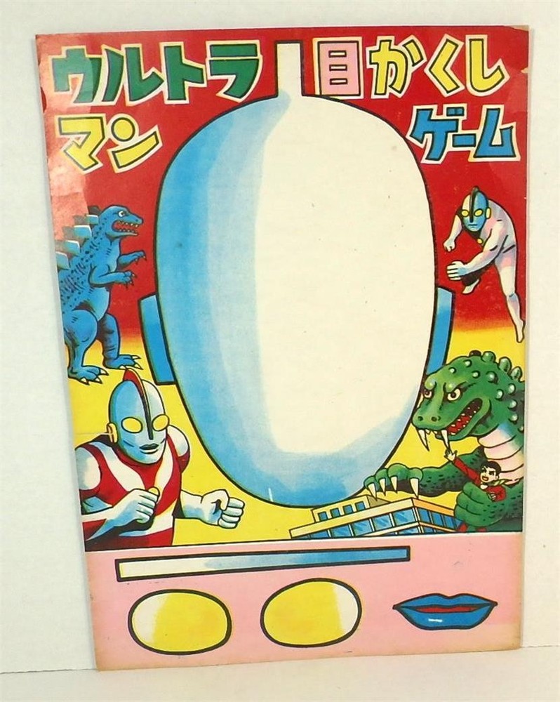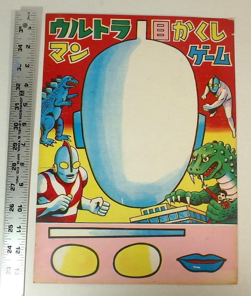 This vintage Japanese light cardboard game sheet is a fukuwarai (pin the features on the face) game. It is old but unused. The features that you pin on the face are still uncut at the bottom of the game sheet. The light weight cardboard has a slight sheen to the surface. Colorful imges of Ultraman, Godzilla and another blue monster are seen along with the featureless Ultraman face. The game is 9.75 inches ( cm) wide and 13.5 inches ( cm) tall. Condition is very good with only a bit of missing paper and two small edge tears near the upper right corner. Combined shipping is available for this item, and most of my items. I normally accept returns if an item is not as described but 14 days is too long so I have selected No Returns. However, if you have a problem with your purchase please contact me IMMEDIATELY and I'm sure we can work something out. I am sorry, but I no longer ship internationally when items are sold on eBay. Pictures sell! Auctiva offers Free Image Hosting and Editing. The complete eBay Selling Solution. Track Page Views With Auctiva's Counter