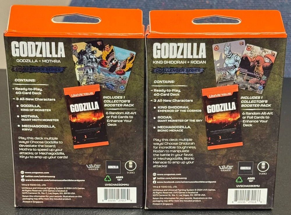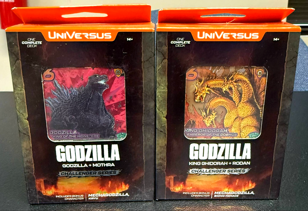 ITEM DESCRIPTION You are buying a set of 2 Universus Starter Decks that were produced by UVS Games in 2024. This set includes the Godzilla + Mothra deck and the King Ghidorah + Rodan deck. Each deck also has a collector booster pack inside. This set of decks are sealed and comes directly from our inventory. We have other Universus items listed so check those out. ABOUT US We are a 7,000 square foot comic book entertainment store located in Southwest Indiana in Evansville. We have been in business for over 28 years and strive hard to achieve a high level of customer service. If, for any reason, you have questions after you've received the item, don't just leave negative feedback. Please contact us with any issues, concerns, or problems. Communication is important to us, and we will do everything we can to make your purchase a pleasant one from start to finish. Visit Comic Quest eBay Store & Online Auctions for the other nice comics, exclusives and other unique items. We do combine shipping cost to save you money but please remember to contact us prior to paying so we can make sure you received your shipping discount. Bid now!! GET IT NOW BEFORE ITS GONE! * Terms: Bids from International Bidders will not be accepted unless special arrangements can be made, please inquiry before bidding.PayPal only and all major credit cards. SHIPPING * Buyer is responsible for contacting seller if buyer has a change of address or if there is a conflict between buyer's listed eBay mailing address and Paypal mailing address. We are not responsible for merchandise lost due to address changes once merchandise has been shipped. * Combined shipping is available if bidding on multiple auctions from comicquest.com, it is the buyer's responsible to contact us via email before paying for any of the auctions to receive the combined shipping discount. * Buyer agrees to pay shipping and handling to anywhere in the United States, unless otherwise noted or requested , all domestic shipments will be sent using the United States Post Office. International winners MUST contact us prior to bidding to receive USPS Priority Mail quote and all international shipments will be sent using using some form of priority shipping. SHIPPING UPDATE! PLEASE READ! DUE TO CURRENT STATUS OF THE UNITED STATES POSTAL SERVICE, SOME SHIPMENTS MAY BE DELAYED. WE CAN'T PROMISE ANDY SHIPMENT WILL ARRIVE ON TIME. PLEASE BE PATIENT AND CHECK YOUR TRACKING NUMBER. PAYMENT * Payment is expected within 7 days of the end of the auction. * Orders usually ship within 48 hours if received Monday-Friday. If the buyer wishes to arrange insurance for an auction, it is the responsibility of the buyer to contact comicquest.com prior to paying for any auction. * International Buyers: We no longer offer International shipping due to USPS price increases and lost merchandise. If you are willing to pay for USPS International Priority Shipping which offers tracking and insurance then please contact us prior to bidding to get a shipping cost quote. * Please bid only if you are intend to complete the transaction if you win.