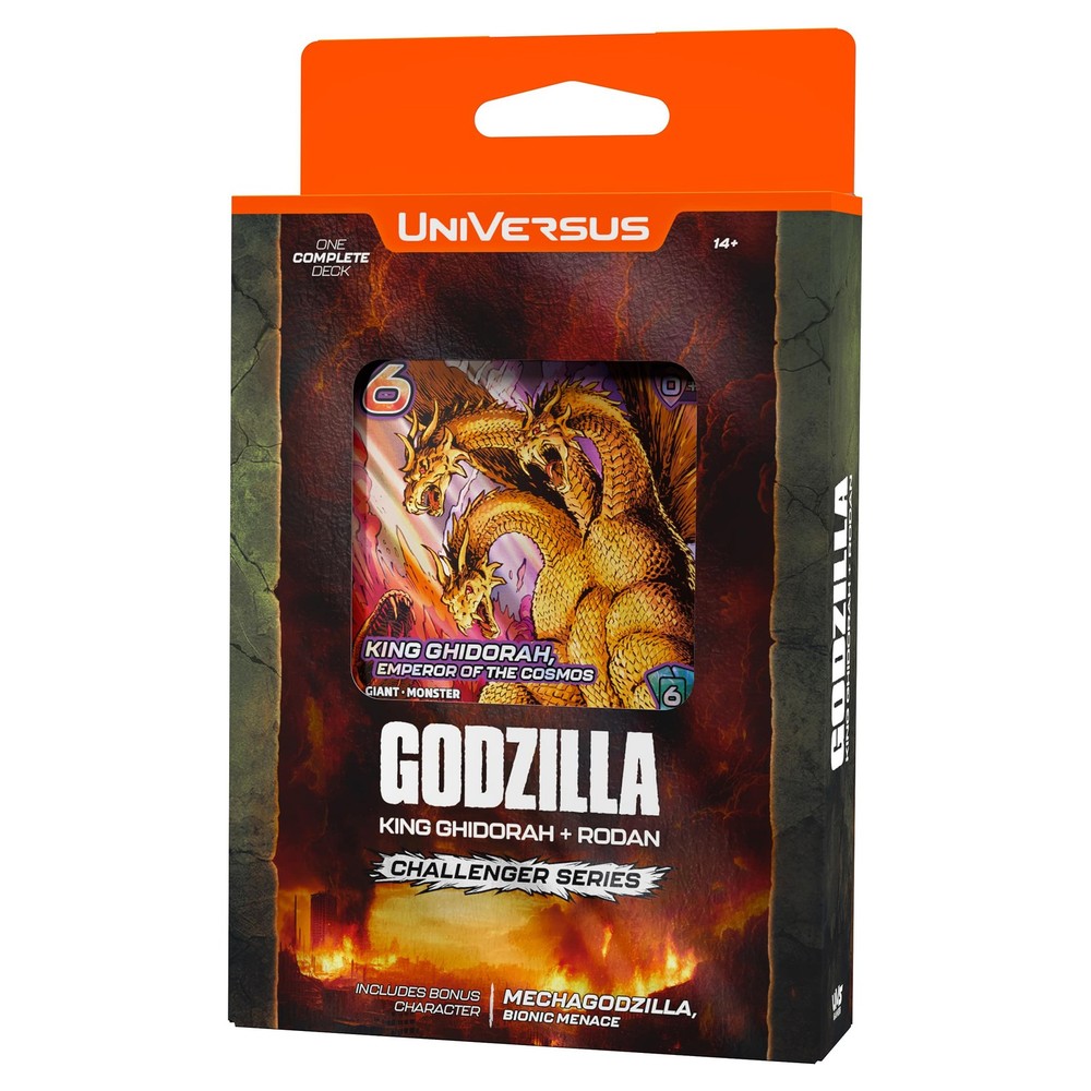 UniVersus Godzilla Challenger Series - King Ghidorah & Rodan Deck - 2 Character Decks, Ready To Play, Deck Building Card Game, Licensed, UVS Games Our eBay Store About Us Contact Us UniVersus Godzilla Challenger Series - King Ghidorah & Rodan Deck - 2 Character Decks, Ready To Play, Deck Building Card Game, Licensed, UVS Games READY TO PLAY CHALLENGER SERIES: An advanced, ready-to-play 60 card deck that includes 2 characters. BONUS CARD: Includes a bonus character Mechagodzilla, Silver King of Monsters card! FOIL CARDS: Includes a collector booster pack, featuring 6 alternate art foil cards found in this Challenger Series release 2 CHARACTER DECKS: Two primary character options give you more ways to play the deck. Included are both Godzilla and Mothra character cards BOOKLET GUIDE: Includes a booklet featuring a card checklist as well as information for new players UNIVERSUS GODZILLA CHALLENGER SERIES: KING GHIDORAH & RODAN - CHARACTER DECKS - King Ghidorah and Rodan bring mayhem and destruction! In this exciting new Challenger Series, you can use the violent power of King Ghidorah or the rage of Rodan to vanquish your foes. Included in the deck as a bonus character is Mechagodzilla, Bionic Menace! A great deck for fans of Godzilla and veteran UniVersus players alike! Includes (2) 60 card character decks. Ready to use card game decks. Features King Ghidorah & Rodan.