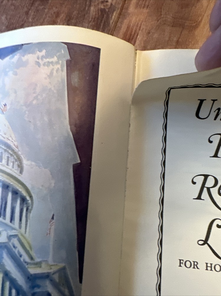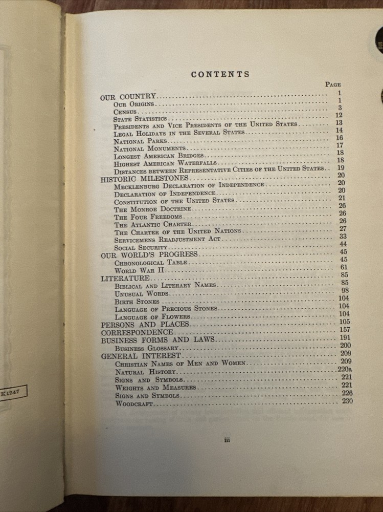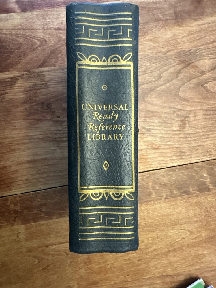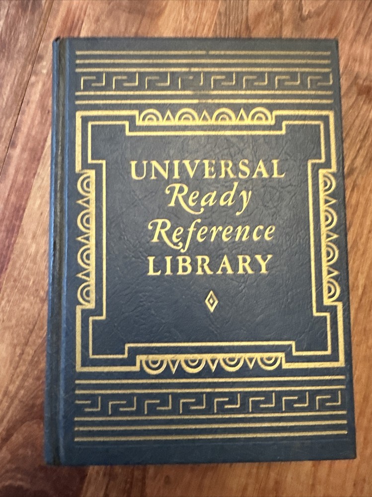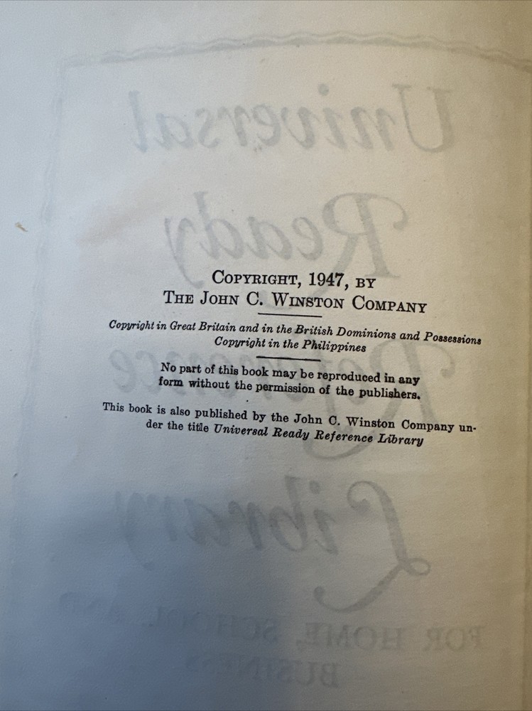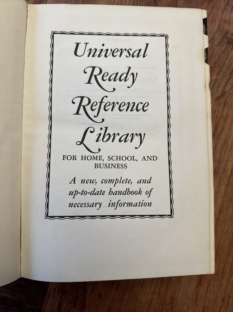 This 1947 leather bound book, titled "Universal Ready Reference Library For Home School Business". Its content covers a wide range of topics. “A complete and up to date handbook of necessary information “ for the time period it was printed in. It still has some very informative and useful information.