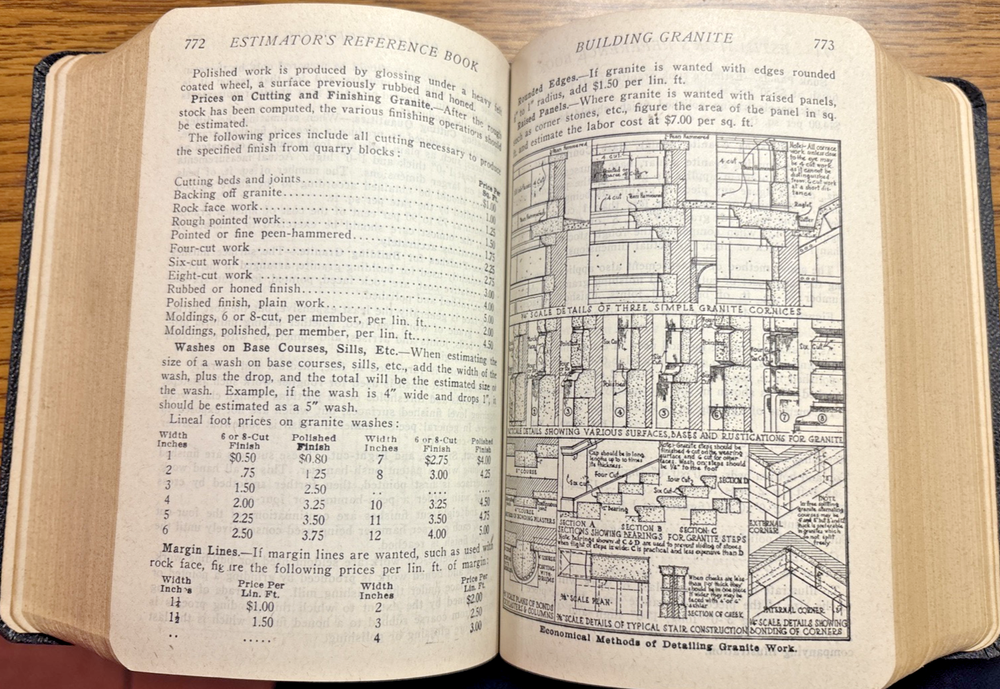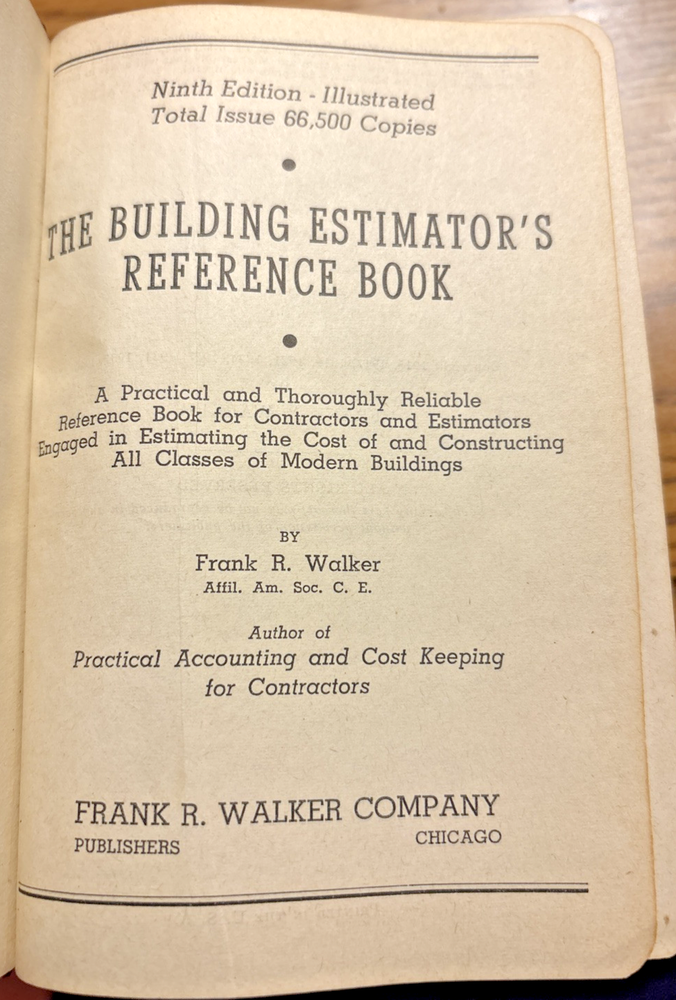 This auction is for the 1940 ninth edition of The Building Estimator's Reference Book by Frank R. Walker. In good used condition, over 1700 pages with illustrations, charts, and how to calculations. Soft, leather like cover, scuff on back cover, see photos. Contact me with any questions. FREE SHIPPING AND HANDLING US.