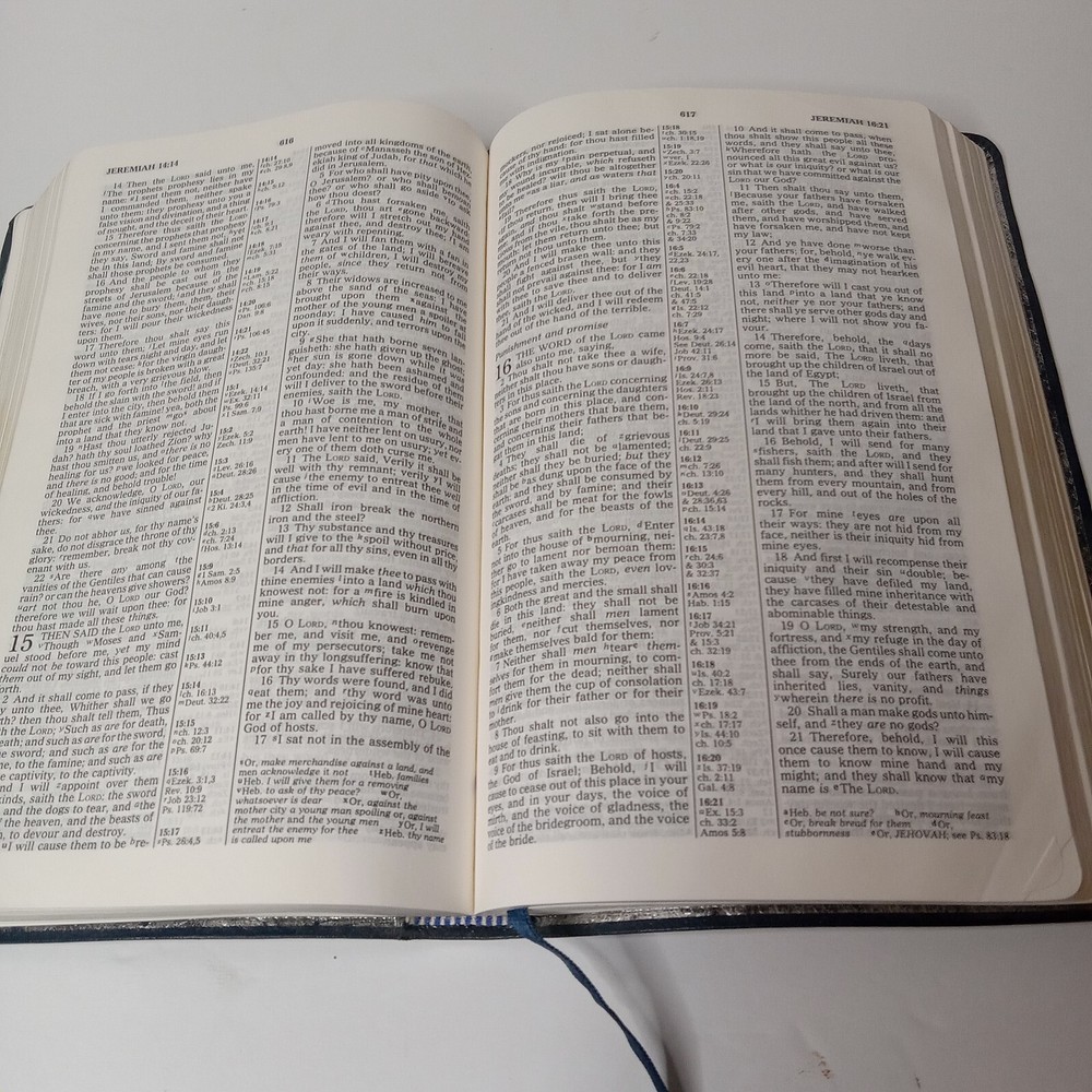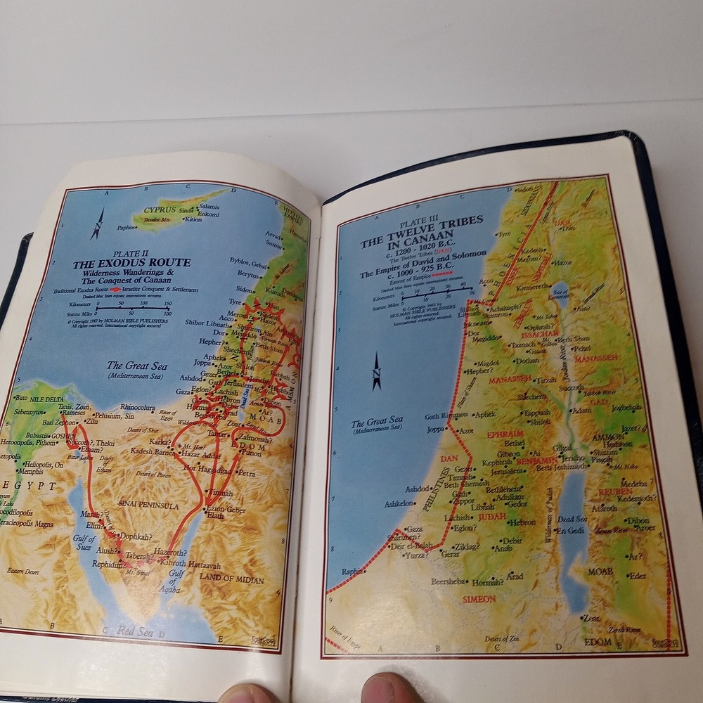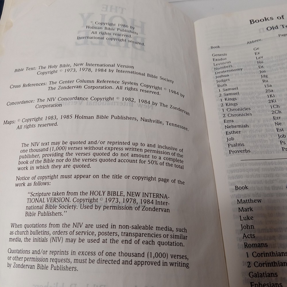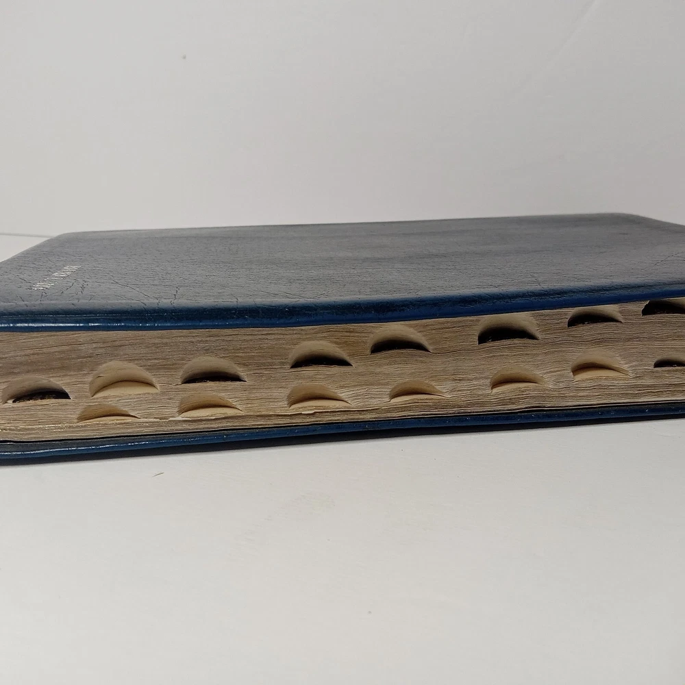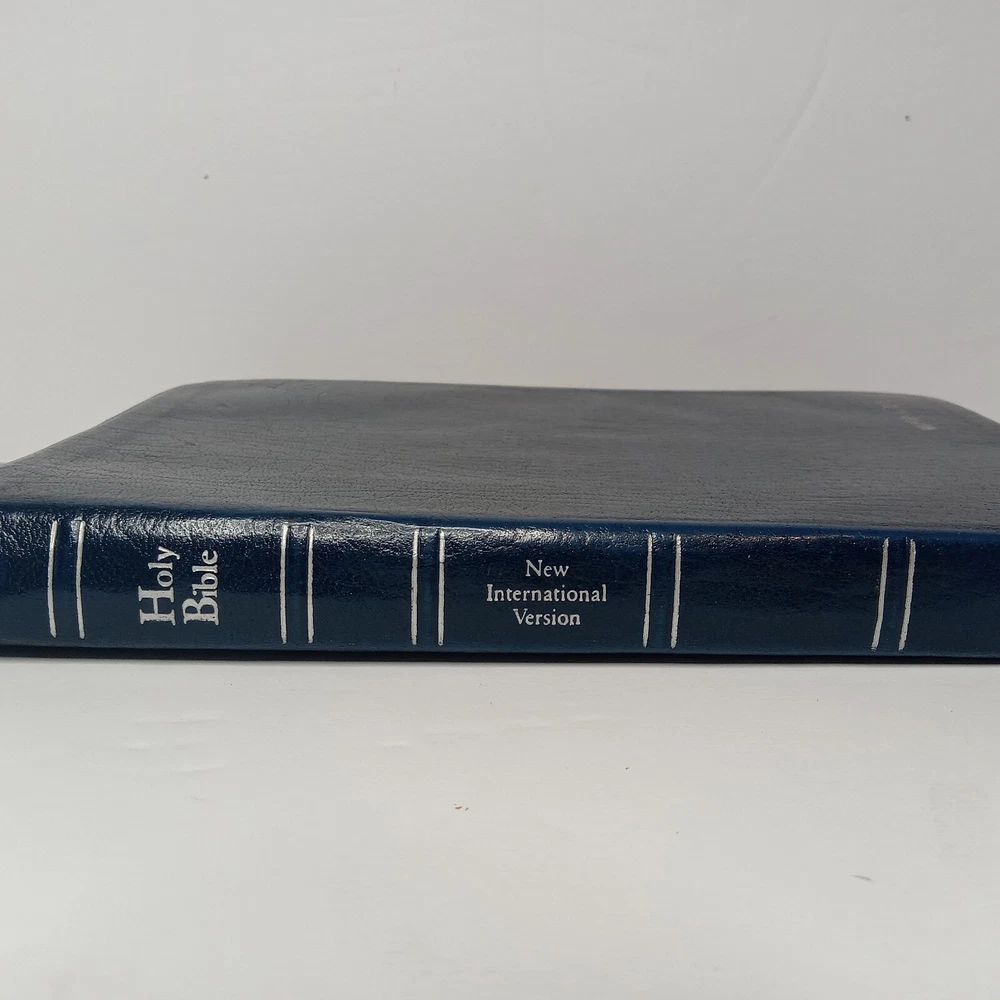This old vintage NIV 1984 Reference Bible is a must-have for any Bible collector. The blue bonded genuine leather cover with indexing makes it a beautiful addition to any bookshelf. The large print and 2080 pages make it easy to read and study. Published by Zondervan in 1986, this nonfiction narrative is written in English and belongs to the genre of Bibles. It is a New International Version / Référence Bible with a type of index format. Measuring at 9.3 inches in length, 6.4 inches in width, and 1.8 inches in height, it weighs 40.1 ounces. The book features a leather-bound cover and is categorized under "Books & Magazines" and "Books." It is well used