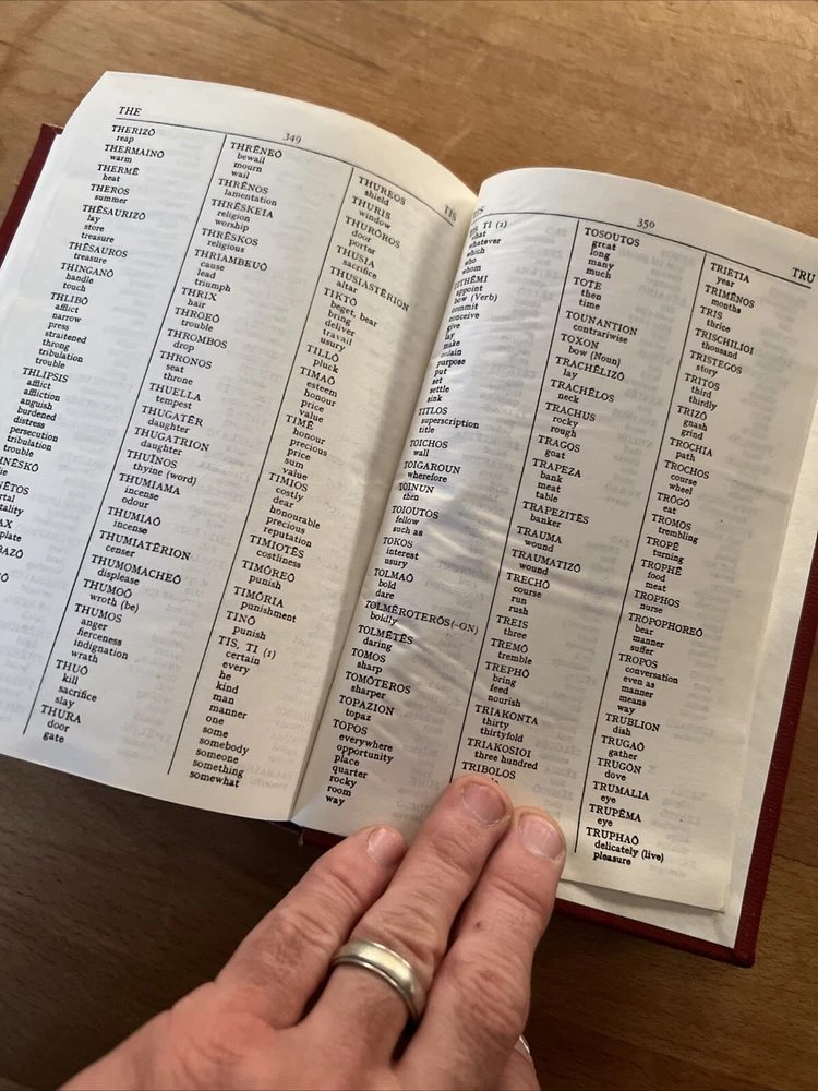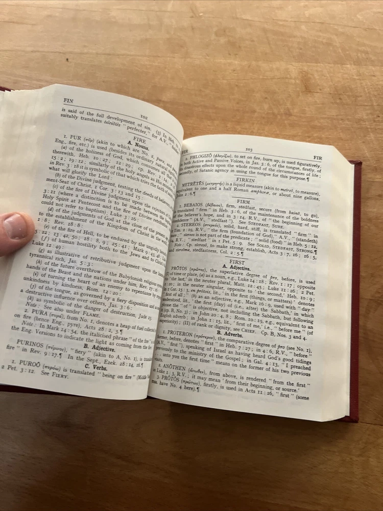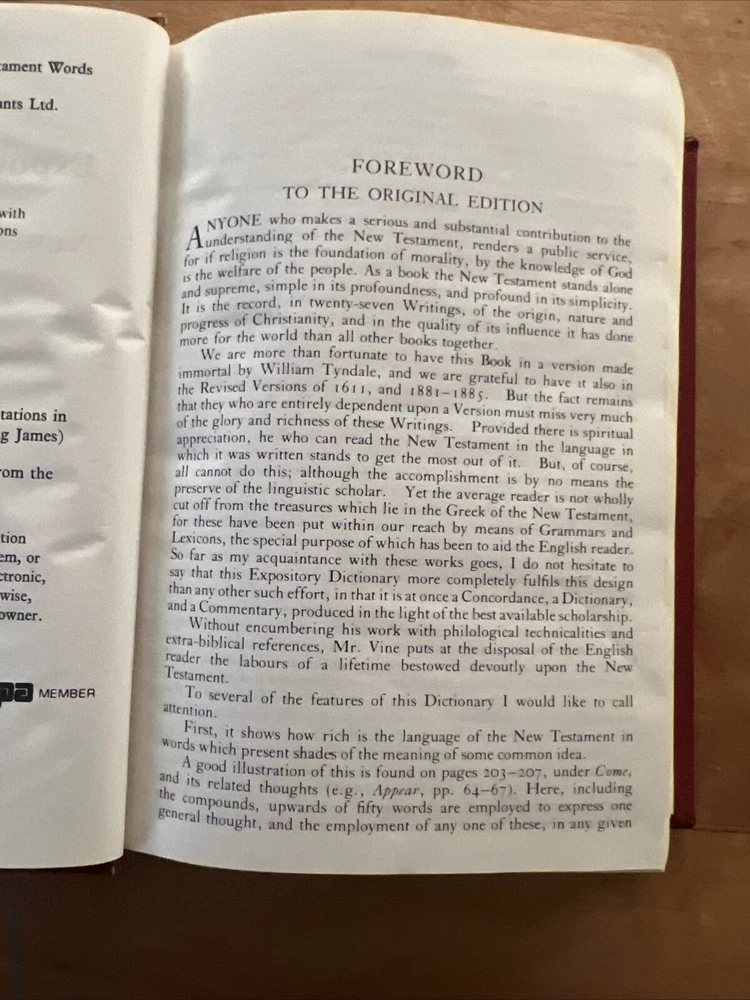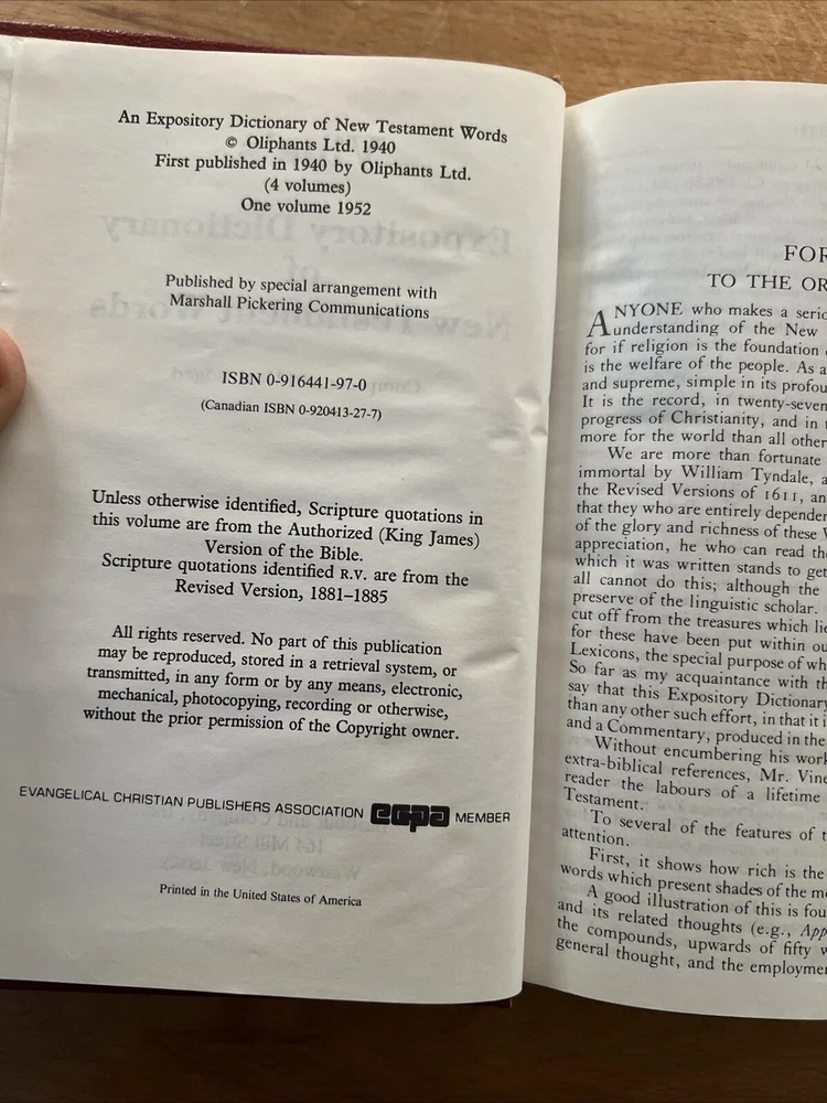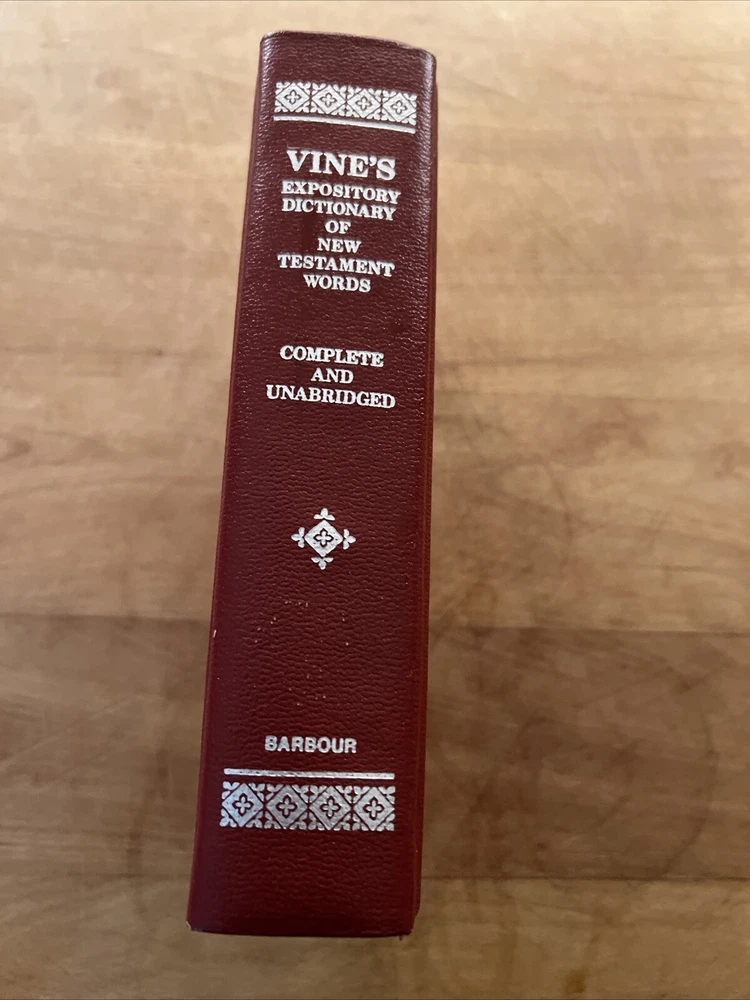 This is a vintage copy of Vine's Expository Dictionary of New Testament Words, published in 1952 by Barbour and Company, Inc. The dictionary is a collector's edition and a limited edition, with red leather binding and printed in English. It contains a Bible dictionary with special attributes for collectors and enthusiasts. The dictionary is an original copy and was not modified. It is a valuable addition to any collection of antique and collectible books. See photos