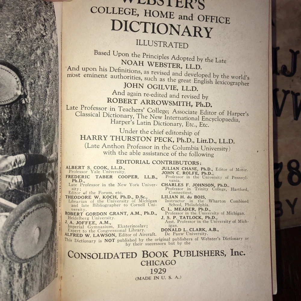 VINTAGE WEBSTERS COLLEGE HOME AND OFFICE DICTIONARY 1929 SELF-PRONOUCING. NORMAL VINTAGE WEAR HAS SMALL TEAR IN UPPER FRONT COVER,OWNERS NAME WRITTEN ON FRONT TWO PAGES. K ON BOTTOM PAGES SEE PICS. VERY INTERESTING CONTENT. ANY QUESTIONS PLEASE ASK