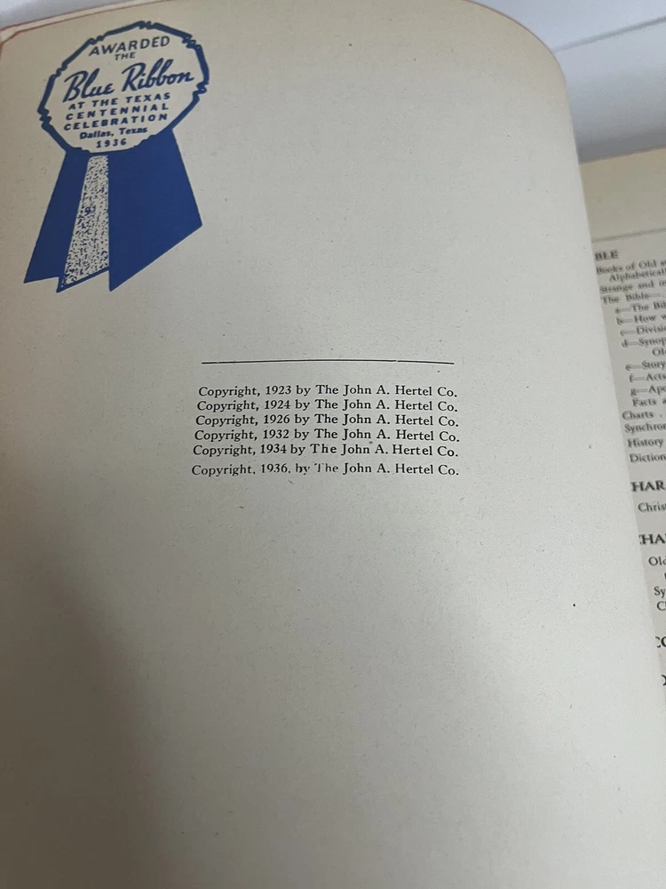1936 Holy Bible, Cyclopedic Indexed, Blue Ribbon. Hertzel printed in the USA. HEAVY, weights 7 1/2 pounds! Good used condition. See photos....