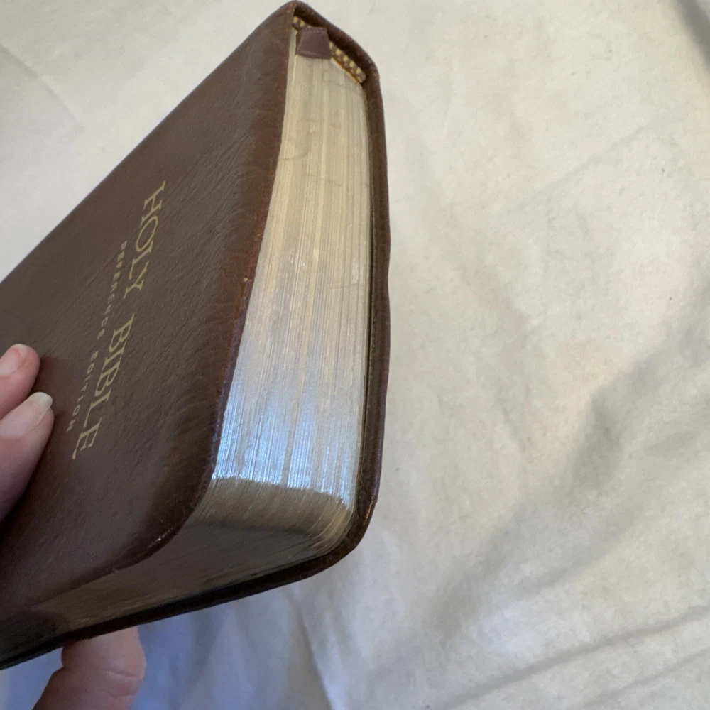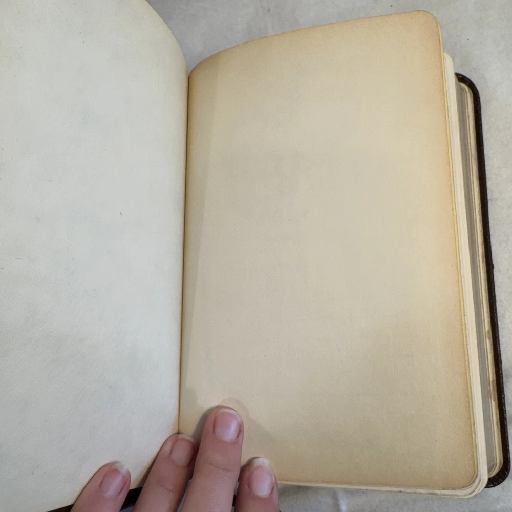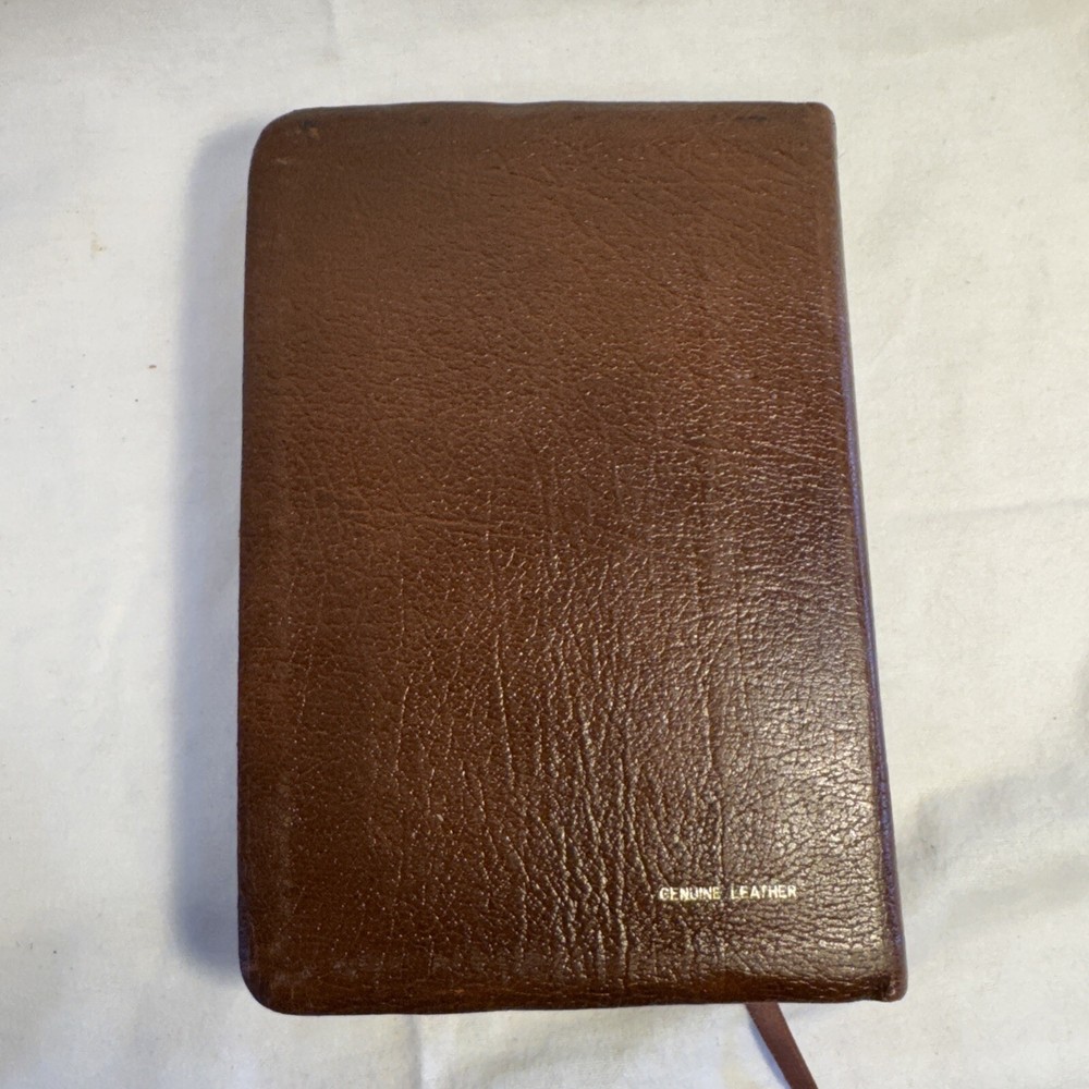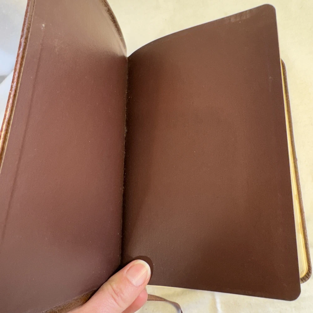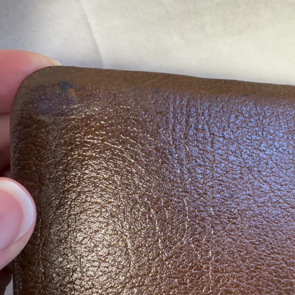 Brown, genuine leather in good condition. Measures about 5 x 7.5”. Comes as pictured.