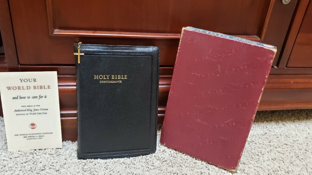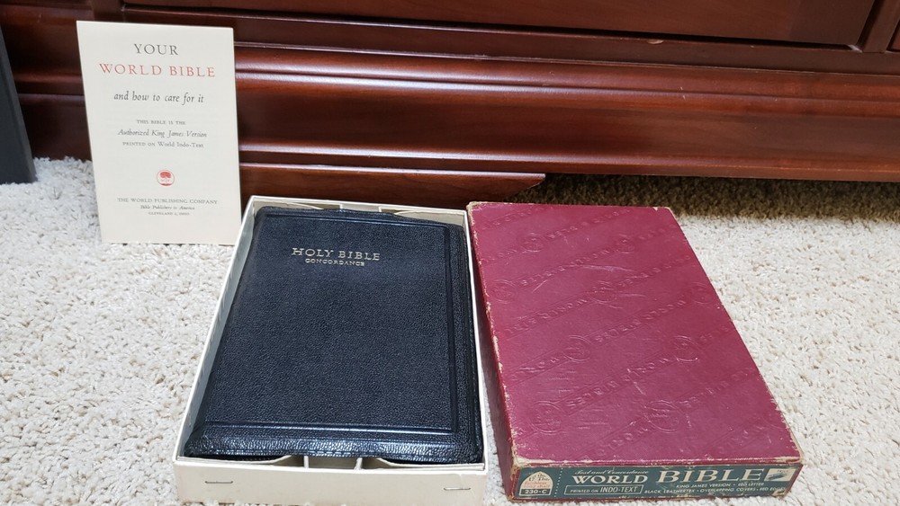 VTG KJV RED LETTER REFERENCE BIBLE WORLD PUBLISHING ZIPPER LEATHER W/ORIG BOX Condition: box has some wear, bible is in great condition, minor marks on the back cover, writing on the presented page, s...