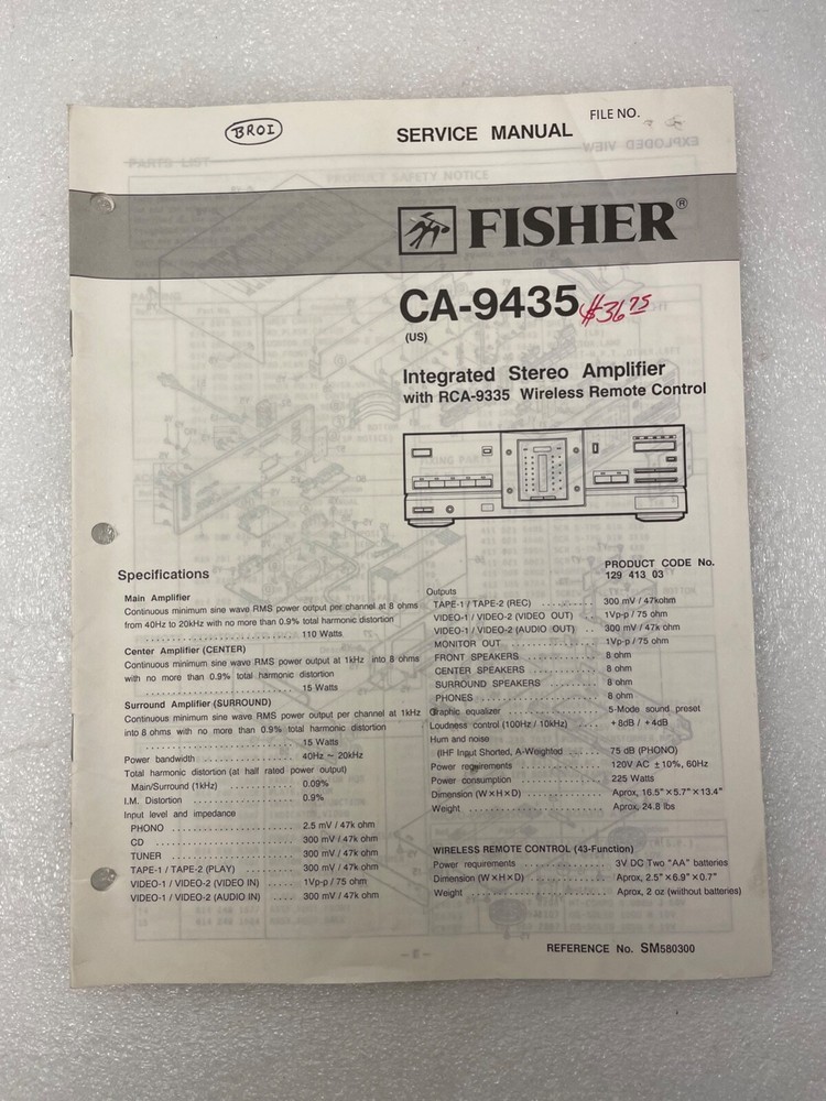 Original OEM service manual, includes, part numbers, schematics, diagrams, charts ect.. . MODEL - -V intage Original Fisher CA-9435 w/ RCA-9335 remote Integrated Stereo Amplifier Service Manual Repair 2 Condition :This is an ORIGINAL manual, not a photocopy, reprint or digital version. They may show some wear since most of these are vintage. Some have writing and notes written on the inside and outside of the manuals, mostly useful info. Some manuals have creases and edge wear due to storage. I'm currently in the process of listing an entire electronics repair shops, collection of vintage service manuals. Please click on my eBay store as I will be listing these manuals over the next several months or years!!!!! Thanks for your time and feel free to ask questions if needed. Please see all pictures for detailed description. We use the Ebay Global Shipping program for all International sales, Ebay sets the cost of global shipping, International shipping cannot be combineIf free or flat rate shipping is offered it is to the continental U.S only. All others will be calculated by zip code.We will ship to PO BOXES, APO, FPO, DPO, Puerto Rico, US Virgin Islands but buyer must contact us first as the item will need to go USPS and will more then likely occur an extra charge. Purchase limited to size and weight the USPS allows. Free Pick up is an option but payment must be made in cash upon pick up. Once payment is made we cannot cancel the order . We ship only FED EX, UPS or USPS priority Some Items may require a signature at delivery. All used items are sold AS-IS As described. We do our very best to describe the item listed. 3-113