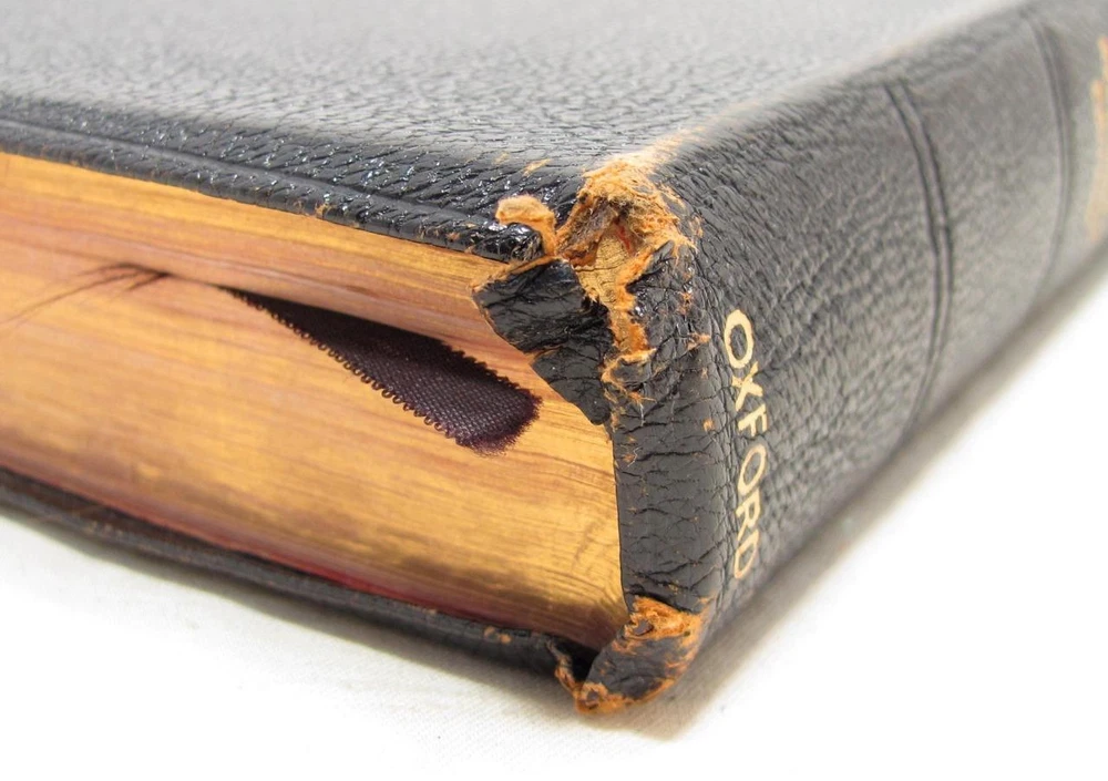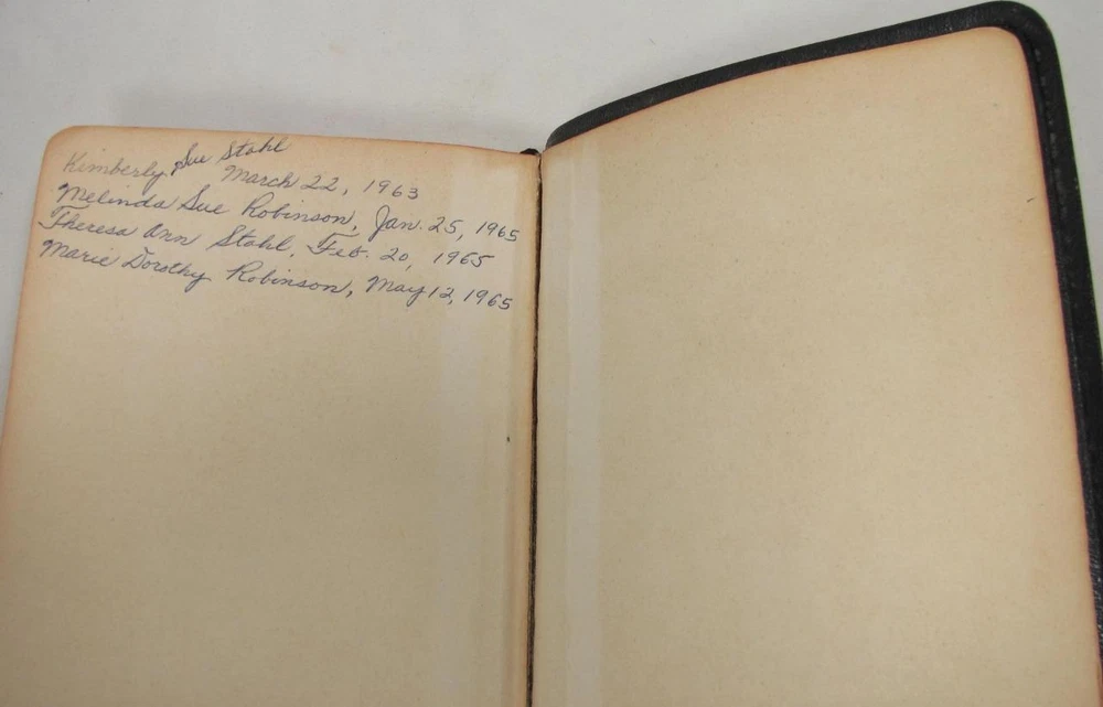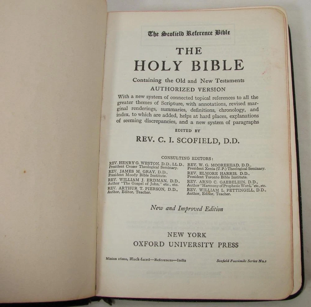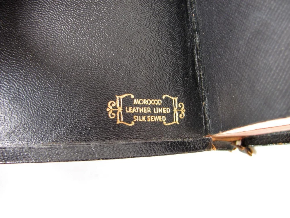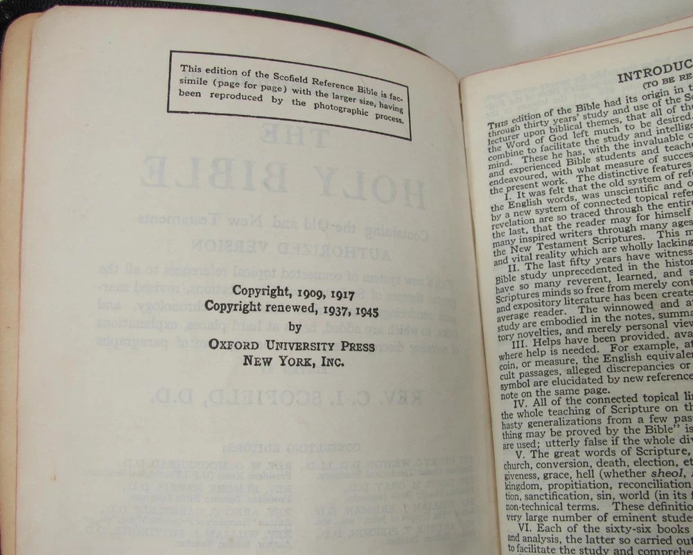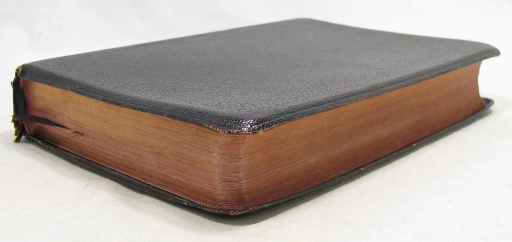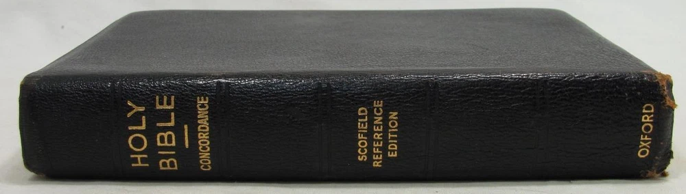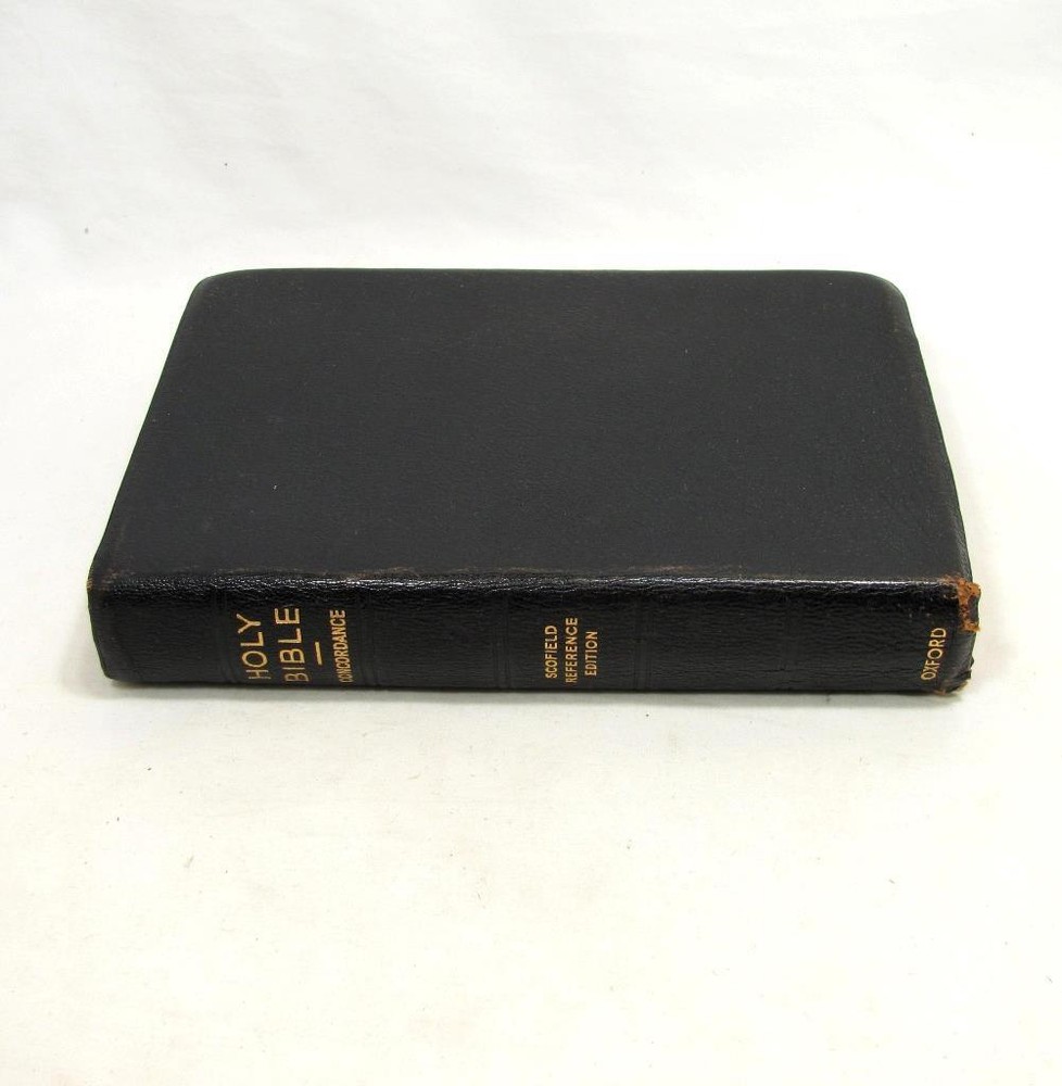 Here is a vintage Holy Bible. This is the Scofield Reference Bible. It was published by Oxford University Press. The copyright is 1945. This is Scofield Facsimile Series No. 1. The inside cover is marked MOROCCO LEATHER LINED SILK SEWED. This has gold guild page edges and 2 sewn in book marks. The Bible measures about 7 1/2" by 5" by 1 1/4". Get this amazing, old Holy Bible! Here is a vintage Holy Bible. This is the Scofield Reference Bible. It was published by Oxford University Press. The copyright is 1945. This is Scofield Facsimile Series No. 1. The inside cover is marked MOROCCO LEATHER LINED SILK SEWED. This has gold guild page edges and 2 sewn in book marks. The Bible measures about 7 1/2" by 5" by 1 1/4". Get this amazing, old Holy Bible! This is used. The covers have wear to the edges and corners. The spine is torn at the bottom edge. There is a dent to the spine, above the SCOFIELD marking. This has wear/loss to the gold guild page edges. This has writing and underlining throughout the Bible. An old owner's name has been written on the first page and family history written on the end pages. The binding is separated at the beginning and end. The book is in solid condition. Please view pictures to see condition. This will ship Media Mail. I combine shipping when possible. Please ask any questions. Please view my other listings! Pictures sell! Auctiva offers Free Image Hosting and Editing. The complete eBay Selling Solution.