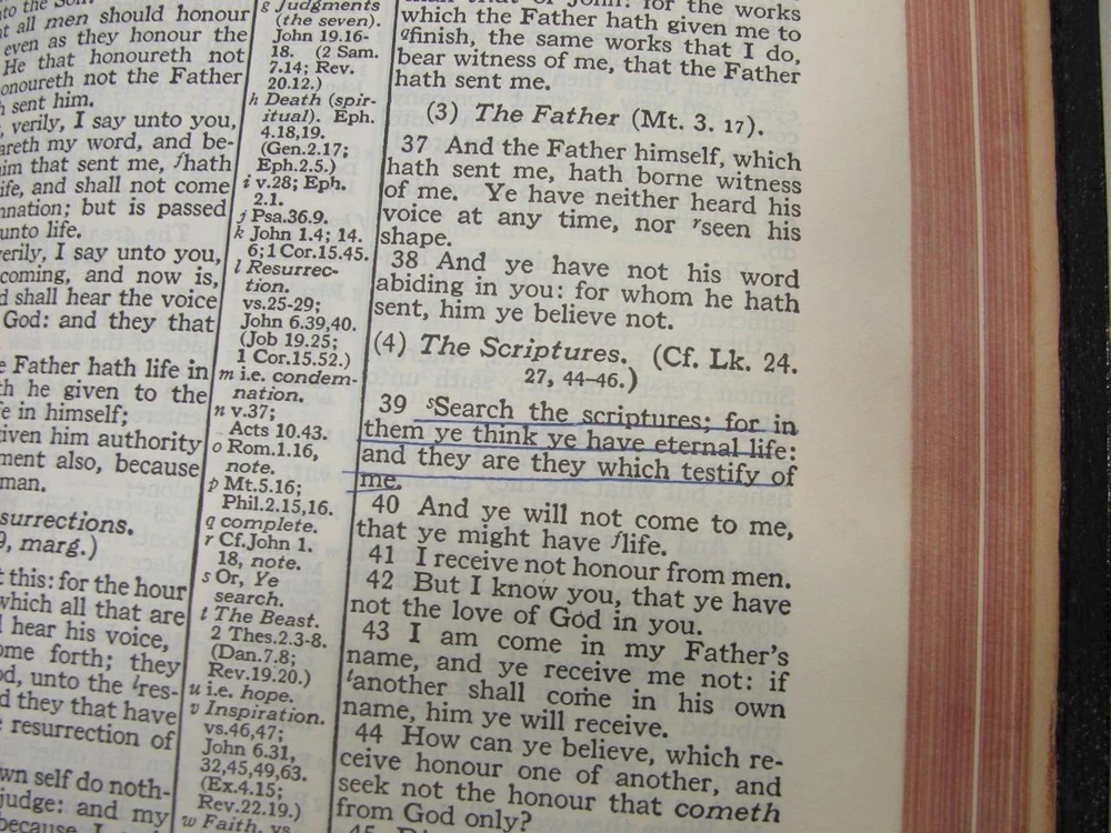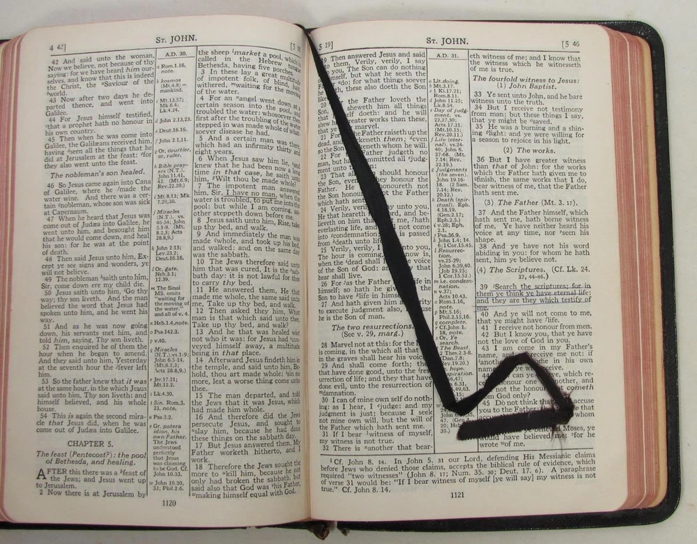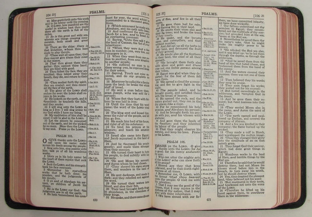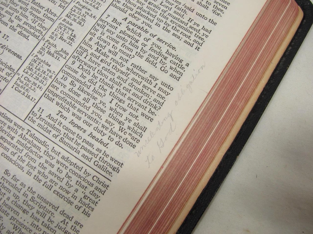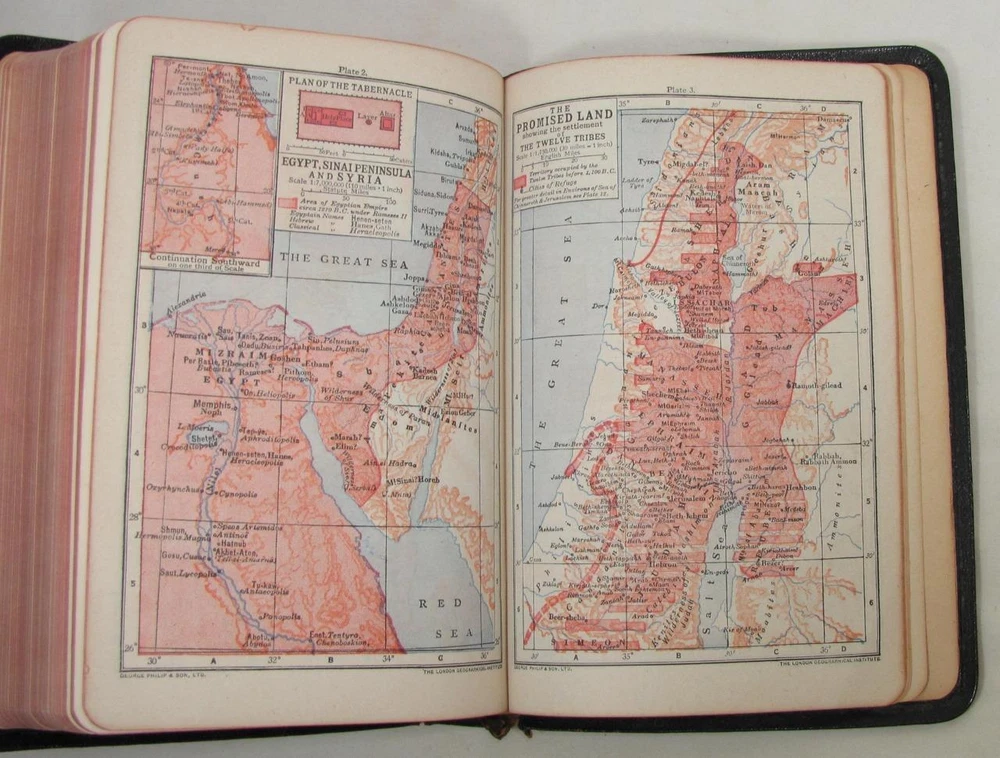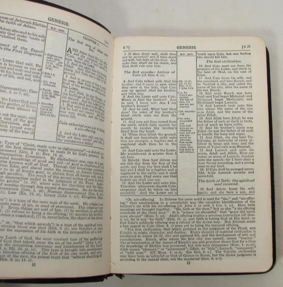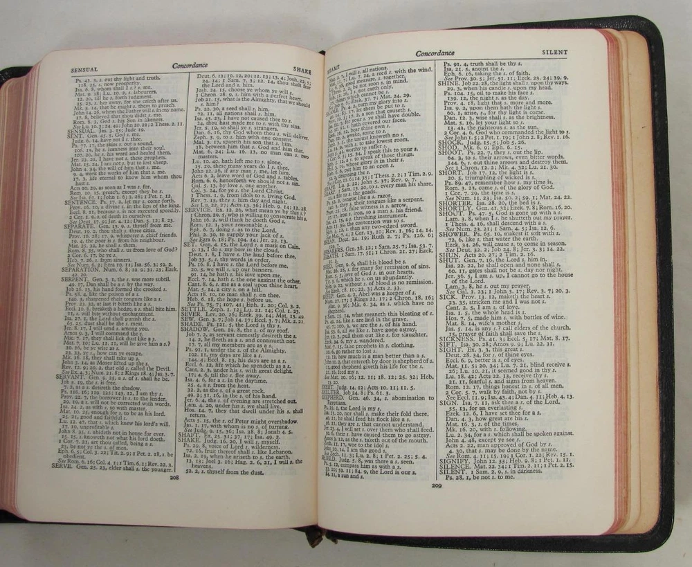 Here is a vintage Holy Bible. This is the Scofield Reference Bible. It was published by Oxford University Press. The copyright is 1945. This is Scofield Facsimile Series No. 1. The inside cover is marked MOROCCO LEATHER LINED SILK SEWED. This has gold guild page edges and 2 sewn in book marks. The Bible measures about 7 1/2" by 5" by 1 1/4". Get this amazing, old Holy Bible! Here is a vintage Holy Bible. This is the Scofield Reference Bible. It was published by Oxford University Press. The copyright is 1945. This is Scofield Facsimile Series No. 1. The inside cover is marked MOROCCO LEATHER LINED SILK SEWED. This has gold guild page edges and 2 sewn in book marks. The Bible measures about 7 1/2" by 5" by 1 1/4". Get this amazing, old Holy Bible! This is used. The covers have wear to the edges and corners. The spine is torn at the bottom edge. There is a dent to the spine, above the SCOFIELD marking. This has wear/loss to the gold guild page edges. This has writing and underlining throughout the Bible. An old owner's name has been written on the first page and family history written on the end pages. The binding is separated at the beginning and end. The book is in solid condition. Please view pictures to see condition. This will ship Media Mail. I combine shipping when possible. Please ask any questions. Please view my other listings! Pictures sell! Auctiva offers Free Image Hosting and Editing. The complete eBay Selling Solution.