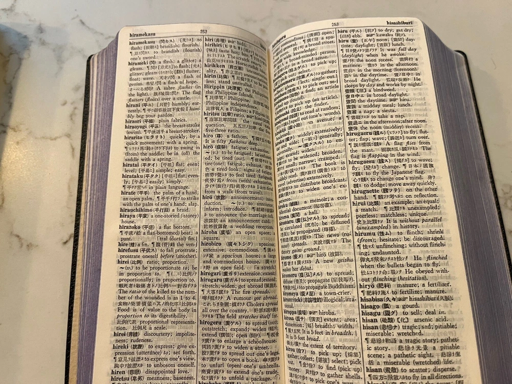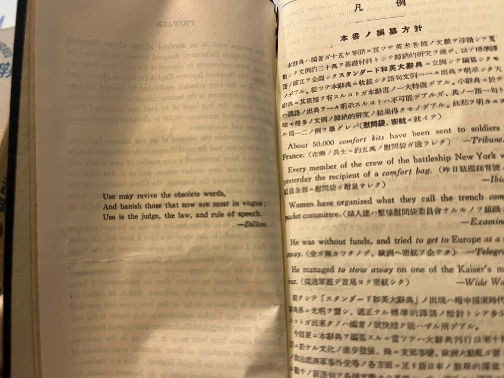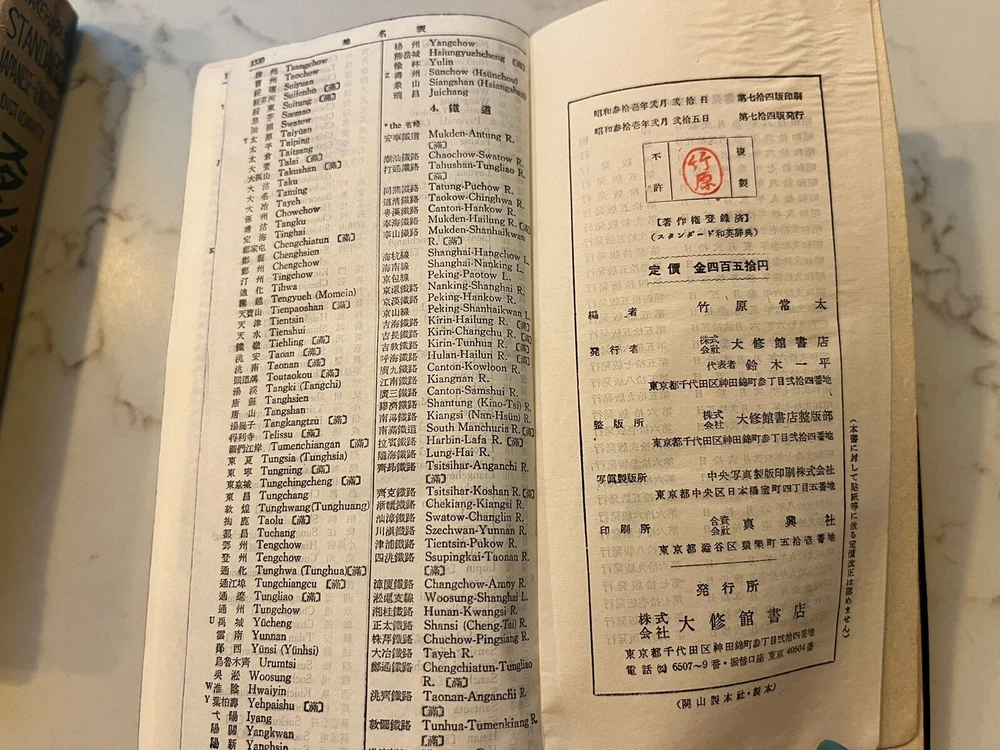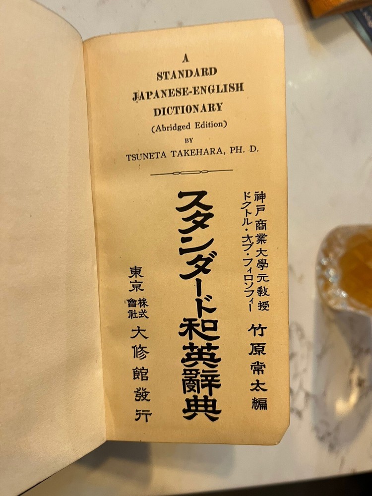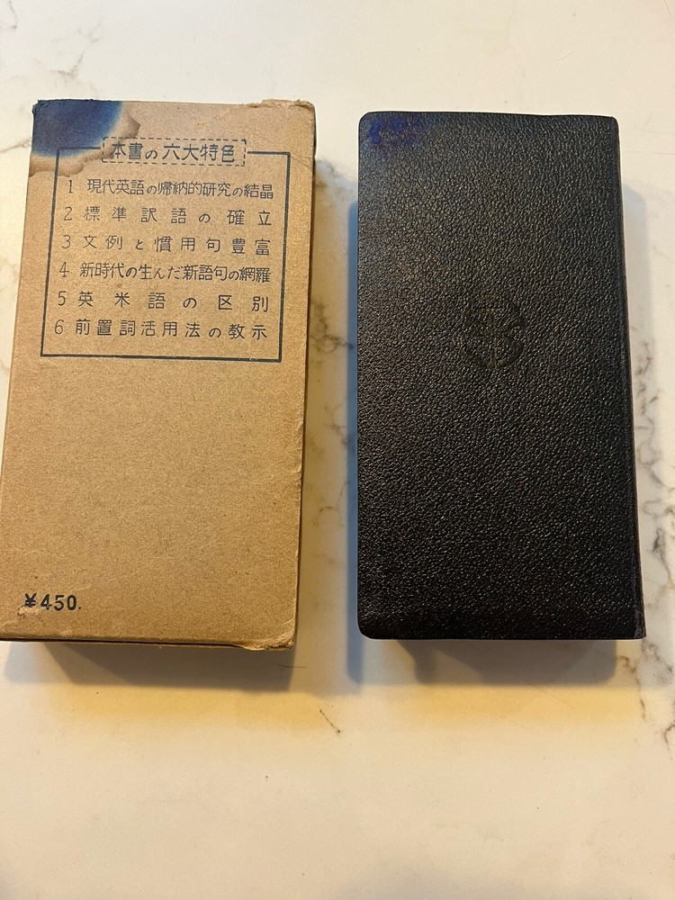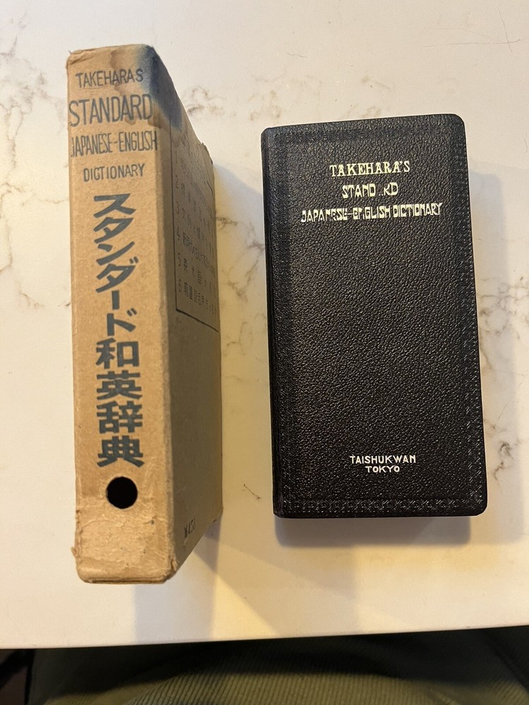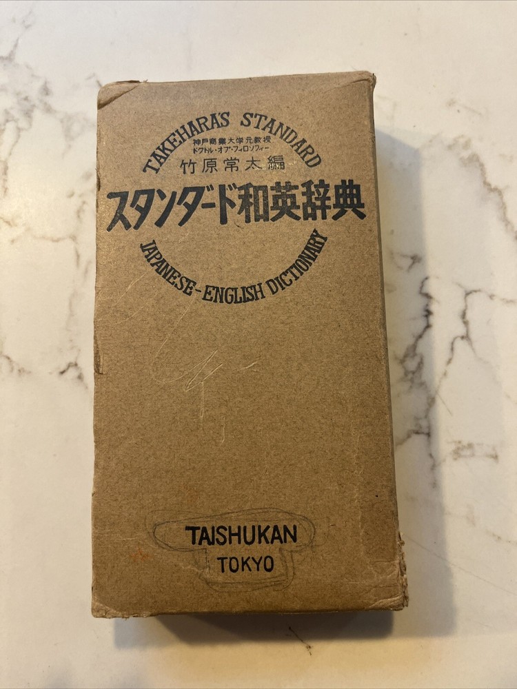 This vintage Japanese dictionary by Takehara's is a must-have for collectors and enthusiasts alike. Standard Japanese-English Dictionary . The dictionary is from the 1950s and was published in Tokyo. It comes in a slip case for added protection and is a great addition to any antique book collection. It measures approx 6 x 3 x 1.25 and has 1332 pages. Black Leather cover in a cardboard slip case. The dictionary is perfect for those interested in Japanese language and it is a rare find for collectors. Very good condition. Fast free shipping.