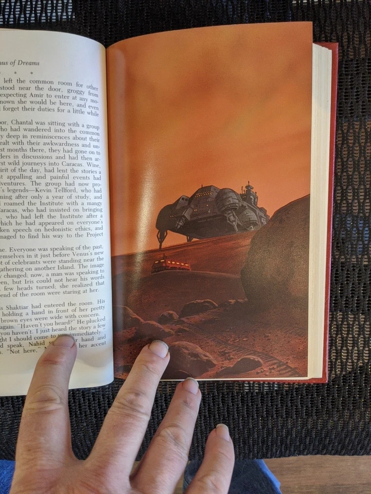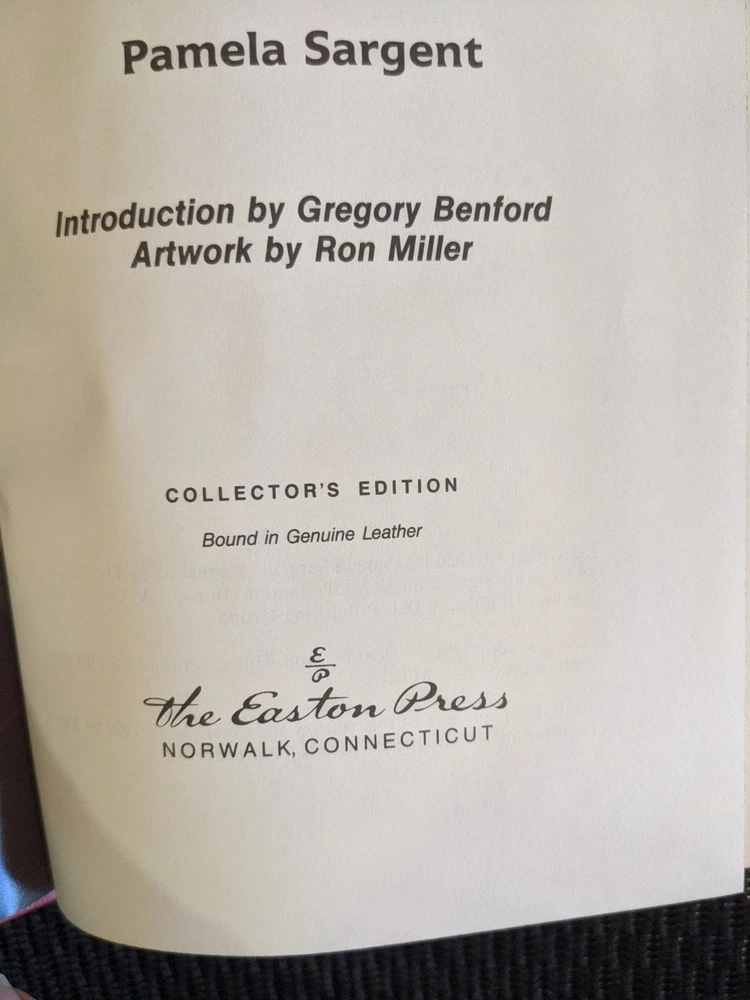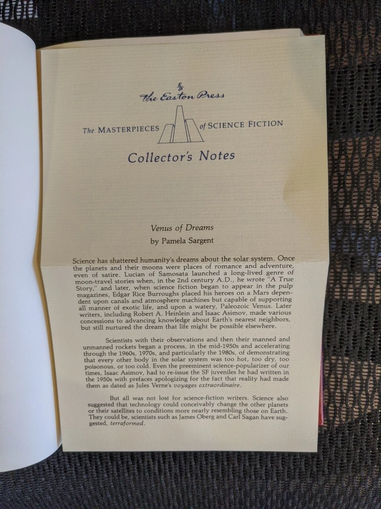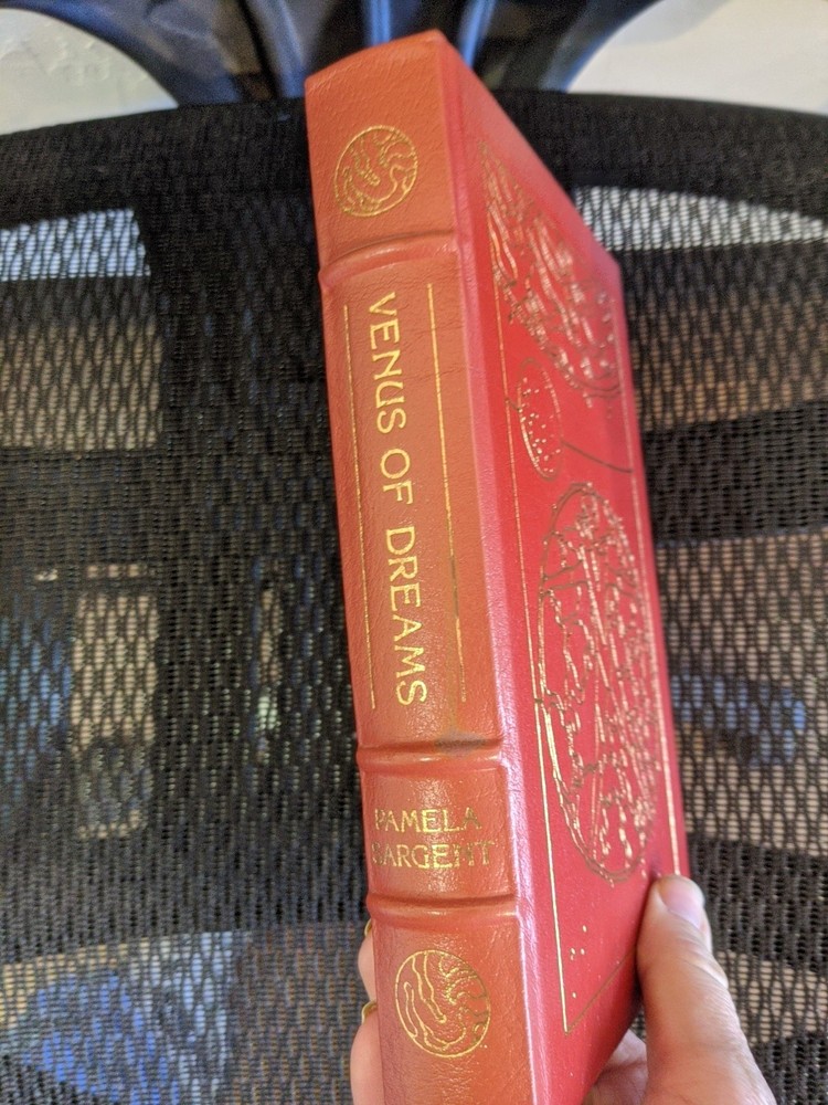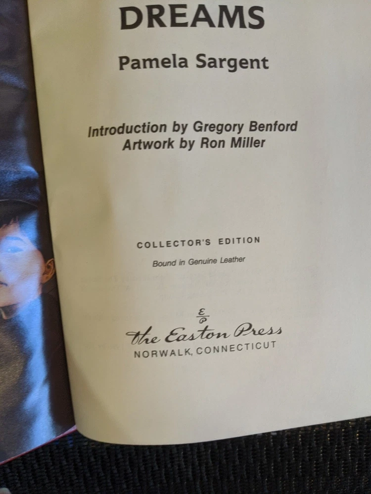 Easton Press Collector's Edition of Venus of Dreams by Pamela Sargent, illustrated by Ron Miller. Published 1990 in Norwalk, Connecticut by Easton Press. Great condition, has a personal library card on the inside cover with no other alterations or damages to the text or illustrations. Hardcover, bound in genuine leather with gilded pages. Includes Easton Press Collector's Note. Like new condition. See photos for condition estimate. An exceptional copy!