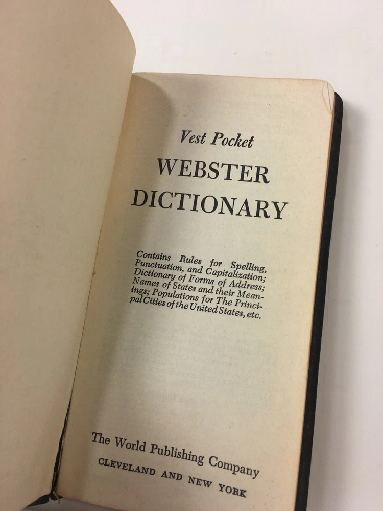Vest Pocket Webster Dictionary Self-Pronouncing Vintage Book 1962 Check our storefront under "about us" for a current COUPON CODE for discount on purchases of multiple items! All items come from smoke free environment. Ships within 1 day of purchase, most shipped same day. Be sure to visit our store for many other items! We are a general store, so you never know what might come in! CLICK HERE and Visit Our eBay Store: Robin's General Store
